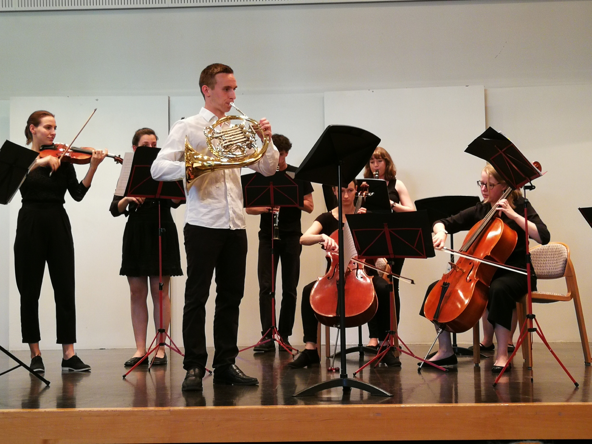 Mit dem Hornkonzert von Mozart erfüllte Yannick Müller die Aula Donnerbaum mit einem warmen Klang am Mittwochabend. Auch er wurde vom JKaBL begleitet, spielte aber auch Solo-Stücke, z.B. „Laudatio“ von Bernhard Krol. Beim Stück „Scherzo-Tarantella“ von Henryk Wieniawski wurden wir von Mirjam Rietmanns Geigenkünsten mitgerissen. Wir bewunderten sehr ihre Ausdauer und Präzision während des Spielens. Tobias Schaub steckte uns in eine Zeitmaschine. Wir durchlebten eine Zeitreise von der Klassik bis zu Jazz und Funk. Das Publikum konnte bei „Moanin & Lullaby of Birdland“ nicht mehr still sitzen bleiben. Alle wippten mit den Köpfen oder Füssen zu den funkigen Rhythmen mit. Diese Begeisterung hörten wir dann auch im Applaus.
