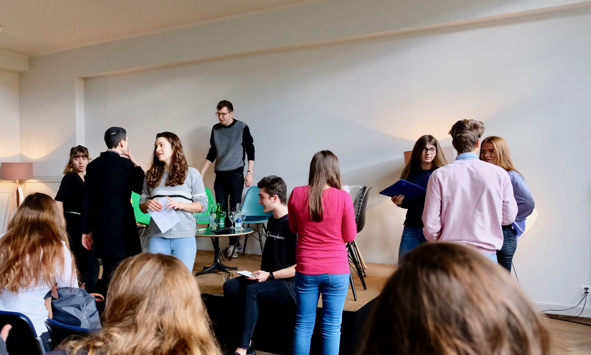 Die F2b hat zwar die Veranstaltung geplant, aber den Autor, mit dem sie das Gespräch führen werden, lernen die Schüler*innen erst jetzt persönlich kennen. Ein bisschen sind also alle nervös, während Ines Siegfried die Mikros testet und die beiden Moderatoren Desirée Thommen und Maurice Jäger ein letztes Mal die Fragen durchgehen.