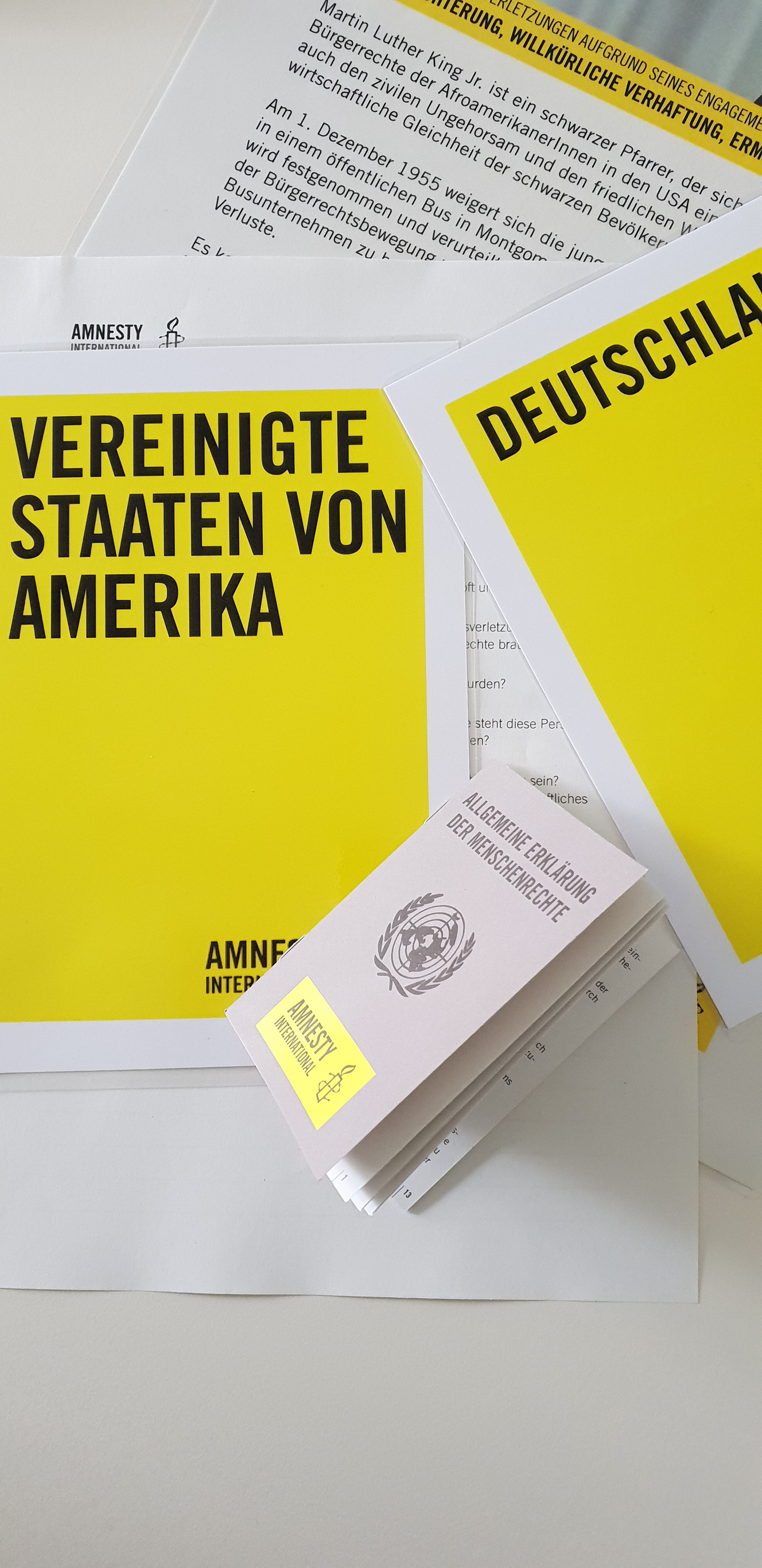 «Auf dem Foto sind zwei gelbe Karten zu sehen, auf welchen der Name eines Landes geschrieben steht. Darauf liegt ein kleines Büchlein: die allgemeine Erklärung der Menschenrechte. In einem Workshop von «Amnesty Schweiz» haben wir untersucht, welche Menschenrechte die verschiedenen Länder jeweils wirklich einhalten – wenn überhaupt! Der definitiv spannende Tag hat uns dazu inspiriert, uns stets für die Menschenrechte einzusetzen.»