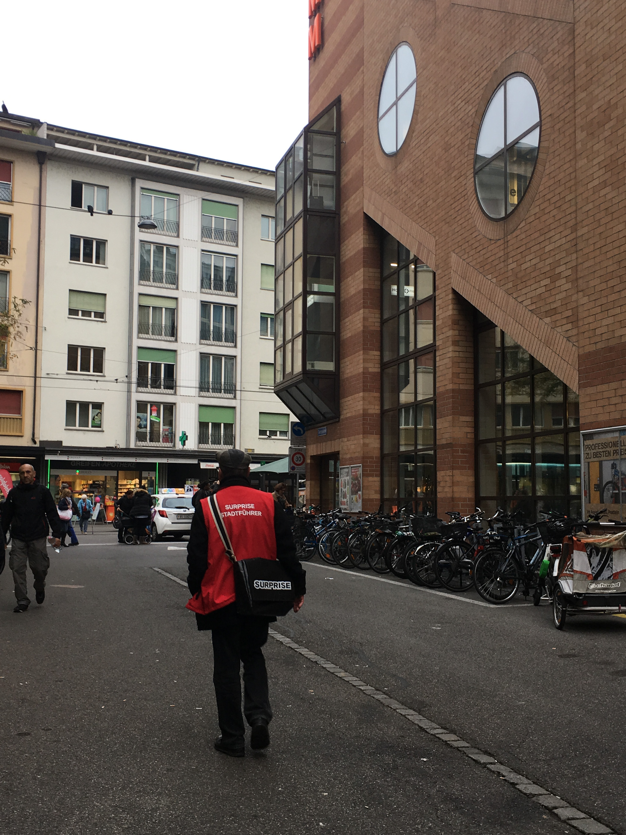 «Wir erlebten die «etwas andere Stadttour» in Basel, durchgeführt vom Verein «Surprise». Ein ehemaliger obdachloser Mann ermöglichte uns einen Einblick in das Leben von Randständigen. Wir sahen die Notschlafstelle, das Männerhaus, die Gassenküche, die man hier auf dem Bild sehen kann, und noch vieles mehr. Durch diese Tour haben wir Basel von einer Seite kennengelernt, die uns bisher vollkommen verborgen war.»