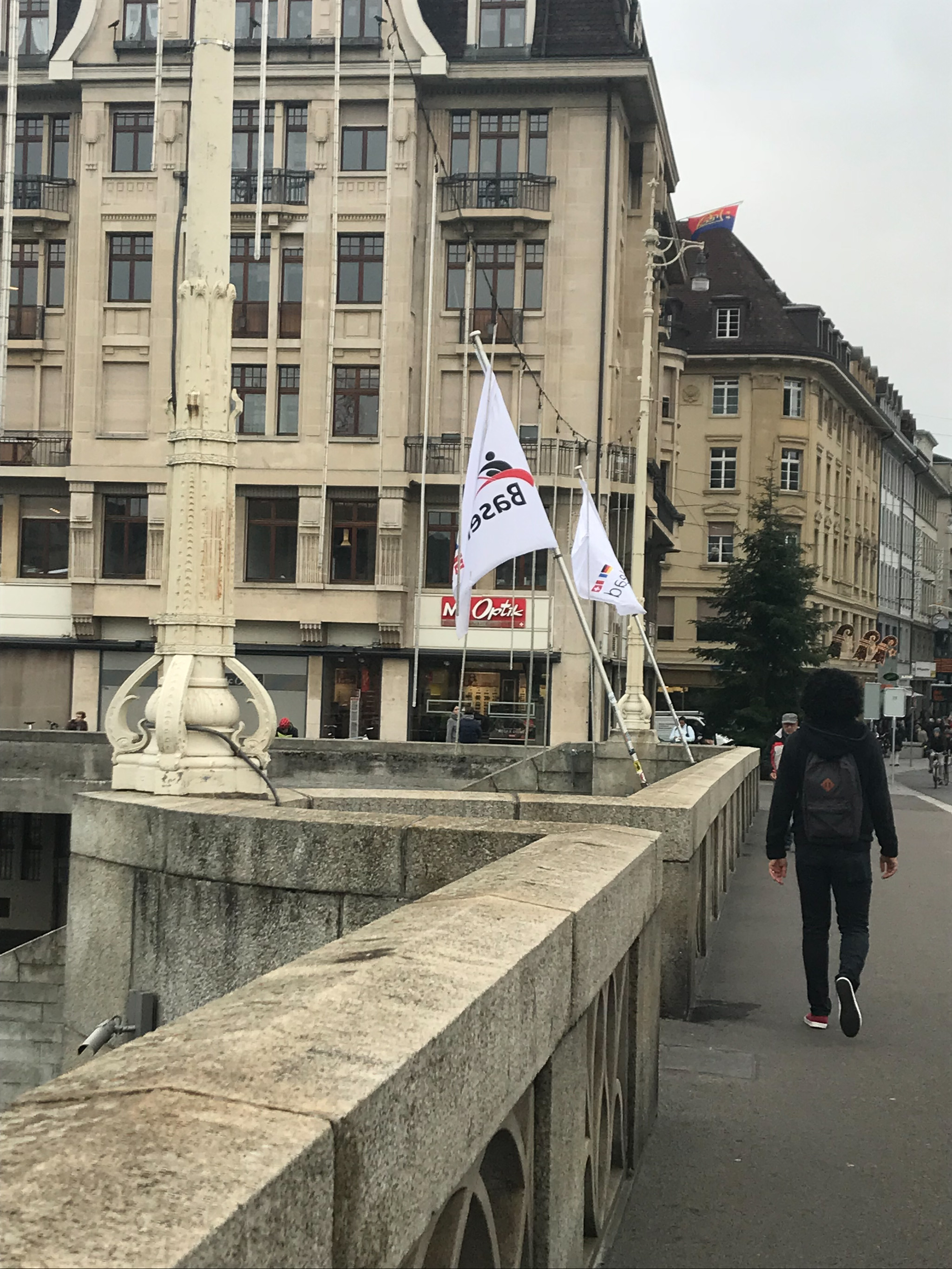 «Das Bild zeigt, wie uns Rstam Aloush, der ursprünglich aus Aleppo in Syrien stammt, durch «sein Basel» führt. Hier befinden wir uns auf der Mittleren Brücke auf dem Weg zur Matthäuskirche. In der Nähe der Kaserne erzählt uns Rstam von den kulturellen Unterschieden zwischen Syrern und Schweizern, Schweizerinnen und Syrerinnen. Er spricht die eher verschlossene Art, die Pünktlichkeit und die mangelnde Spontaneität an, die man Schweizerinnen und Schweizern oft nachsagt. Vor dem Krieg sei das in Syrien ganz anders gewesen: «Man konnte problemlos spontan etwas mit Freunden und Kollegen abmachen. Hier in der Schweiz muss man zuerst den Terminkalender konsultieren und so geht es oft Tage oder Wochen, bis es möglich ist, sich zu treffen.» Dies sei auch ein Grund, warum es vielen Migranten und Migrantinnen schwerfalle, sich zu integrieren, meint Rstam.»