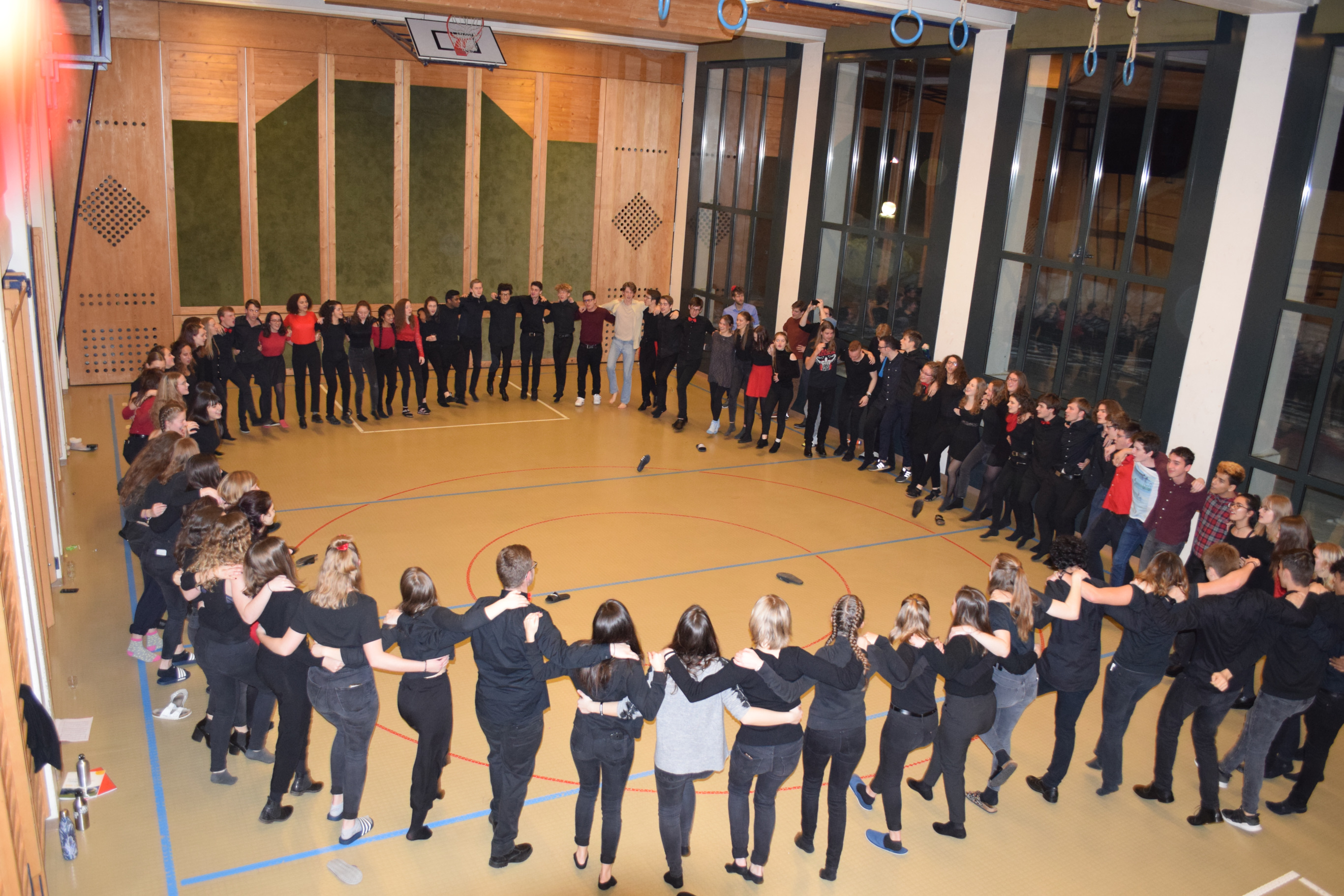 Bis spät in die Nacht gingen die Festlichkeiten und die waghalsigen Sprünge der Artisten. Zum Glück gab es da noch die gute Fee Denise mit ihrer Zauberarznei, den Emserpastillen, die nach dieser turbulenten Nacht manch eine heisere Stimme retteten. Zur Stärkung für das Konzert am frühen Abend schlugen sich alle Sängerinnen und Sänger an der Festtafel den Bauch voll. Stundenlang hatten der Koch und sein Gefolge an den belegten Brötchen fleissig gearbeitet, welche dann avanti aufgegessen wurden. Der Tag neigte sich dem Ende zu, und auch das Konzert war vorüber. Es war ein voller Erfolg gewesen. Alle Dorfbewohnerinnen und Dorfbewohner waren glücklich wieder nach Hause gegangen, und die ganzen anfänglichen Sorgen wegen dem Schneeungeheuer waren in der freudigen Stimmung schon längst vergessen. Doch die Stunde der Wahrheit war nun angebrochen. Das grosse Turnier stand bevor. Es galt den Gegner zu besiegen, indem man den Ball in den Korb der gegnerischen Mannschaft spielte. Die grosse Schwierigkeit dabei war, dass jedem die Augen mit einem Kissen verbunden wurden. Aber alle dachten sich leise: “Maybe if perhaps we might possibly try. And we did and it was difficult.” Doch auch mit einigen Unfällen und Zwischenfällen schien der Wettkampf viel Freude zu bereiten. Und so kam es zum ersten Mal seit vielen Jahren zu einem legendären Unentschieden zwischen der Männer- und der Frauenmannschaft. Auch in diesem Chorlager hatten viele gemeinsame Stunden für ein schönes Zusammenwachsen gesorgt. Und wenn die Chorsänger bis dann nicht ihren Schulabschluss gefeiert haben, dann finden sie im nächsten Jahr wieder den Weg nach Obergesteln.