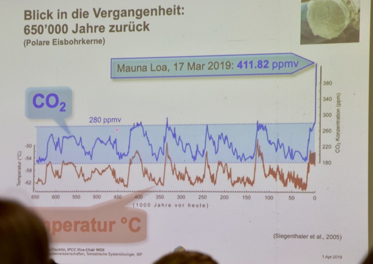 Im anschliessenden Gespräch wird deutlich, dass die Erkenntnisse und Einsichten aus dem Klimagarten sensibilisieren. Gleichzeitig gibt es jetzt schon dringenden Bedarf, über konkrete Massnahmen zu diskutieren, wie wir den Klimawandeln eindämmen können. Denn auch das ist Hoffnung. Eine wichtige Hoffnung daher, weil es zwar viele Ideen gibt – wie die Idee, weniger Plastikabfall zu produzieren – die Umsetzung bisher aber noch sehr dürftig ist. Wir sollten jetzt schnell damit anfangen, die Emissionen von fossilen Brennstoffen zu stoppen und mit Alternativen zu beginnen. Noch ist es nicht zu spät, eine Wandlung jedoch erfordert den Einsatz eines jeden Einzelnen. Dies sagt ganz klar Andreas Fischlin, Professor für Terristrische Systemökologie der ETH, der am 1. April 2019 an der HSR Rapperswil das öffentliche Experiment «Klimagarten 2085» eröffnet hat.