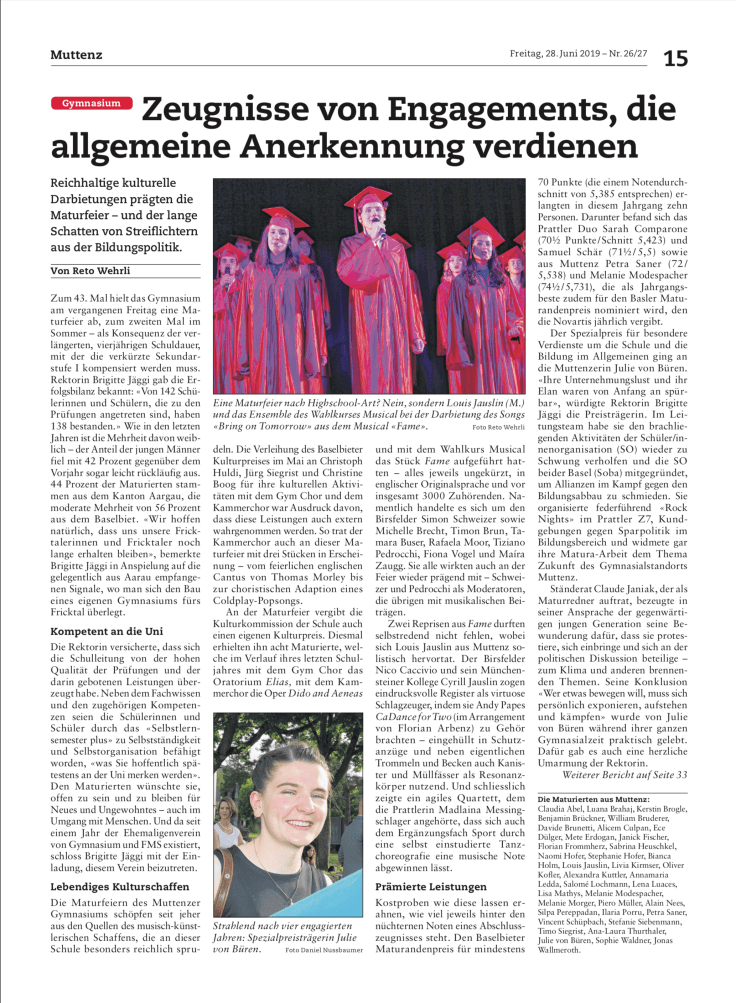 Auch dieses Jahr zeichnete Brigitte Jäggi die Besten des Jahrgangs mit dem Baselbieter Maturandenpreis aus, der verliehen wird ab einem Notenschnitt von 5.4 im Abschlusszeugnis. Diesen und noch höhere Schnitte erzielten in mathematisch aufsteigender Folge:Maíra Zaugg, Corina Schüpbach, Sarah Müller, Sarah Comparone, Carla Kunz, Samuel Schär, Petra Saner, Anja Hunziker, Cedric Wenger und Melanie Modespacher. Letztere erhält zusätzlich den Basler Maturandenpreis der Novartis 2019.