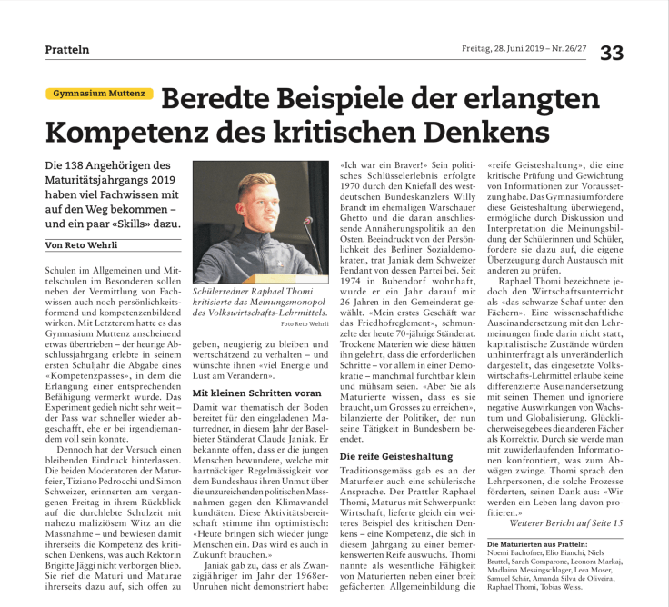 Gleichsam als fordernde Antwort der Jugend auf die Abgeklärtheit des Alters kam Raphael Thomis Maturrede daher. Raphael lobte den Anspruch des Gymnasiums, wissenschaftlich zu arbeiten und fundiertes Wissen zu vermitteln. Es biete den Jugendlichen eine vielfältige Bildung, welche die Probleme der Welt aus verschiedenen Perspektiven und Fächern wissenschaftlich analysiere. Dann jedoch setzte er zu einem Angriff an. Das Fach Wirtschaft und Recht – darin insbesondere die Volkswirtschaftslehre – sei pure neoliberale Propaganda. Sämtliche negativen Konsequenzen des Kapitalismus würden konsequent ausgeblendet: „Weder der Klimawandel noch die voranschreitende Umweltzerstörung werden im Kapitel zur Globalisierung in unserem VWL-Buch auch nur mit einem Wort erwähnt.“ Zum Glück würden Themen wie die Ausbeutung von Mensch, Tier und Natur in den anderen Fächern differenziert behandelt. Interdisziplinäre Widersprüche könnten zwar für Verwirrung sorgen. Im Idealfall würden sie jedoch zu einer ganzheitlichen Betrachtung führen und eine reife, fundierte Meinungsbildung ermöglichen.