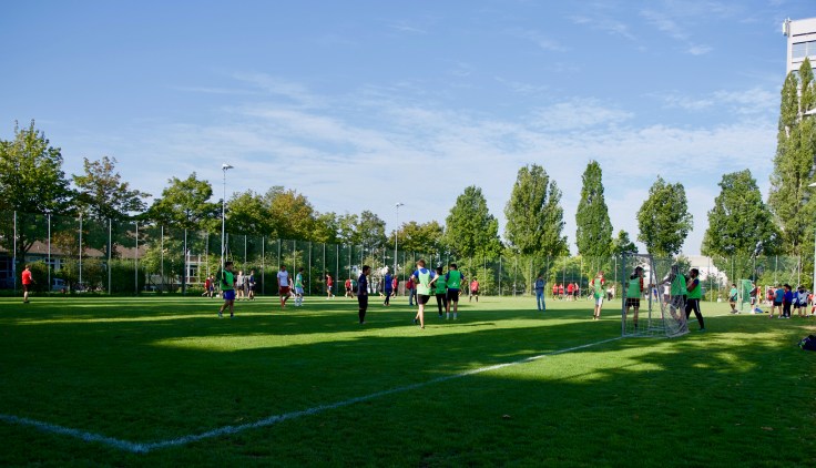Im Verlauf des Vormittags wird es etwas wärmer. Die Sonne scheint und immer mehr unserer Schülerinnen und Schüler rennen und toben über die Sportfelder. Jetzt ist hier also was los!