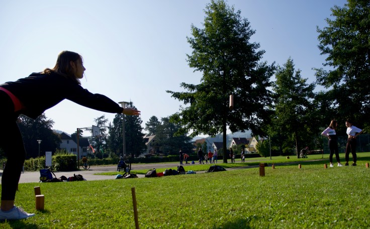 Im Holderstüdeli-Park geht es beim Kubb eher gemütlich zu. Hier ist es auch schon ordentlich warm.