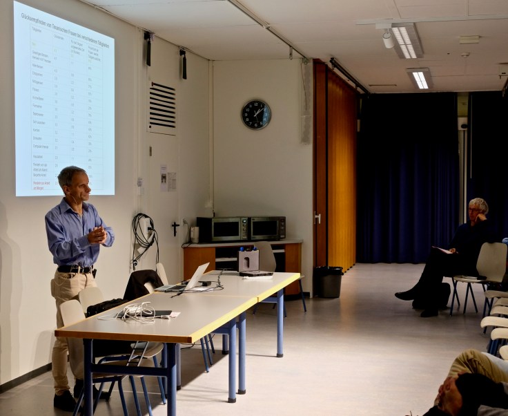 Die Suche nach Glück ist also eine komplexe Sache: Das moderne Familienleben mit Kindern und doppeltem Einkommen führt zu mehr Stress und man hat kaum Zeit, das viele erwirtschaftete Geld zu geniessen, wie Binswanger im Anschluss an seinen Vortrag auf eine Frage aus dem Publikum antwortet. Aber bei allen Pardoxa der Glückserreichung: Der Vortrag hat sehr schön gezeigt, wie die ökonomische Glücksforschung funktioniert. Und Binswanger hatte am Schluss ein paar Hinweise darauf, was wir machen können für unser alltägliches Glück.