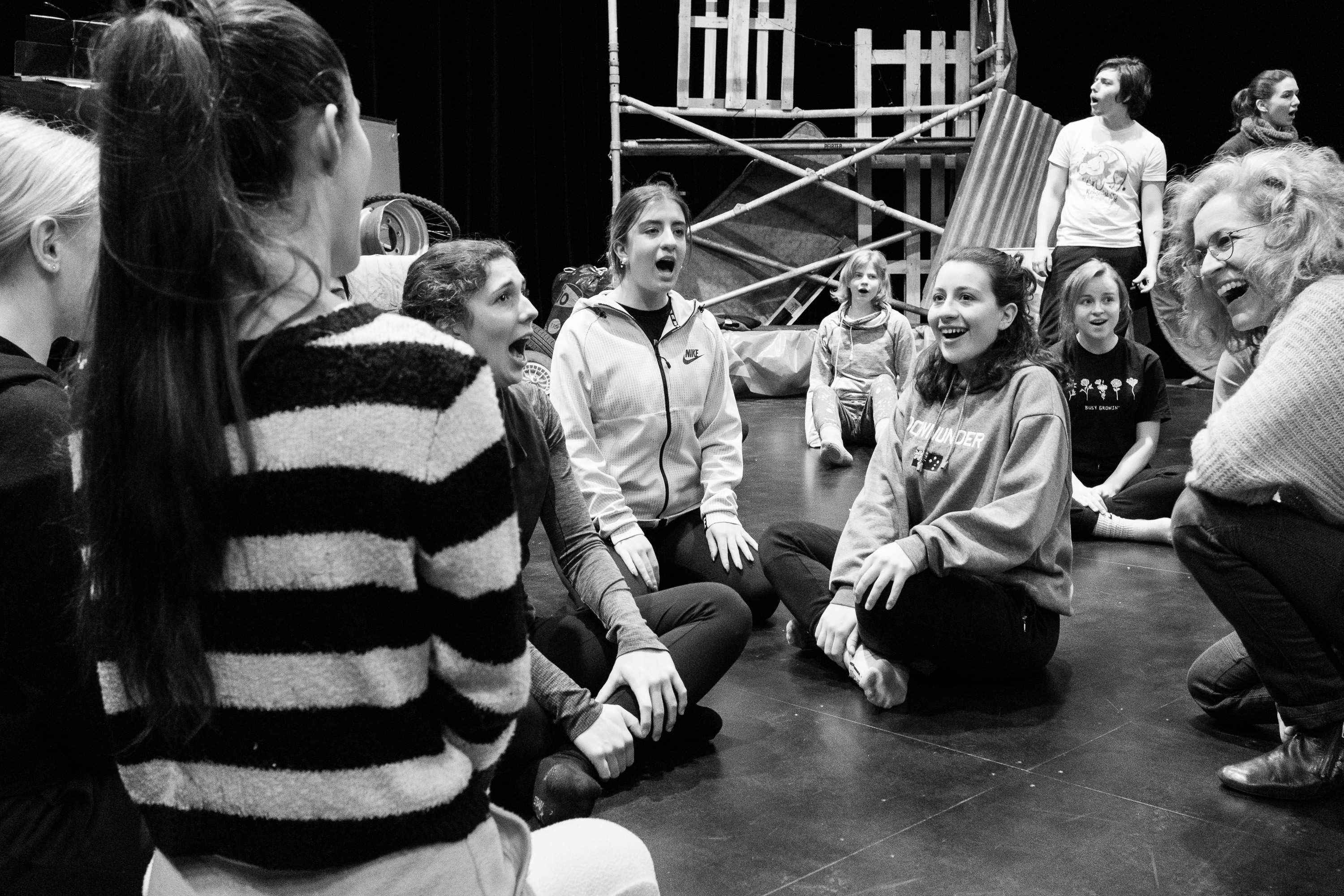 Und dann ist plötzlich Freitag, der 14. Februar. Der Beginn unserer Intensiv-Probewoche im Theater Roxy in Birsfelden. Innerhalb weniger Stunden wird von unserer Bühnenbildgruppe das Bühnenbild aufgebaut. Als wir dieses am nächsten Morgen zu sehen bekommen, können wir die Münder gar nicht mehr schliessen. Beinahe ausschliesslich aus Müll und hauseigenem Schlamm haben sie unsere Rattenwelt kreiert und unsere Motivation auf ein neues Maximum steigen lassen. Von diesem Moment an geben wir 200 Prozent. Unser Techniker Lukas und Ms K arbeiten bis in die Morgenstunden an der Programmierung des Lichts. Dabei dient unser Rattennest sogar zwei Mal als Schlafplatz für Ms K. Auch für uns wird in dieser Woche das Roxy ein Zuhause. In jeder freien Minute schlafen wir. Überall. Unter der Bühne, auf der Bühne, auf Stühlen, in Schlafsäcken, auf ISO-Matten. Wenn wir in den Pausen gerade nicht schlafen, tanzen wir zu Lukas‘ DJ-Einlagen, entspannen unsere Stimmbänder mit Blubberschläuchen oder feiern am Sonntag gemeinsam Laras Geburtstag, mitsamt Mami und Papi und von uns mitgebrachtem Essen.