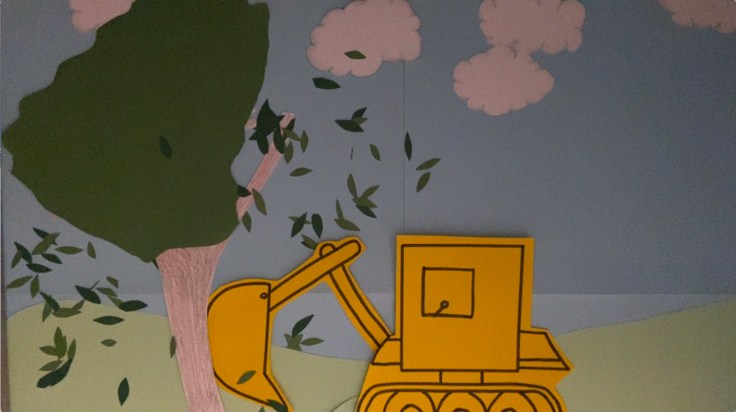 Wir erarbeiteten einen Trickfilm über die Rodung. Die Blätter wehen im Wind. Der Himmel ist blau mit wenig Wolken, als plötzlich ein Bagger kommt und alle Bäume zu fällen beginnt. Das Landschaftsbild nimmt jetzt eine drastische Wendung.