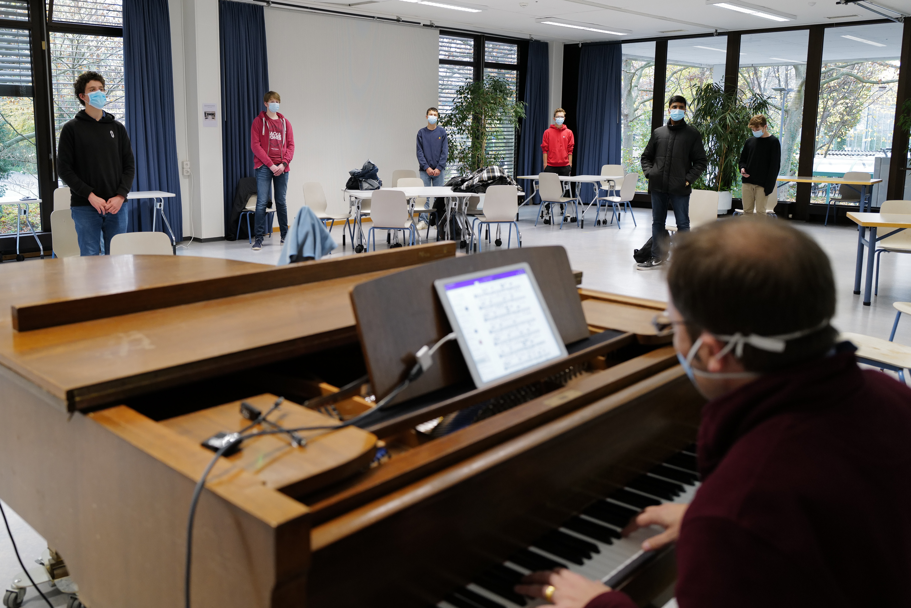 Besonders einschneidend für viele Vereine ist das gesamtschweizerische Chorverbot, das vor mehr als einer Woche erlassen wurde. Viele Kantone haben daraufhin das Gruppensingen ab dem jungen Erwachsenenalter oder gar vollständig auf ihrem Hoheitsgebiet verboten. Darunter gehört auch der Kanton Baselstadt, wo renommierte Chorschulen praktisch nicht mehr proben dürfen. Laut der Bundesverordnung gibt es einen einzigen Bereich, in dem gemeinsames Singen zur Zeit noch erlaubt ist: im Klassenverband an Schulen. Daher ist es laut dem neusten Szenario im Kanton Baselland am Gymnasium Muttenz immer noch erlaubt, im Klassenverband zu singen. Dabei muss ein Abstand von 2.5 Metern eingehalten werden, und es müssen zwingend Masken getragen werden. Macht unter solch schwierigen Umständen das gemeinsame Singen überhaupt noch Sinn? Genau das probieren wir zur Zeit am Gymnasium Muttenz aus. Mit Unterstützung der Schulleitung nutzen wir schon seit längerer Zeit regelmässig grosse Räume, um das gemeinsame Singen unter sicheren Umständen doch noch zu gewährleisten. Die Verunsicherung der Schülerschaft ist auf Grund des Chorverbots recht gross und mittlerweile gibt es Klassen, die das Singen vor Ort lieber ganz weglassen würden. Trotzdem versuchen wir als Musiklehrpersonen von der Möglichkeit des gemeinsamen Singens, so gut es eben geht, immer noch regelmässig Gebrauch zu machen. So haben wir es bisher häufig geschafft, das Schulhaus mit Klängen des Gesangs zu erfüllen. Wenn wir nämlich im Foyer im Erdgeschoss singen, ist unser Gesang laut Ohrenzeugen fast im ganzen Schulhaus des Gymnasiums durch die offenen und gut durchlüfteten Zimmer des Gebäudes hörbar; „the falling leaves drift by my window…“ klingt dann von Ferne in allen Ohren. In Zeiten des immer stärker werdenden Rückzugs hat das gemäss einigen Kolleginnen und Kollegen durchaus etwas Wohltuendes. Der Klang der menschlichen Stimme vermag uns für kurze Momente zu entrücken und erfüllt das ganze Schulhaus fast wundersam mit akustischen Klangfarben. Blätter werden aus hygienischen Gründen in diesen Singsequenzen keine verteilt. Der Notentext wird direkt vom Pad via Beamer eingeblendet. Wenn gewisse Schülerinnen und Schüler zu wenig nach vorne sehen, können sie auch per Smartphone direkt auf den Notentext zugreifen. Eine interessante Kombination, in der das Handy plötzlich zum Arbeitsinstrument wird. Zugegeben: Es braucht etwas Überwindung, unter diesen widrigen Umständen trotzdem noch zu singen. Jedesmal wenn es soweit kommt, ist dann doch erstaunlich, wie schnell sich eine intensive Zufriedenheit darin einstellt, sich in Zeiten von „Lockkdowns“ und „Social Distancings“ beim Singen als Teil einer Gemeinschaft zu hören, spüren und zu sehen. Auch wenn ein strenger Winter angesagt ist, die Blätter fallen und alles in Schwebe scheint, säen wir jetzt schon hoffnungsvoll die Samen für das nächste Frühjahr. Deshalb singen wir weiter, so gut es geht. Gut geschützt dem Virus zum Trotz.