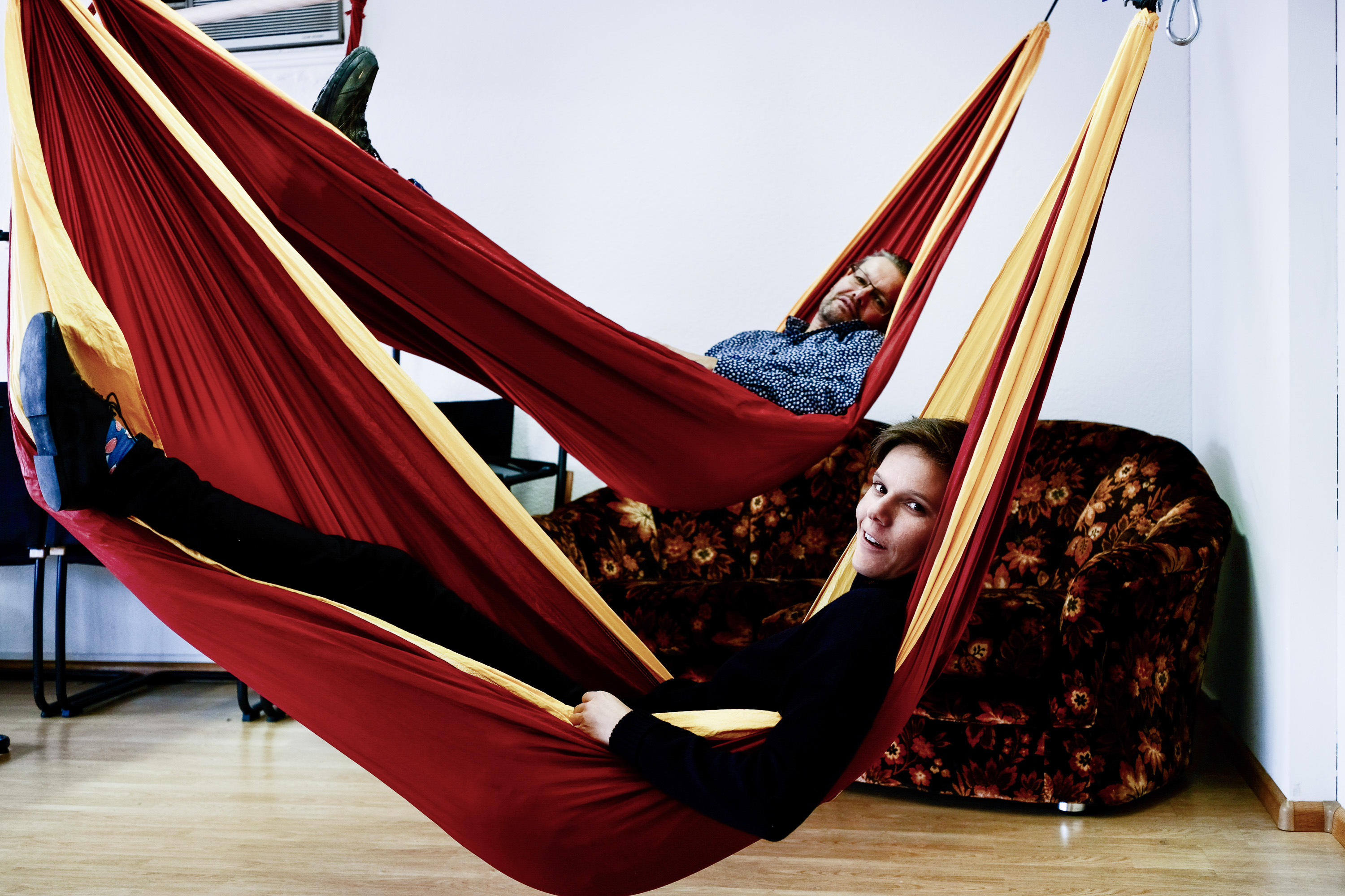 Und diese Workshops finden in den verwinkelten Räumlichkeiten statt, in denen wir unser Gespräch führen. Neben dem Veranstaltungsraum liegen zwei Schreibräume. Hier können die Jugendlichen arbeiten. Der «helle Raum» ist ganz in Weiss gehalten, von der Decke hängen Papierkugellampen. Ein Megafon ist mit der lauten Seite auf der Fensterscheibe angebracht und schaut nach draussen. Im Rahmen eines digitalen Rundgangs ertönt daraus die Klangspur eines Postens durch die Scheibe auf die Strasse. Im «Harry Potter-Raum» steht eine Schreibmaschine mit Typenstäben auf einem alten Tisch, die Wände sind in dunklem Bordeaux-Rot gehalten und treffen auf einen hölzernen Boden. Wir führen unser Gespräch in der Wohnküche, in einer Ecke hängen mehrere rot-gelbe Hängematten. Hier also entstehen Geschichten, Hörspiele, Cartoons, Slam-Texte.