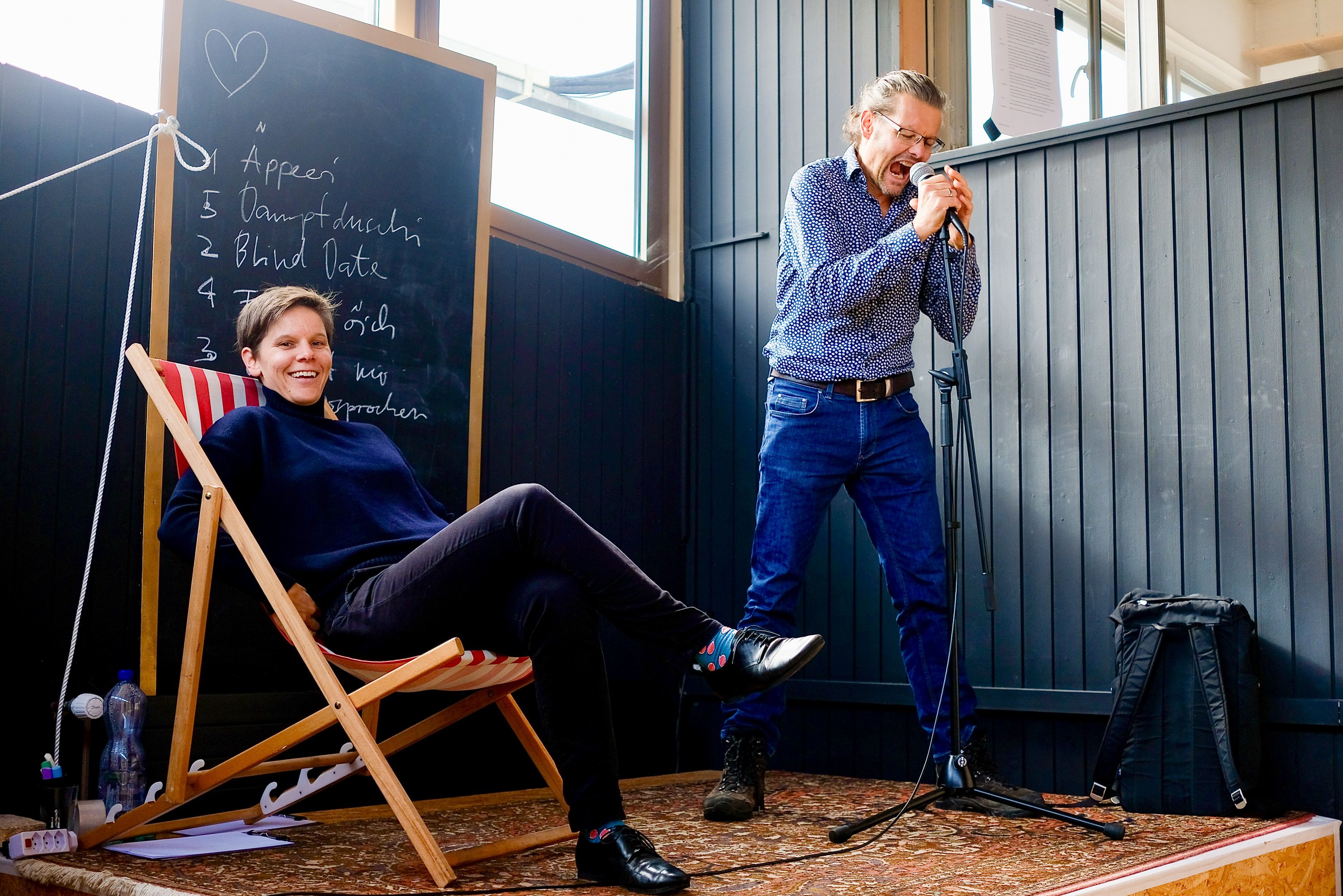Doch im Inneren dieser Halle empfängt mich eine ganz andere Welt. Als ich mit Hannes Veraguth und Daniela Dill die Räumlichkeiten des WORTSTELLWERKs betrete, stehen wir in einem kleinen Bühnenraum. Die Fenster bilden eine schmale, durchgehende Reihe direkt unter der Decke und erhellen den Raum von oben. Eine selbst gebaute Bühne aus Paletten wird von einem alten Teppich bedeckt, auf dem ein Mikrofon steht. Eine Tafel dient dazu, die Namen der Auftretenden oder das Programm des Abends anzuschreiben. Gegenüber der Bühne stehen Sitzkisten aus Sperrholz an der Wand, auf denen bunte Stoffkissen liegen. Hier werden die Texte präsentiert, die in den Workshops im WORTSTELLWERK entstehen.