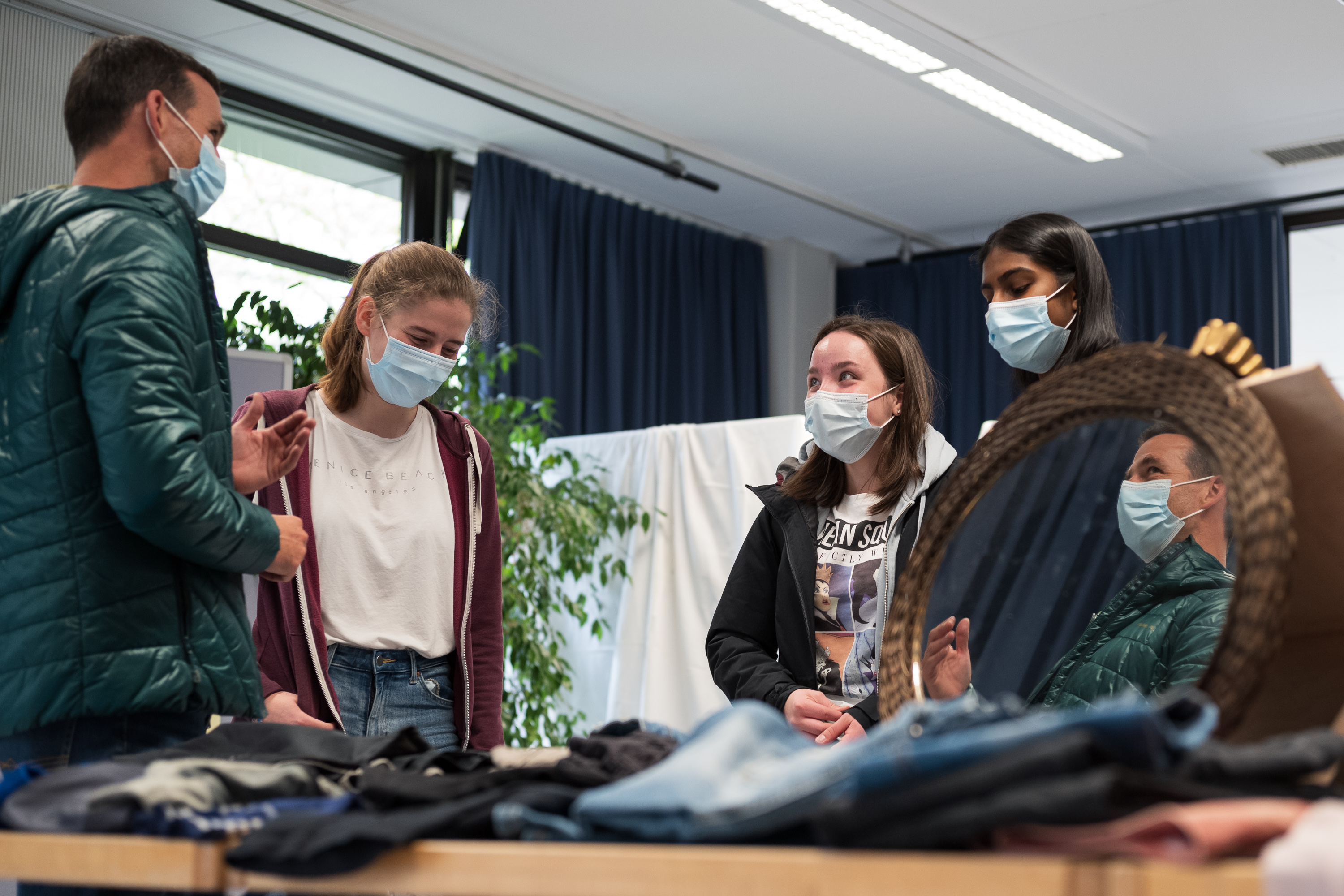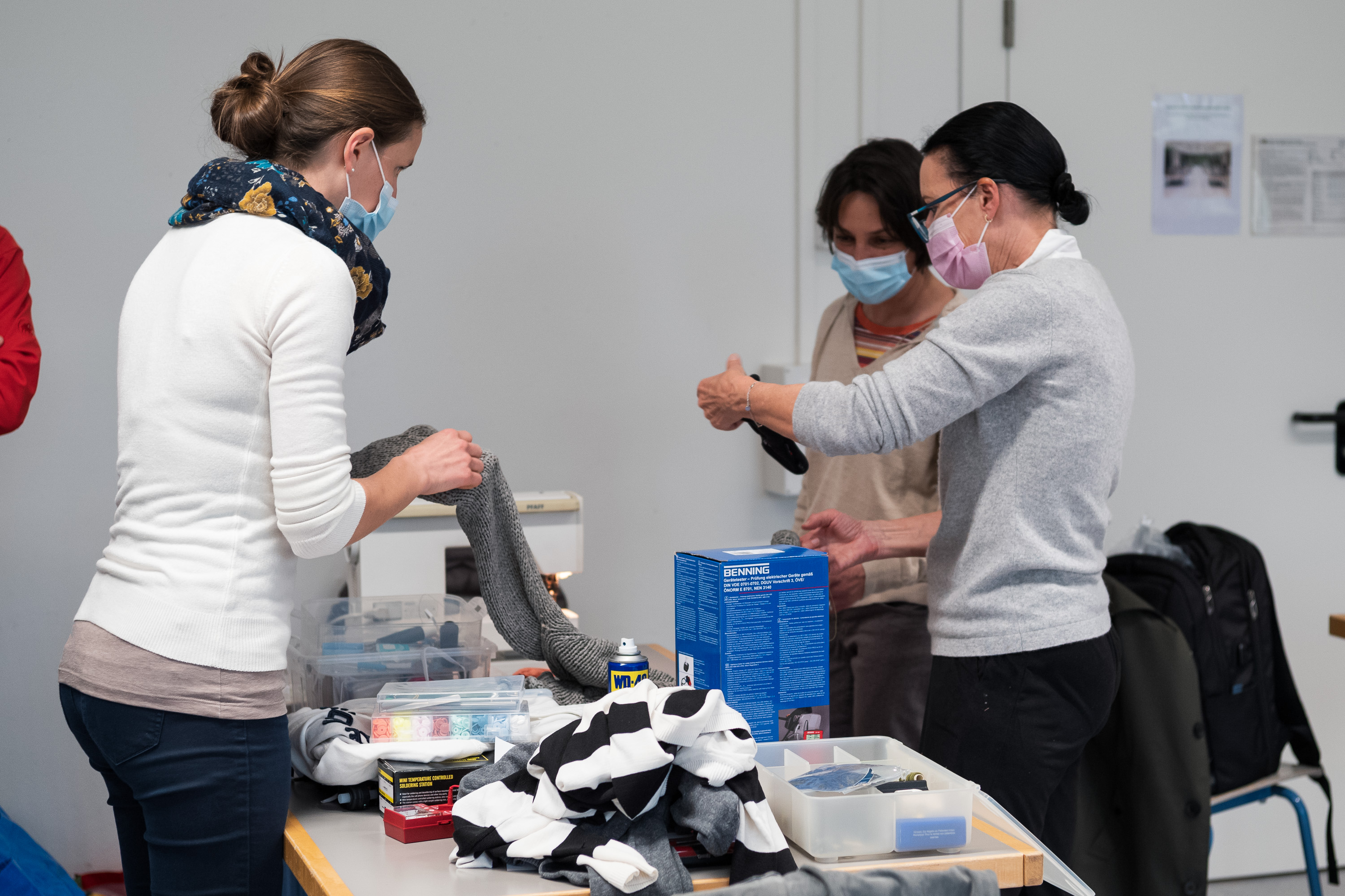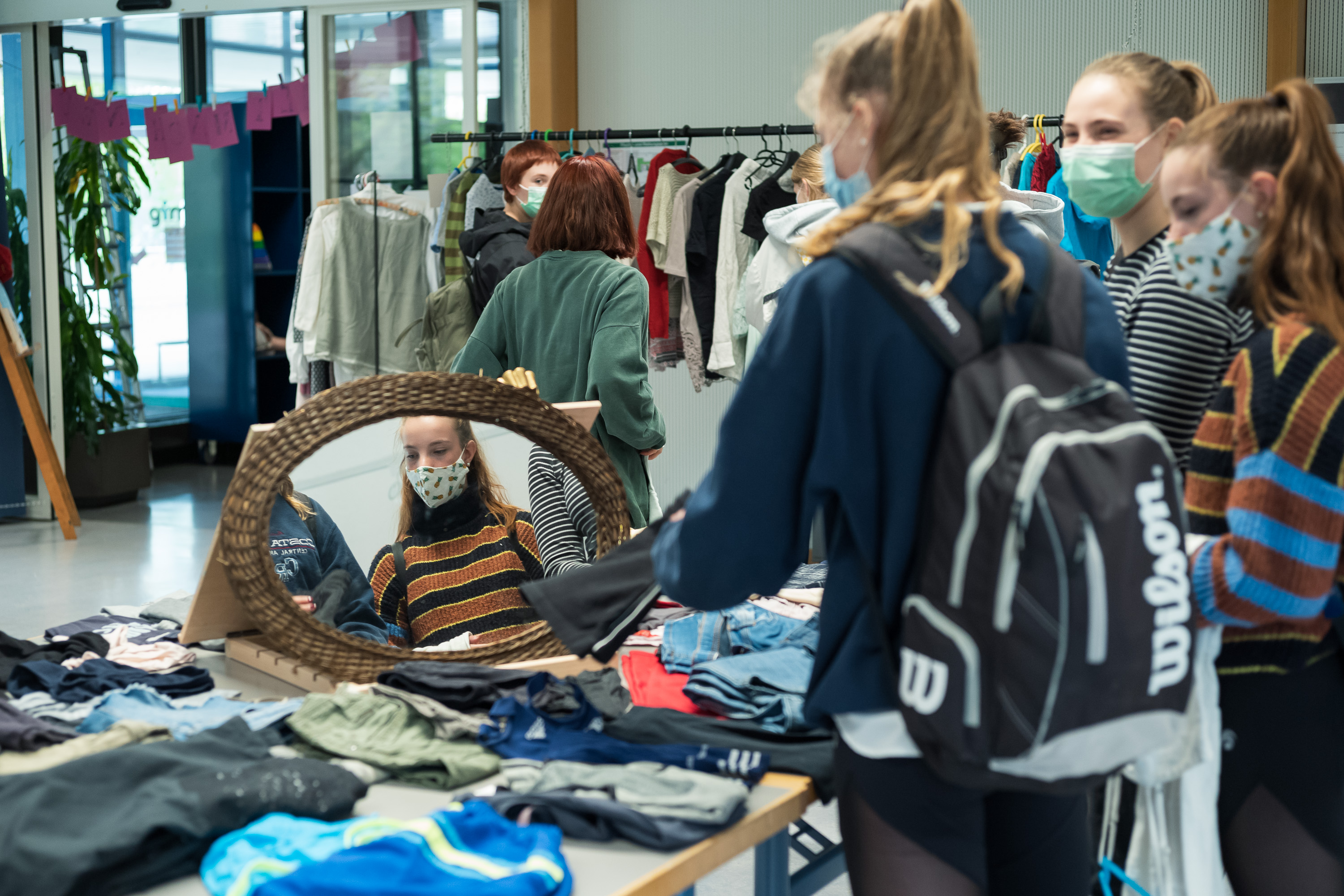 Mit viel Hingabe sortierten einige Schülerinnen und Schüler aus der Nachhaltigkeitsgruppe des Gymnasium Muttenz (Leoni Brogli, Saskia Clauwaert und Nicolas Hunziker aus der 3BM, Kerim Halitoglu aus der 2A und Isabelle Gudis aus der F1d) im Vorfeld des Anlasses die abgegebenen Kleider, organisierten Werkzeug, suchten und gestalteten Informationsmaterial und richteten das Foyer ansprechend her. Unterstützt wurden sie dabei von Lehrerinnen aus den Fachschaften Geografie und BG sowie dem technischen Assistenten und externen Reparateuren. Vielen Dank an dieser Stelle noch einmal allen Beteiligten für ihr leidenschaftliches Engagement!