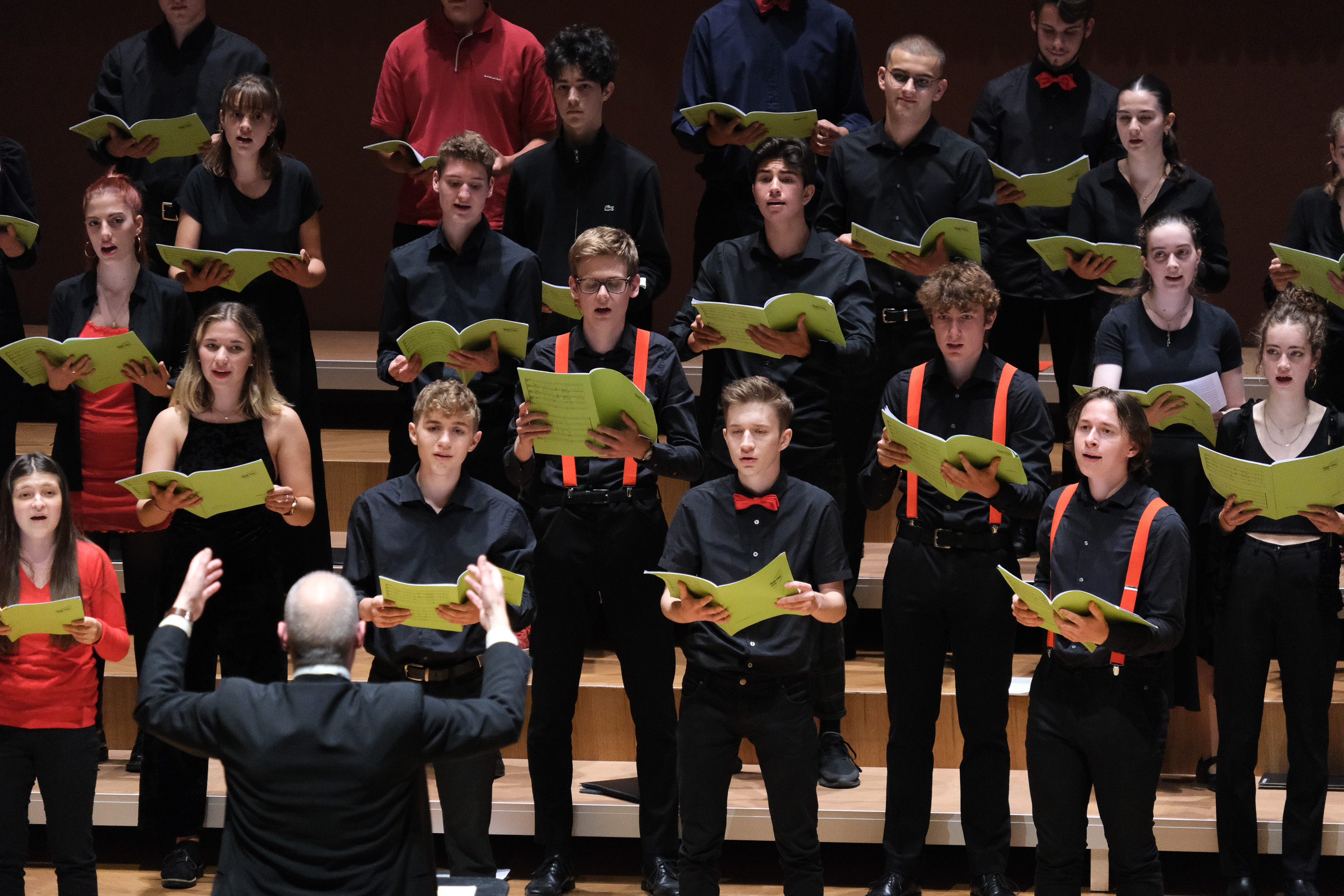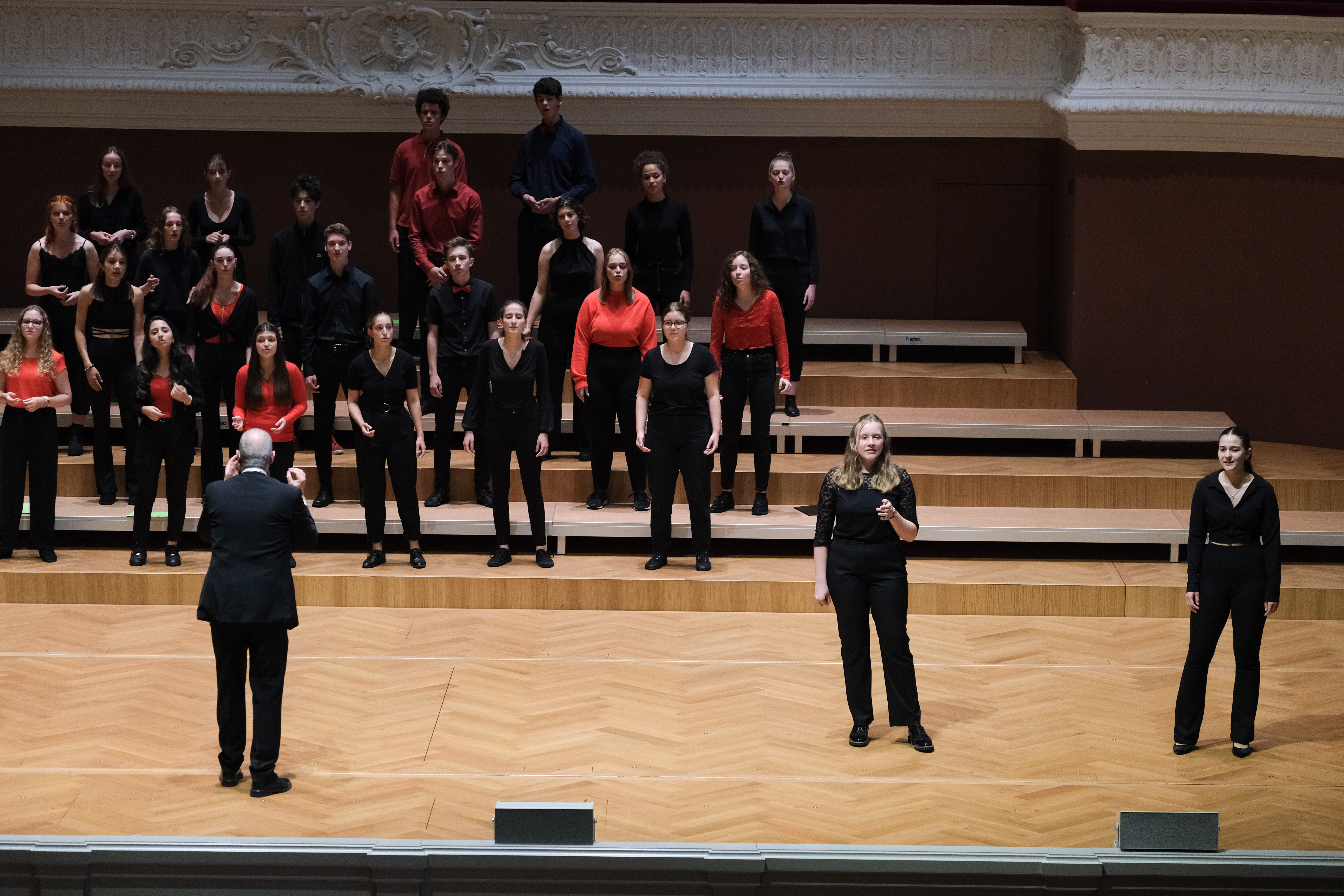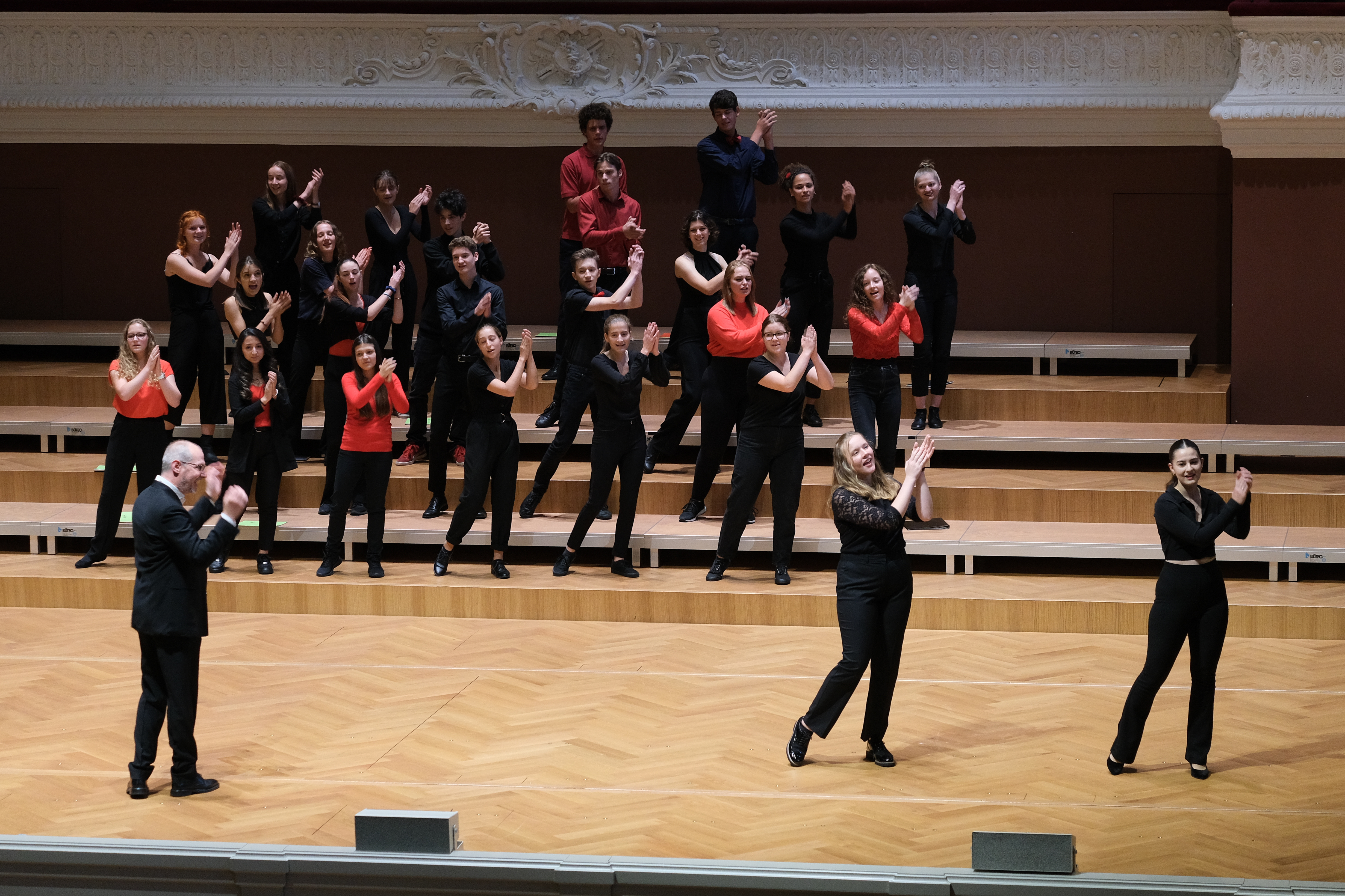 Nun stehen alle bestens vorbereitet im gewohnten schwarz-roten Look vor dem Publikum. Christoph Huldi führt seine Ansage fort: «Der Gym Chor Muttenz hat sozusagen fast tot dahingelegen und heute ist sein Wiederauferstehen. Das können wir zusammen erleben. So soll es doch sein, wie es heute sein wird.» Es folgen Danksagungen und Applaus. Dann geht es los. Mit «Come with Me, My Love» lädt der Chor zum Geniessen der Musik ein. Auf beiden Seiten des Balkons sowie auf der Bühne sind kleinere Chöre platziert. Nach der Hälfte wird das Stück zum dreiteiligen Kanon. Das letzte «Come» hängt noch in der Luft, als Olivia Zaugg am Klavier zu «Open up My Heart» ansetzt. Die Stimmen der Solistinnen Tabea Sterchi und Josephine Odermatt füllen in den Strophen den grossen Saal, und dies ohne Mikrofon. Den Chorus kriegen die Zuschauerinnen und Zuschauer erneut von drei Seiten zu hören. Ein erster Gänsehautmoment ist geschaffen. Die Freude ist bei Chorleiter Huldi selbst von hinten nicht zu übersehen. Aber auch die Gesichter der Schülerinnen und Schüler strahlen förmlich. Die Euphorie, welche der Leiter vor dem Auftritt bei seinem Chor beobachtet hat, ist deutlich spürbar. Unter Klatschen von den Rängen kommt es auf der Bühne zu einer Rochade. Wenig später beginnt der Kammerchor seinen Teil des Programms. Los geht es mit französischem Gesang, mit «La Youtse» vom Schweizer Komponisten Joseph Bovet. Es folgen je ein Stück von Felix Mendelssohn und Nils Lindberg, bevor mit Frank Martin wieder mit einem Schweizer Komponisten abgeschlossen wird. Zu seinem Stück «Chanson en canon (Le petit village)» tanzen die Sängerinnen und Sänger auf der ganzen Bühne herum und singen «Vivre c’est un peu comme on danse.» «Es ist mir wichtig, möglichst vielfältige Konzepte von Chormusik mit dem Kammerchor zu singen. Es sind A-capella-Stücke dabei, Choreographien, Schweizer Musik und Jazz-artige Harmonien», erklärt Jürg Siegrist.