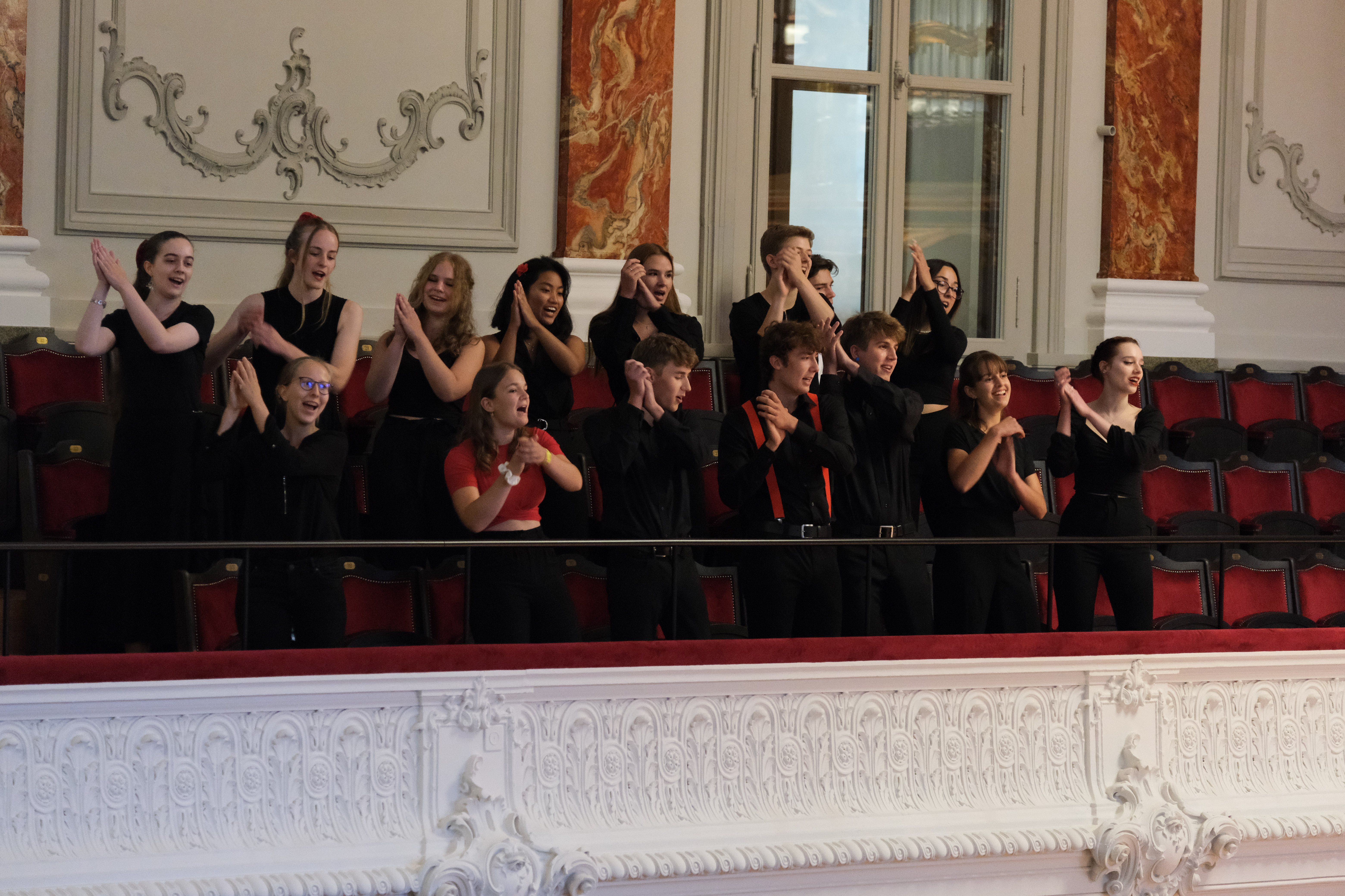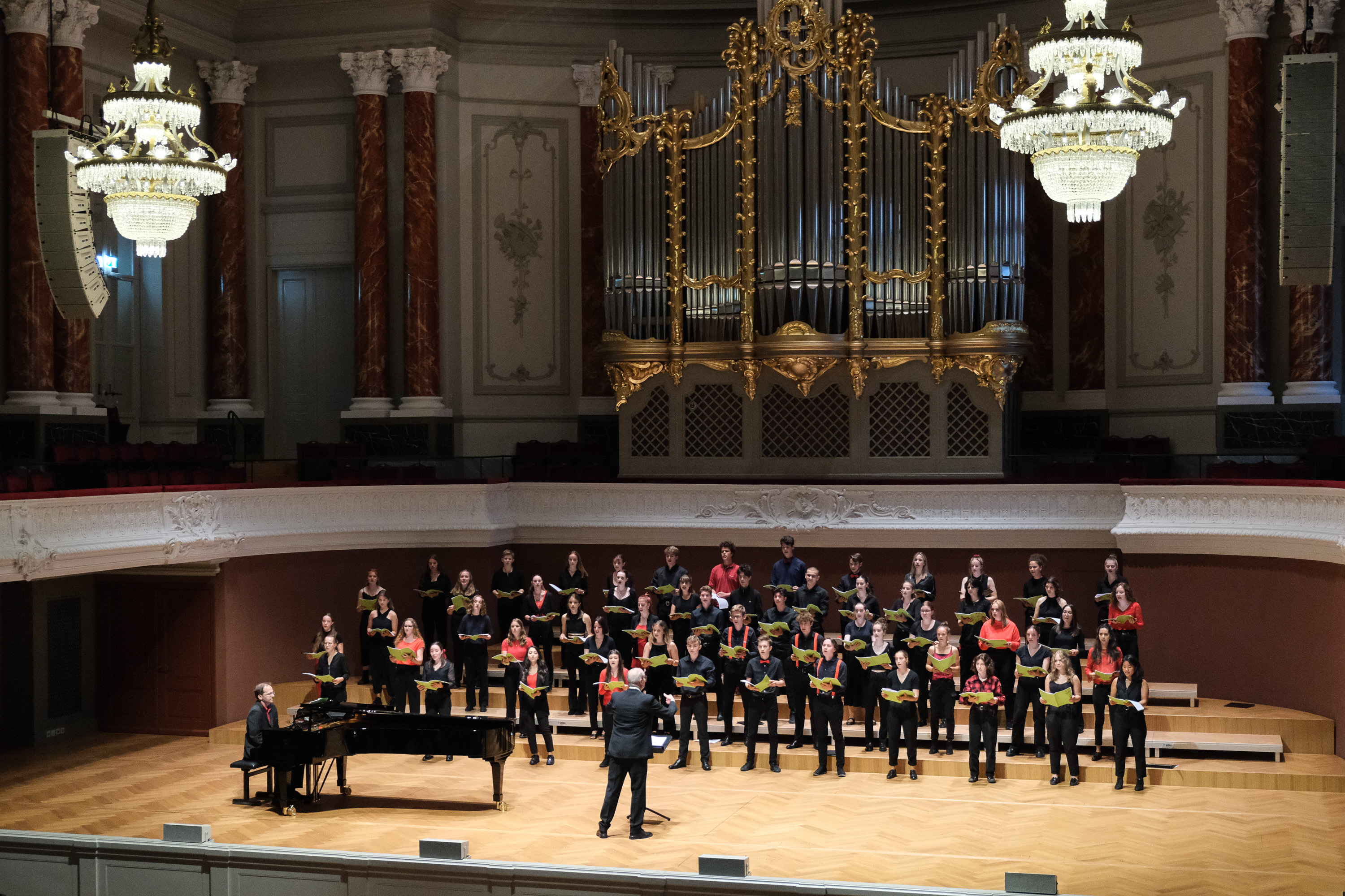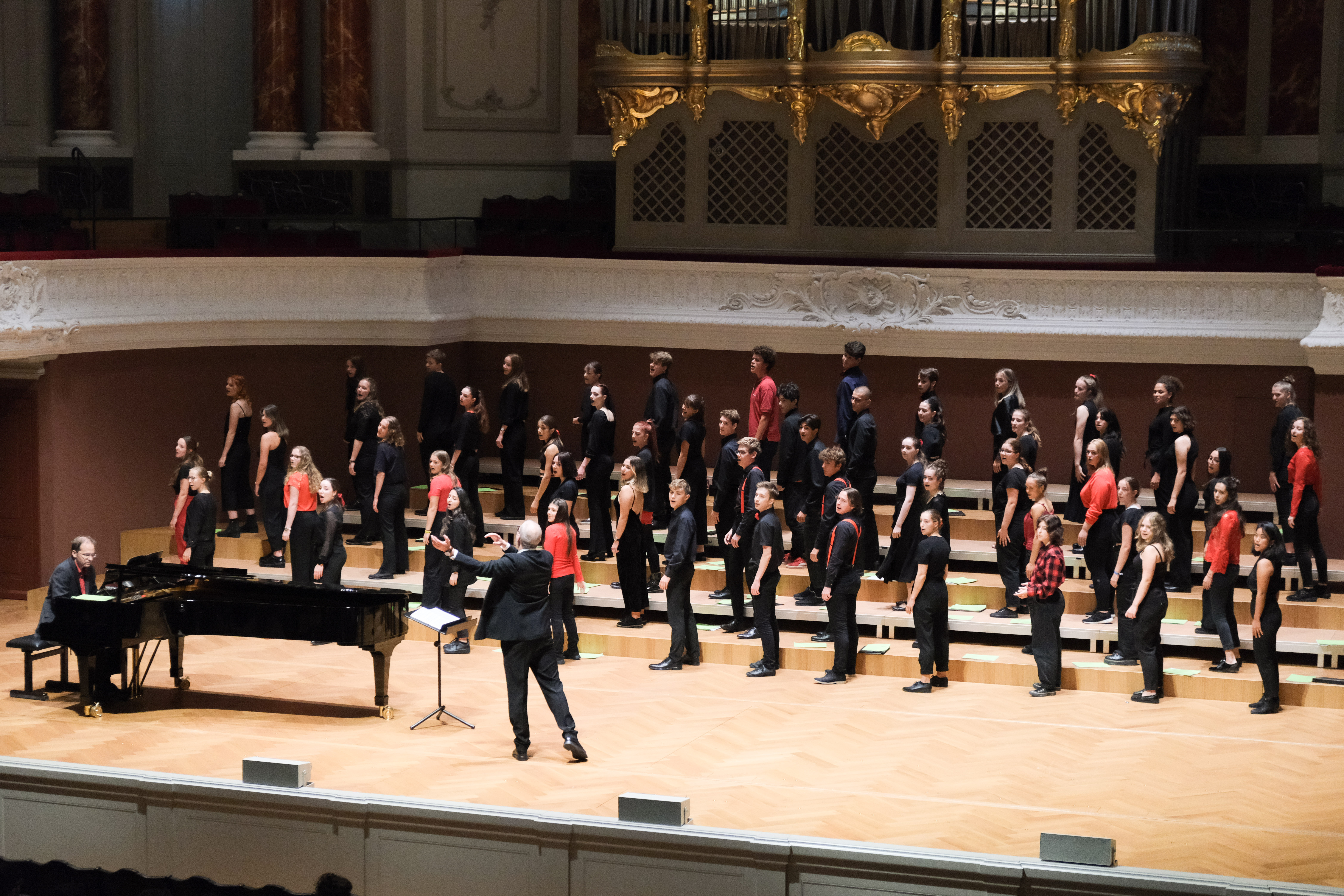 Die Schülerinnen und Schüler waren bereits den ganzen Tag im Stadtcasino am Proben. Etwa die Hälfte von ihnen steht zum ersten Mal mit dem Chor auf der Bühne. Für andere bedeutet dieser Auftritt jedoch Abschiednehmen. Die letztjährigen Viertklässler dürfen noch ein allerletztes Mal mitwirken. «Da wir nie ein Abschlusskonzert hatten, ist es schön, dass wir nochmals mitsingen dürfen. Es ist wie nochmals ein Abschluss», meinen einige von ihnen. Christoph Huldi schätzt die Stimmung im Chor ein: «Jetzt, wo wir an diesem grandiosen Ort singen, sind sie euphorisch, sehr sehr motiviert.»