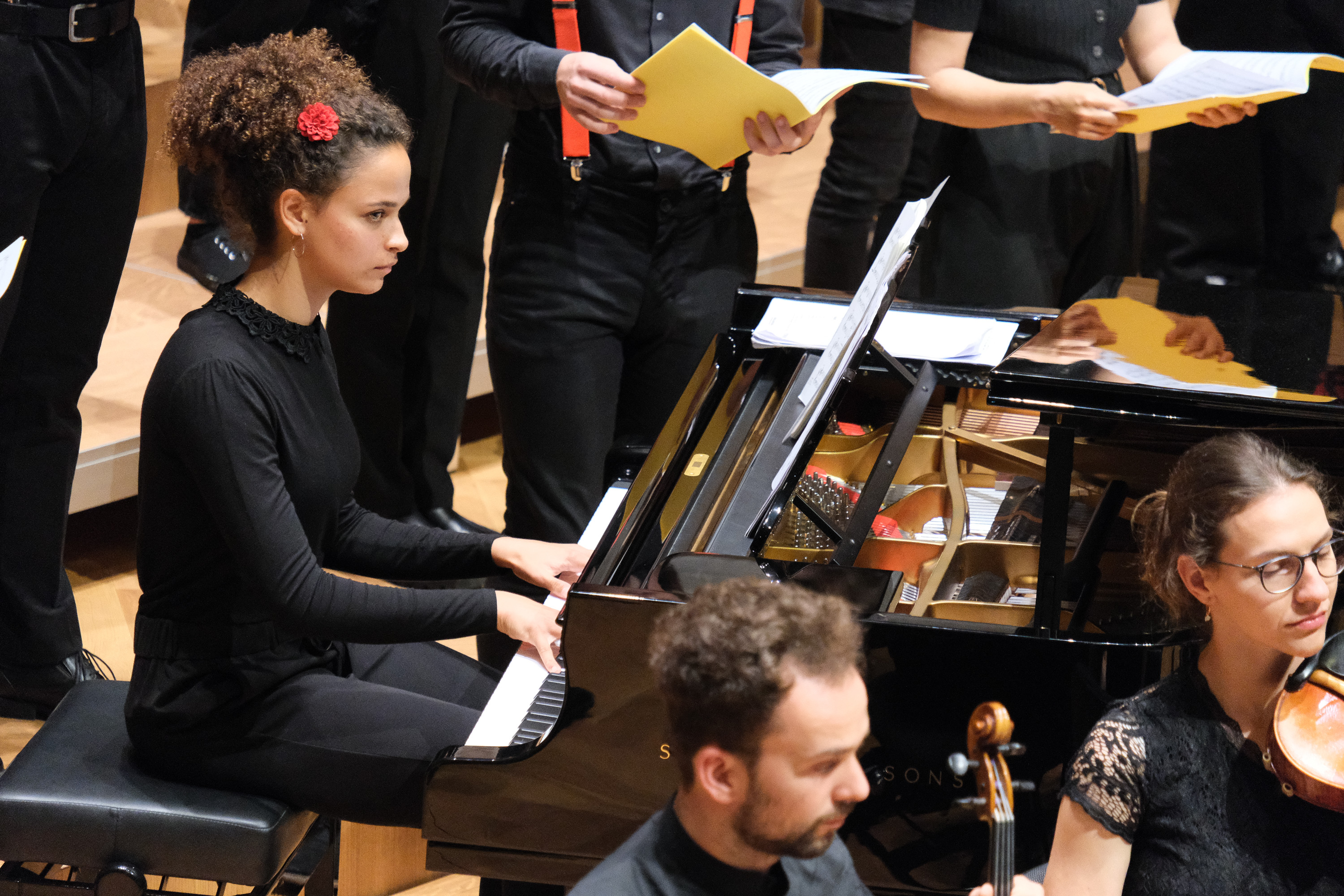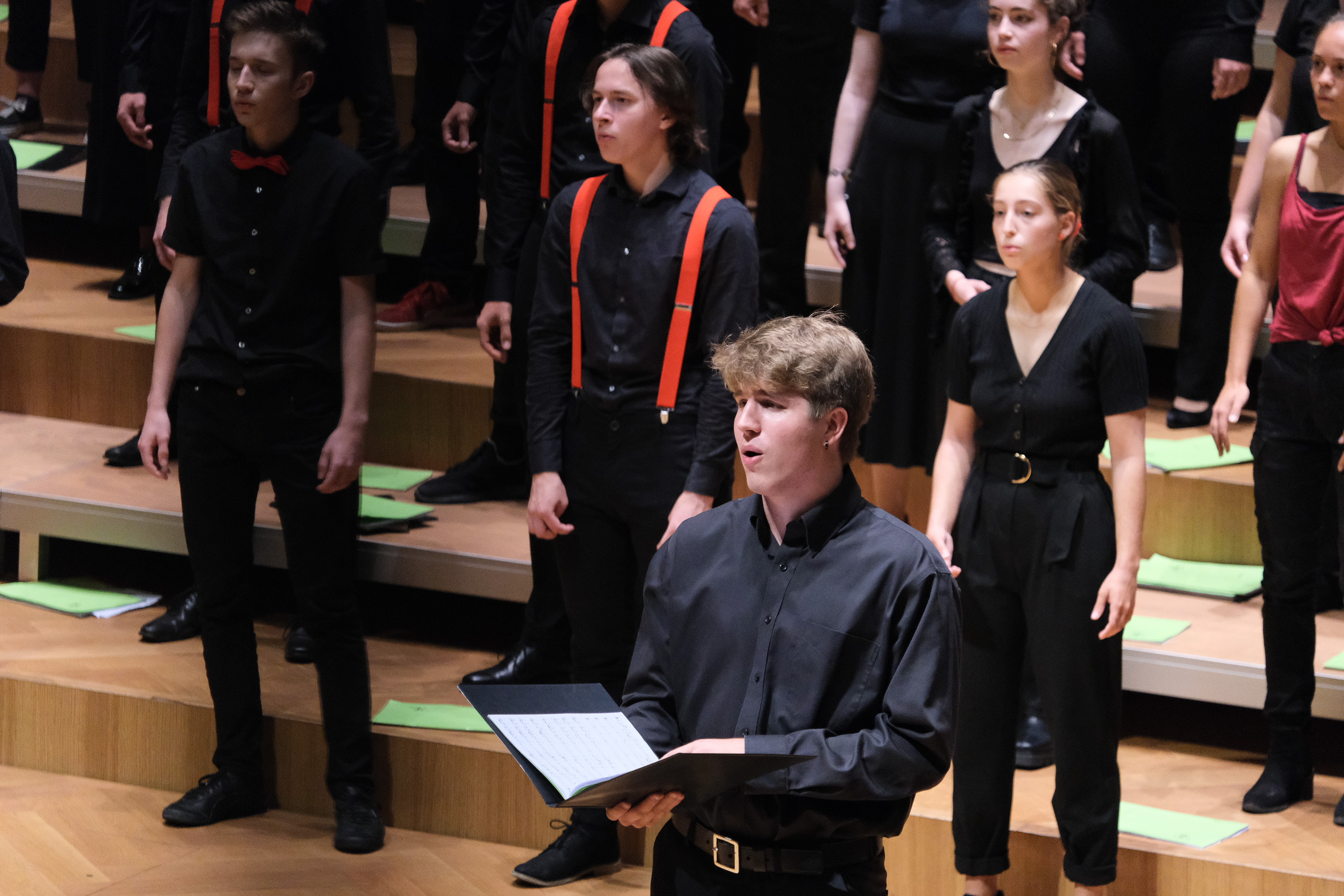 Der Kammerchor wird wieder vom restlichen Chor ergänzt und «Sixteen Tons» wird angestimmt. Die Schülerinnen und Schüler verwandeln sich in eine schnippende, beinahe furchterregende Herde amerikanischer Kohlearbeiter. Zwei Songs später scheinen sie alle in einem Rock-n-Roll Klub der sechziger Jahre den Twist zum «Scandinavian Shuffle» zu tanzen. Die mitreissenden Choreographien werden für Lenard Fasnachts beeindruckendes Solo in Billy Joels «And so It goes» pausiert. Doch vor der Pause schwenken sie alle nochmal ihre Hände neben sich zum Jazzstandard «Puttin’ on the Ritz» und ernten eine weitere Runde lautstarken Applaus.