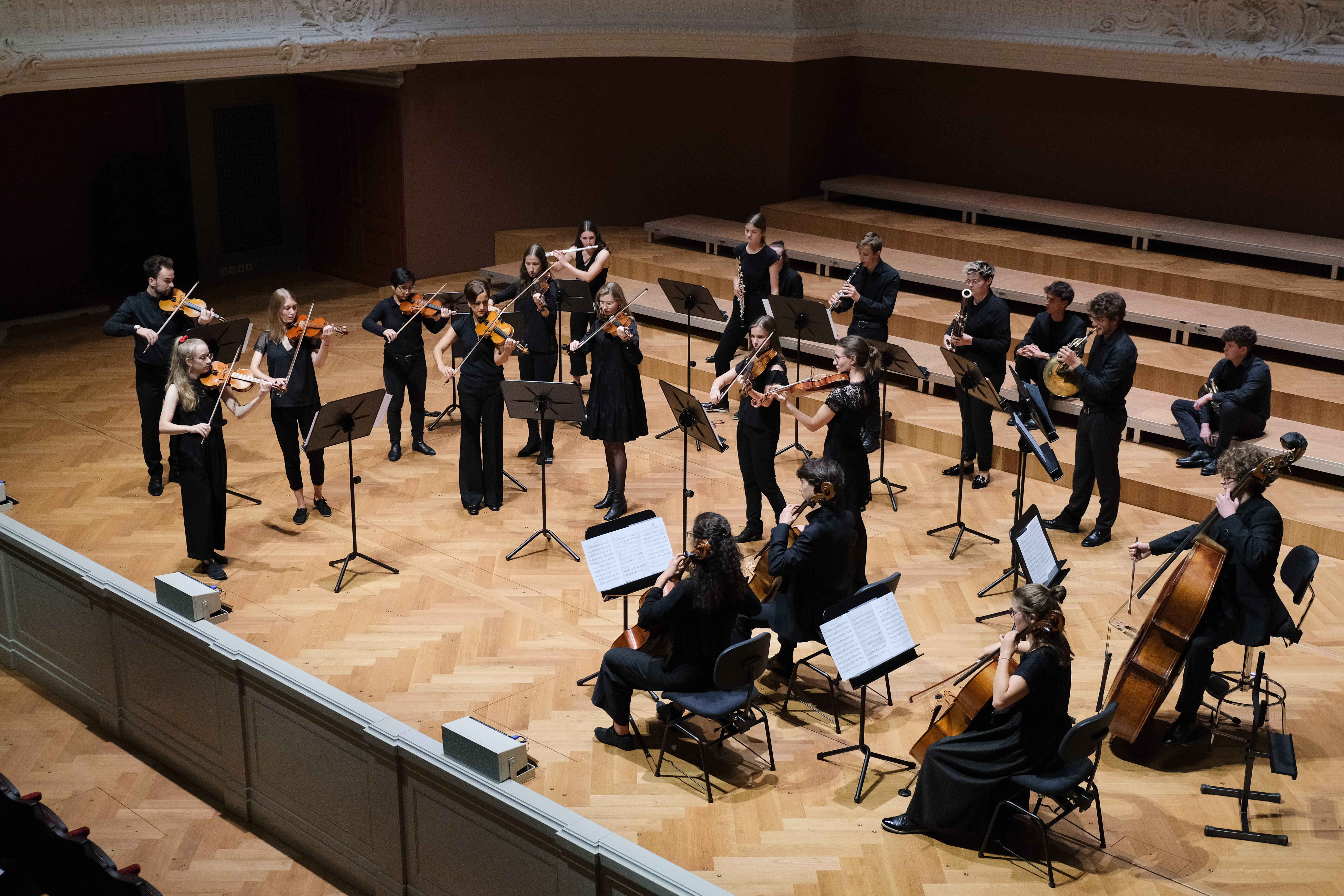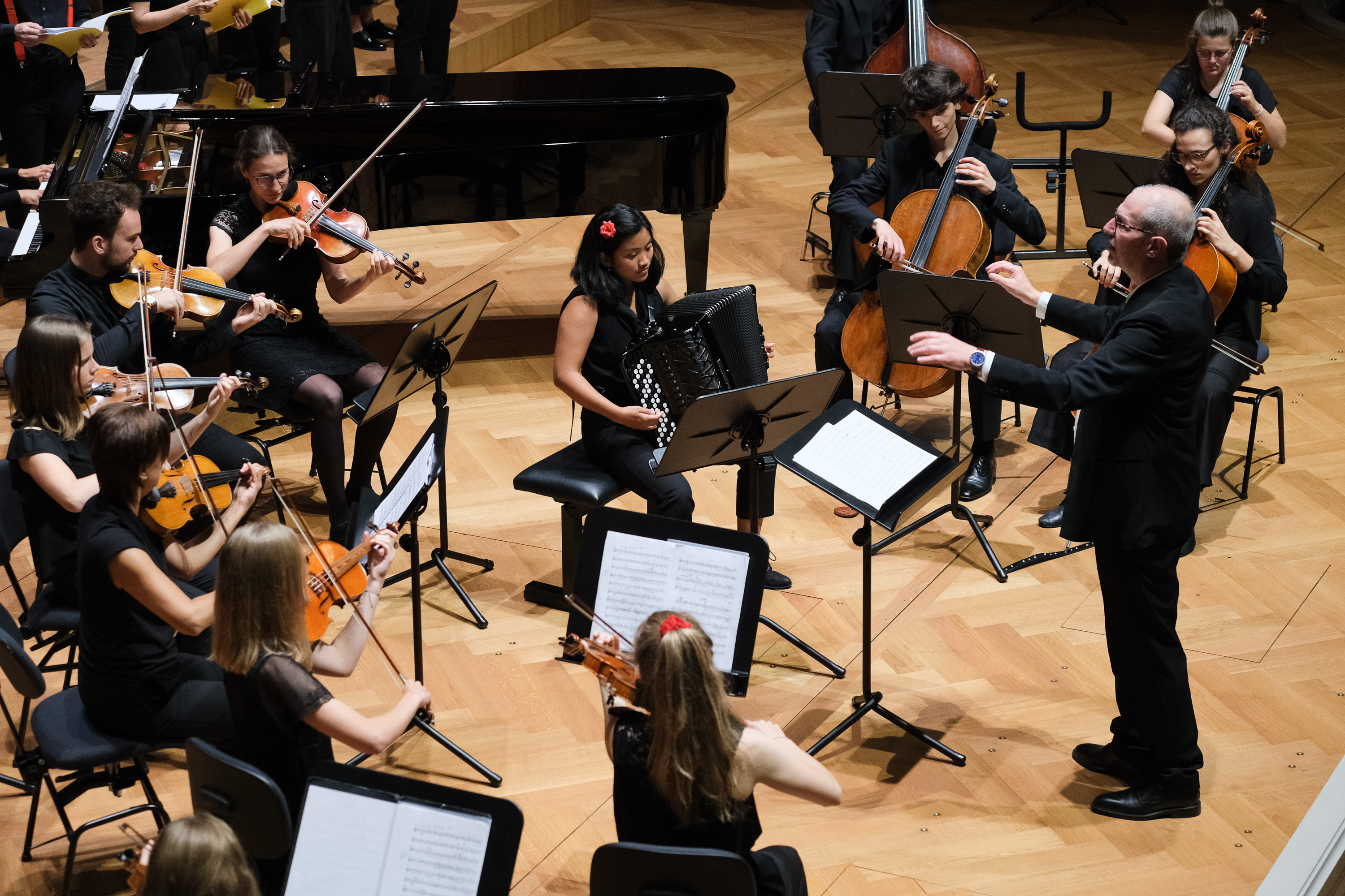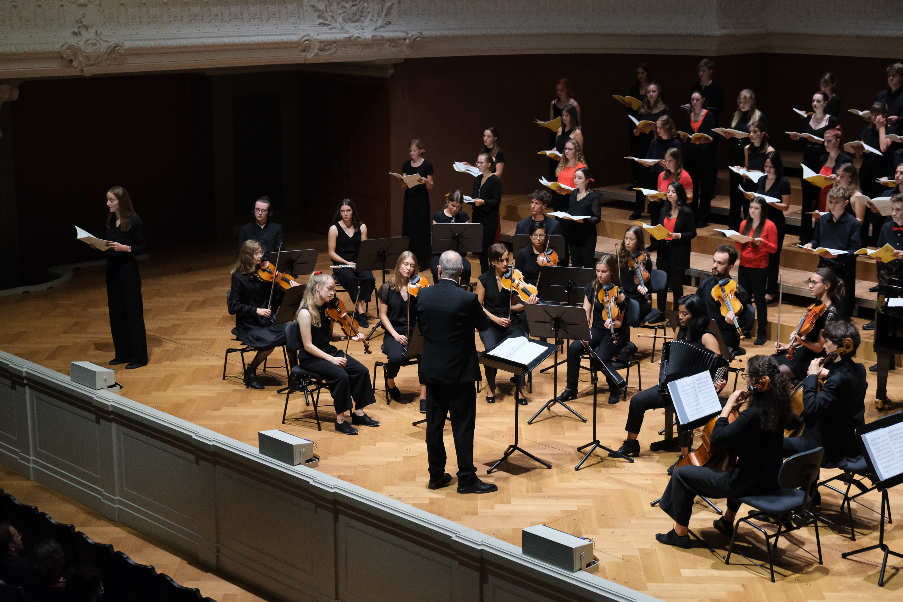 Nach der Unterbrechung nimmt der Chor auf dem Balkon Platz, denn auf der Bühne steht jetzt das Junge Kammerorchester Baselland im Rampenlicht. Das Orchester unter der Stimmführung von Christina de Noronha und Mirjam Rietmann ist kein Neuling an der Seite des Gym Chors. Viele sind ehemalige Schülerinnen und Schüler des Gymnasium Muttenz. Die beiden Gruppen sind schon mehrfach zusammen aufgetreten. Die Chance, im Stadtcasino zu spielen, liessen sich die Musikerinnen und Musiker natürlich nicht entgehen. Sie verzaubern das Publikum mit Arthur Honeggers «Pastorale d’été». Der Chor übernimmt mit einer Einlage auf dem Balkon und einem Solo von Claudia Studer. Dann übergibt Christoph Huldi wieder zurück auf die Bühne ans Orchester. Die Streichsektion rüttelt das Publikum mit wuchtigen Klängen aus der Tiefenentspannung, die der Chor zuvor herbeigeführt hat. Motive werden von Instrument zu Instrument gespickt. Nun kriegt auch das Junge Kammerorchester Baselland den Applaus, der ihm gebührt. Der Chor steigt vom Balkon hinunter zurück auf die Bühne. Zusammen mit dem Orchester kommt es zum Höhepunkt des Abends: Martín Palmeris Messe «Misatango», beziehungsweise zwei Drittel davon. Das Werk wurde bereits vor knapp zwei Jahren beim letzten Auftritt aufgeführt, doch es hat in der Zwischenzeit nicht an Eindrücklichkeit verloren. Ein weiterer Gänsehautmoment.