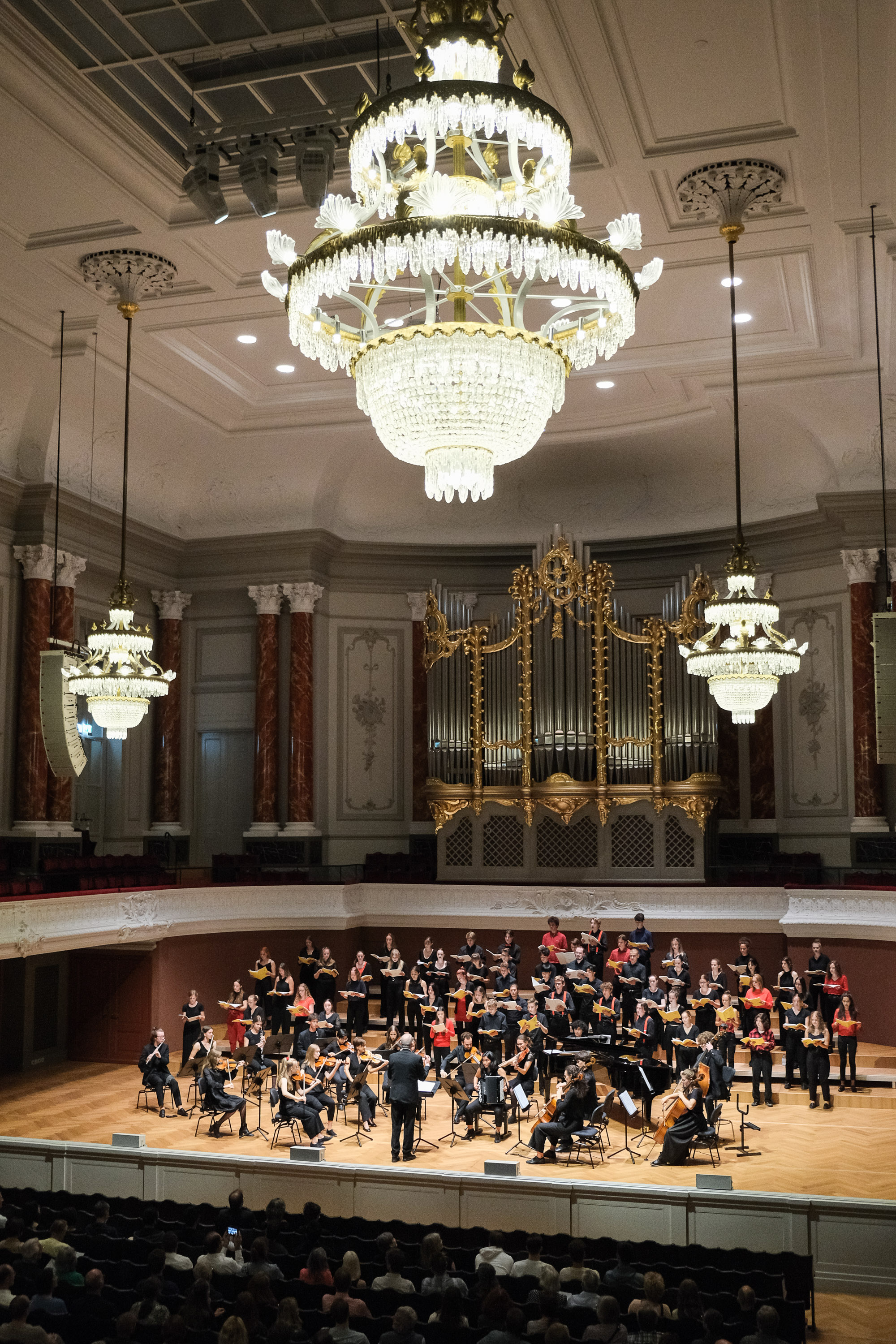 Von der Decke hängen vier imposante Kronleuchter. Über der Bühne thront eine riesige, brandneue, silber-goldene Orgel. In den in rotem Samt gekleideten Rängen sitzen wartende Zuschauerinnen und Zuschauer. Die hohen Spiegeltüren zum Balkon öffnen sich. Links und rechts sowie unten auf der Bühne betreten die Sängerinnen und Sänger den weltberühmten Saal des Stadtcasinos in Basel. Vom Parkett erklingt Applaus. Schliesslich ergreift Christoph Huldi das Wort: «Einen wunderschönen Abend, mein liebes Publikum!» Der Chor des Gymnasiums Muttenz, er lebt wieder.