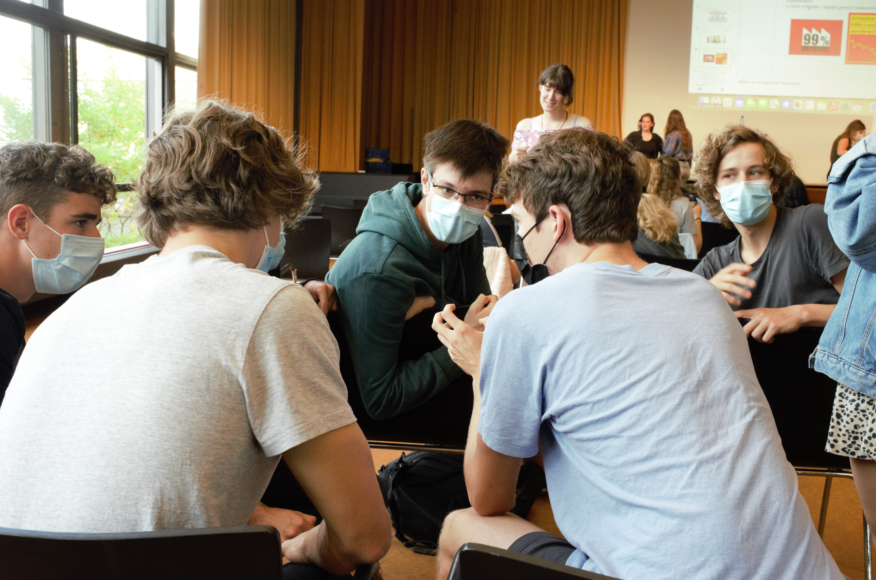 Gestartet wurde in drei klassenübergreifenden Workshops. In roter Schrift strahlte uns als Erstes das Motto des Morgens entgegen: Politik geht uns alle etwas an! Mit einer kurzen Mahnung zu Respekt begann auch schon die Einführung zur bevorstehenden Diskussion. Am Beispiel der «Ehe für alle» wurden die Methoden zur neutralen Aufbereitung erklärt. Darauf folgte der Auftrag, selbst die Fakten zur «99%-Initiative» zusammenzutragen. In Vierergruppen wurden fleissig Informationen gesammelt und recherchiert. Währenddessen entstanden bereits erste Diskussionen zu den Themen und die Vorfreude auf das folgende Streitgespräch stieg.
