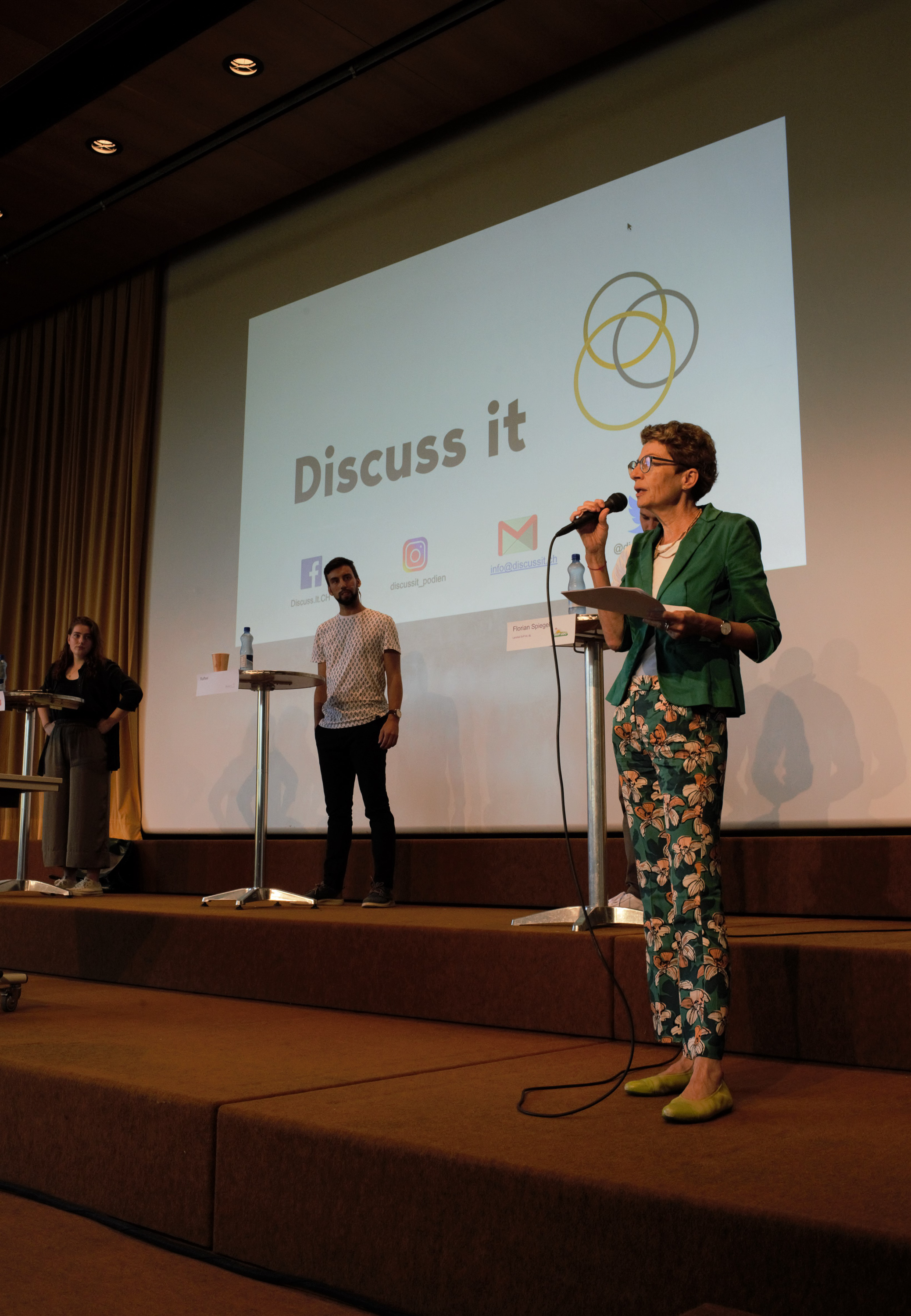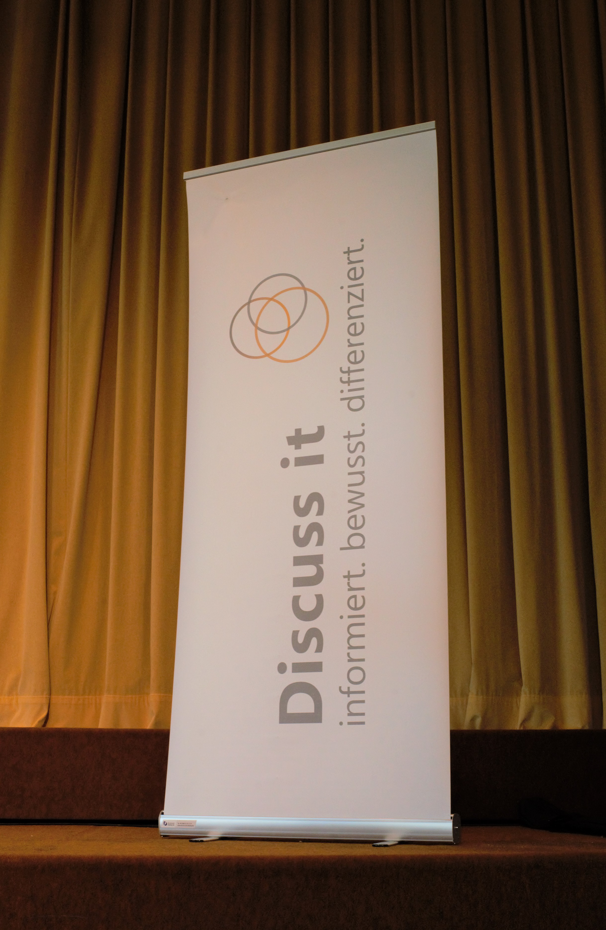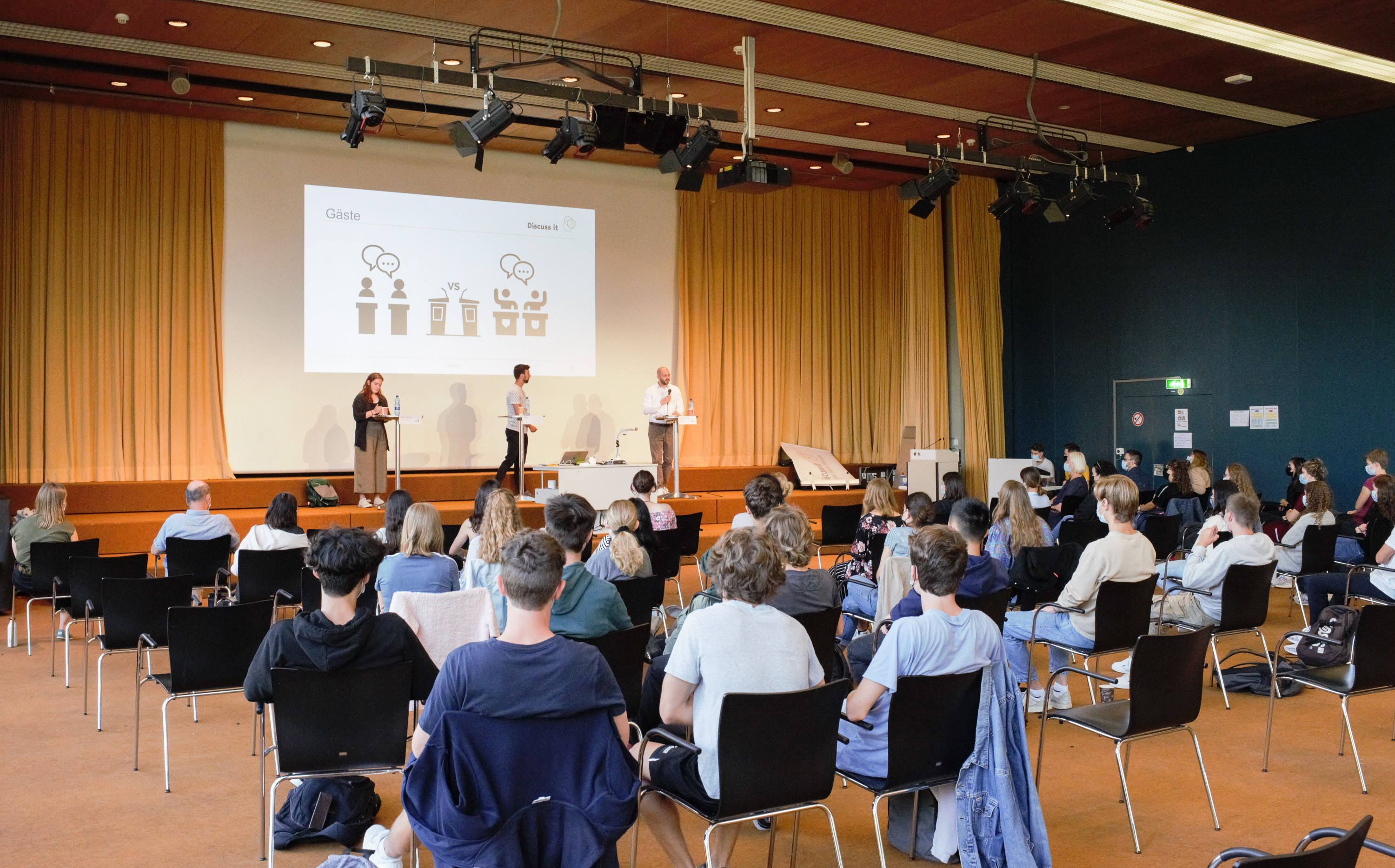 Nach einem Austausch unserer Ergebnisse mit den anderen Gruppen und einer kurzen Pause konnte es losgehen. Die Klassen versammelten sich in der Aula, wo schon die beiden Opponenten bereitstanden. Auf der Pro-Seite befand sich Elena Kasper, Co-Präsidentin der JUSO BL, auf der Contra-Seite Florian Spiegel, SVP-Landrat und Präsident der GPK. Geleitet wurde das Streitgespräch von Raffael von Arx vom discussit-Team, der mit Ruhe und Bestimmtheit durch die Themen führte.