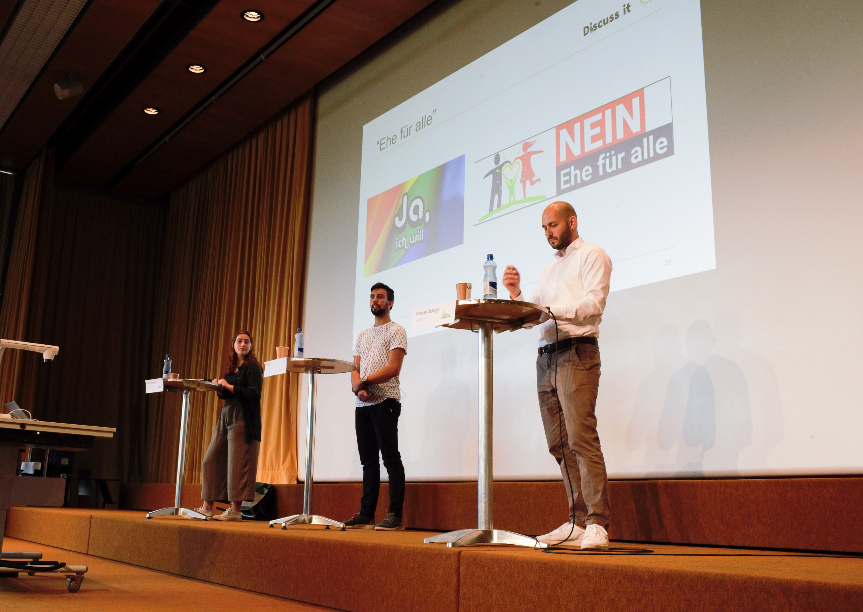 Den Anfang machte Raffael mit dem Referendum «Ehe für alle». Schnell stieg die Spannung, als Frau Kasper die Bemerkungen der SVP zur Vorlage als «heuchlerisch» bezeichnete. Darauf folgte eine angeregte Diskussion über gleiche Rechte, Kinder und Grundsätze. Was zu einer hitzigen Debatte führte, war unter anderem die Samenspende und die Frage, wer darauf Anspruch hat und wer nicht. Argumente flogen von links nach rechts. Dazu kamen einige Fragen aus dem Publikum. Am Ende stand nur eines fest: Ein Ja zur Ehe für alle, aber ein Nein von Florian Spiegel zur Samenspende.