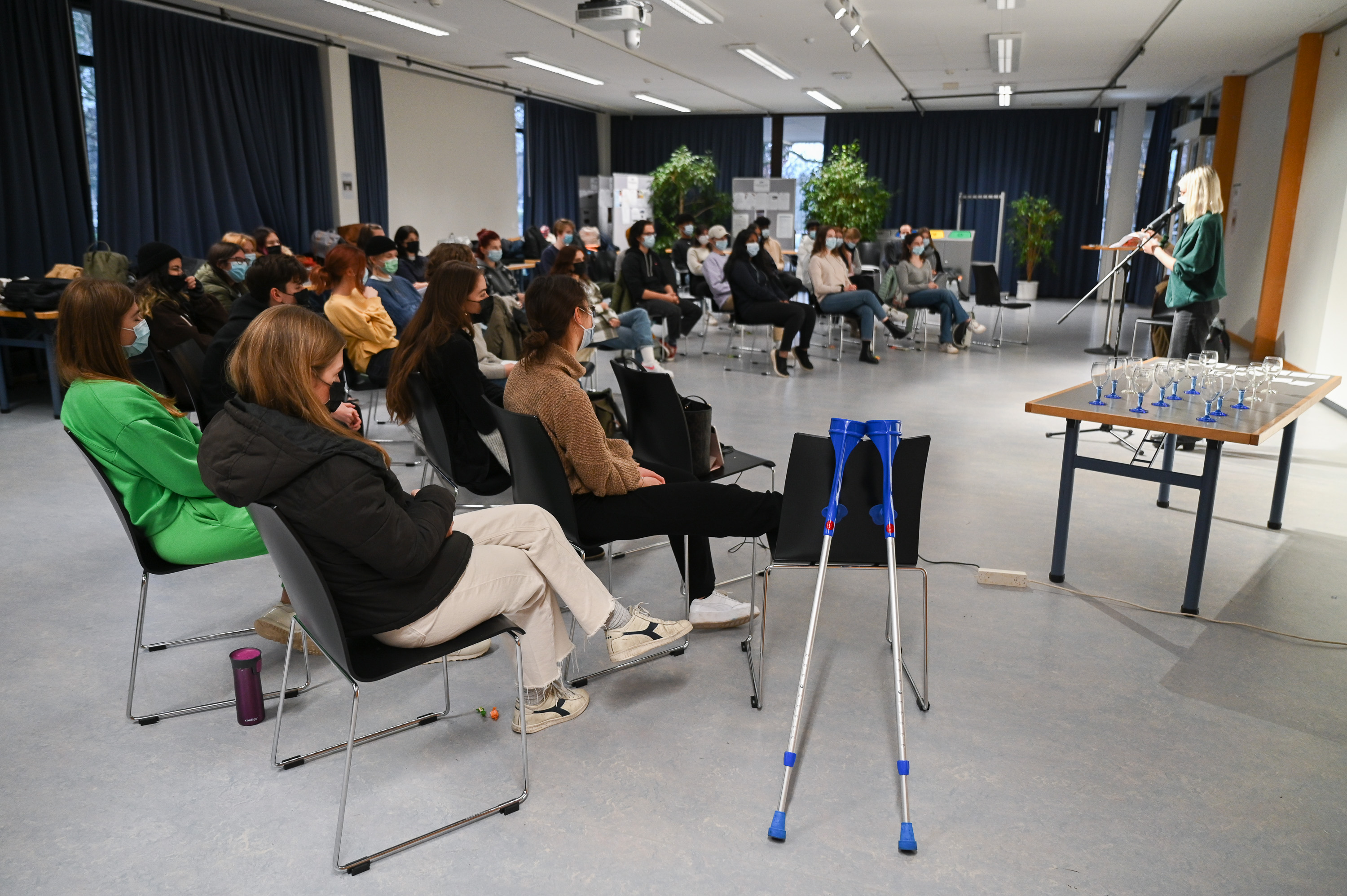 Auch wenn in diesem kurzen Abriss nicht alle Texte zur Sprache kamen, wird deutlich, wie produktiv, divers und gelungen die Schüler:innen sich in dieser Kunstform ausprobierten. Die Slam-Poetin Nadine Studer – eigens für diesen Anlass ans Gym gekommen – führte souverän durch den Wettstreit. Ein Wettstreit, der per Abstimmung mit Sugus am Ende eine Gewinnerin hervorbrachte: Rafete Mamuti. Durch ihren Sieg hat sich Rafete direkt für das Finale U20-Meister:innenschaften am 18. Februar 2022 im Literaturhaus in Basel qualifiziert. Wir freuen uns auf viele weitere wohlbetonte Worte, bedeutungsschwere Pausen und in-Erinnerung-bleibende letzte Sätze von Rafete und allen anderen Schüler:innen der beiden Klassen. Auch ausserhalb unseres Foyers.