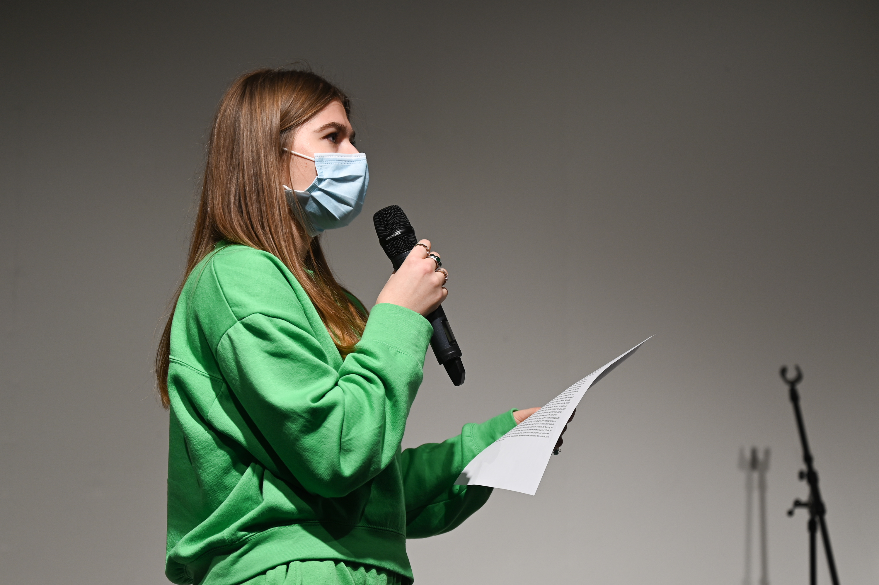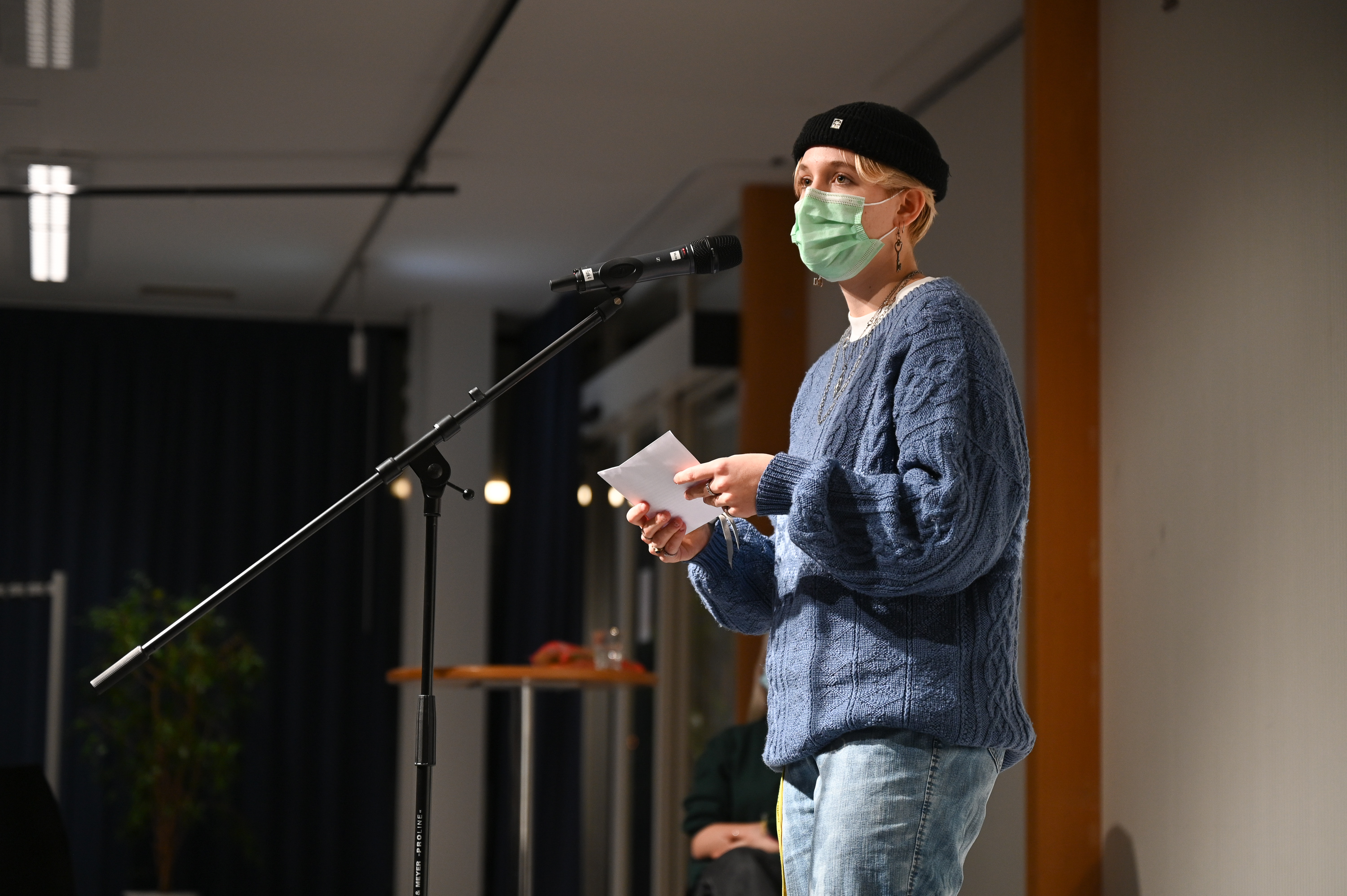 Insgesamt 13-mal ertönte der Applaus im Foyer. 13 Schüler:innen, die in klasseninternen Slams im Vorfeld bestimmt wurden, performten ihre selbstverfassten Texte. Die Bandbreite reichte von sehr persönlichen Einblicken in die eigene Gefühlswelt über humorvolle Aufarbeitungen von alltäglichen Problemen bis zu skurrilen Kurzgeschichten. So erlebten wir den alltäglichen Struggle, vor dem Mittag mit einem Hungerloch im Unterricht zu sitzen, um nur kurze Zeit einem inneren Monolog eines Döners während den letzten Minuten seines Lebens zu lauschen. Solidarisch mit dem Döner – oder vielmehr mit dem Tier, woraus er gemacht wurde – zeigte sich eine weitere Schülerin, die eine flammende Rede für das Tierwohl hielt.