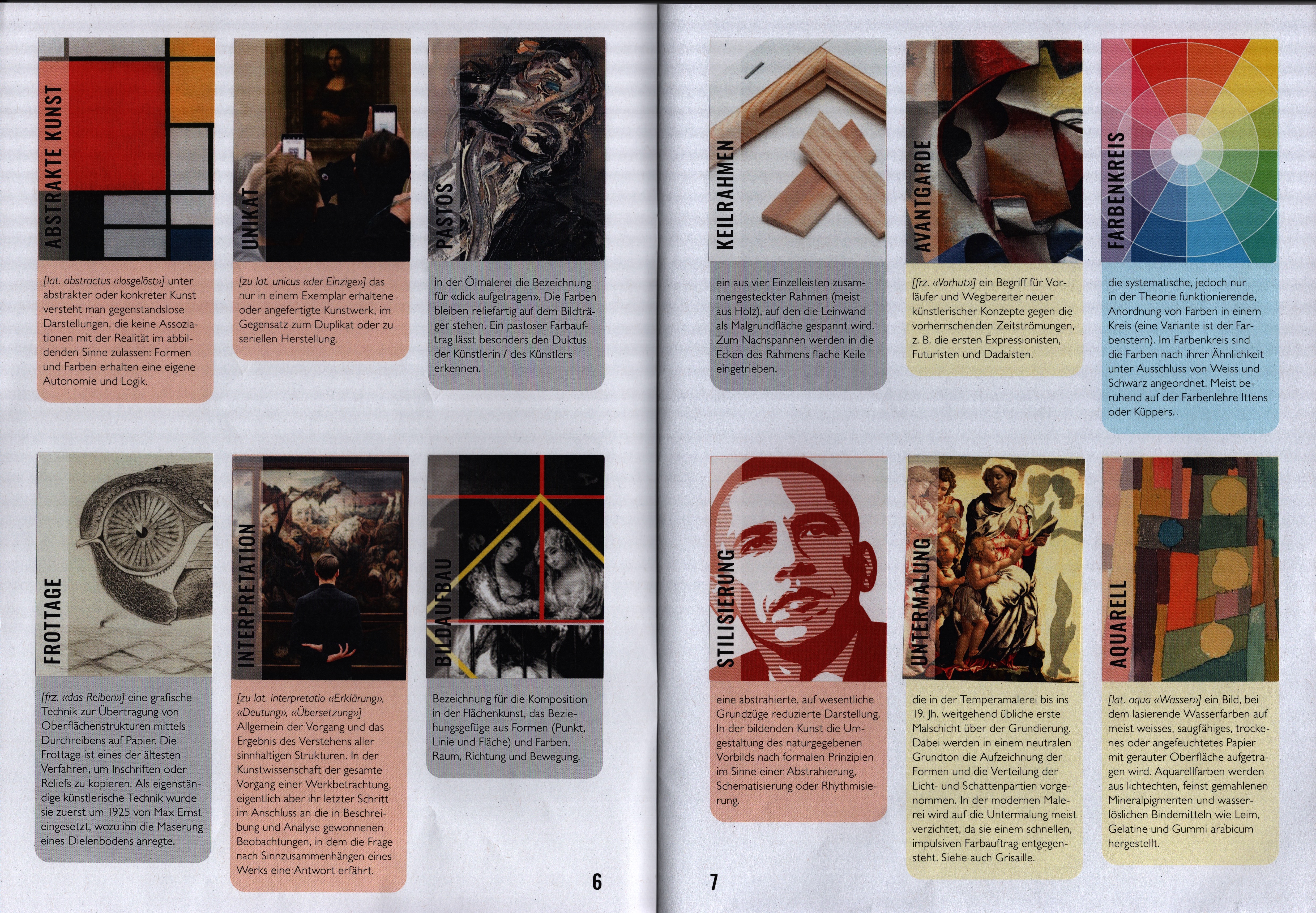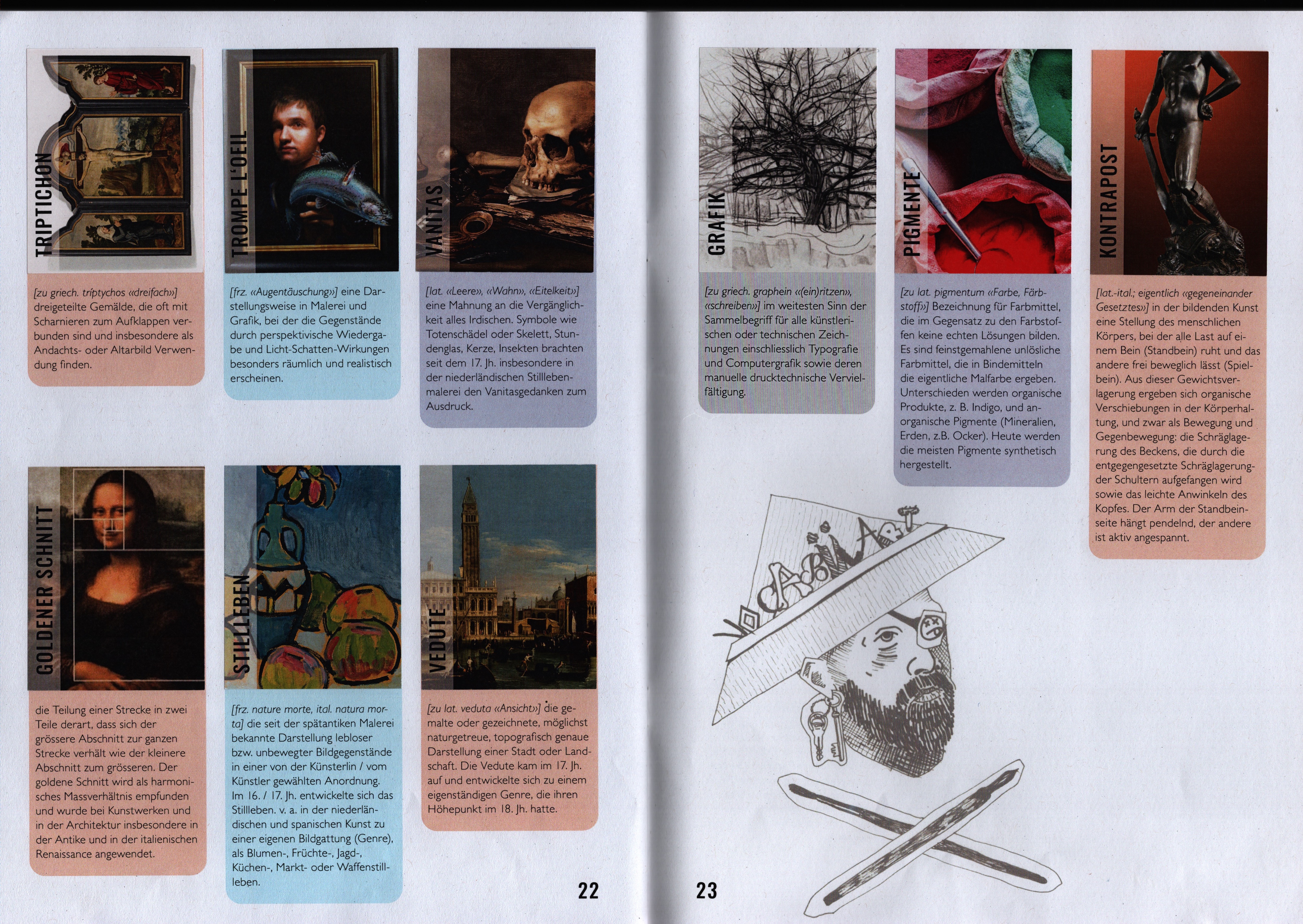 Nach dem Vorbild von Panini knobelte die Fachschaft BG 124 essenzielle Begriffe zur Bildbetrachtung aus. Mit sorgfältiger Freude am Detail wurden die Begriffe zu Aufklebebildchen und einem dazugehörigen Sammelalbum gestaltet. Ein passendes Logo für das Projekt entwarfen die Schüler*innen der Klasse 2MZ.