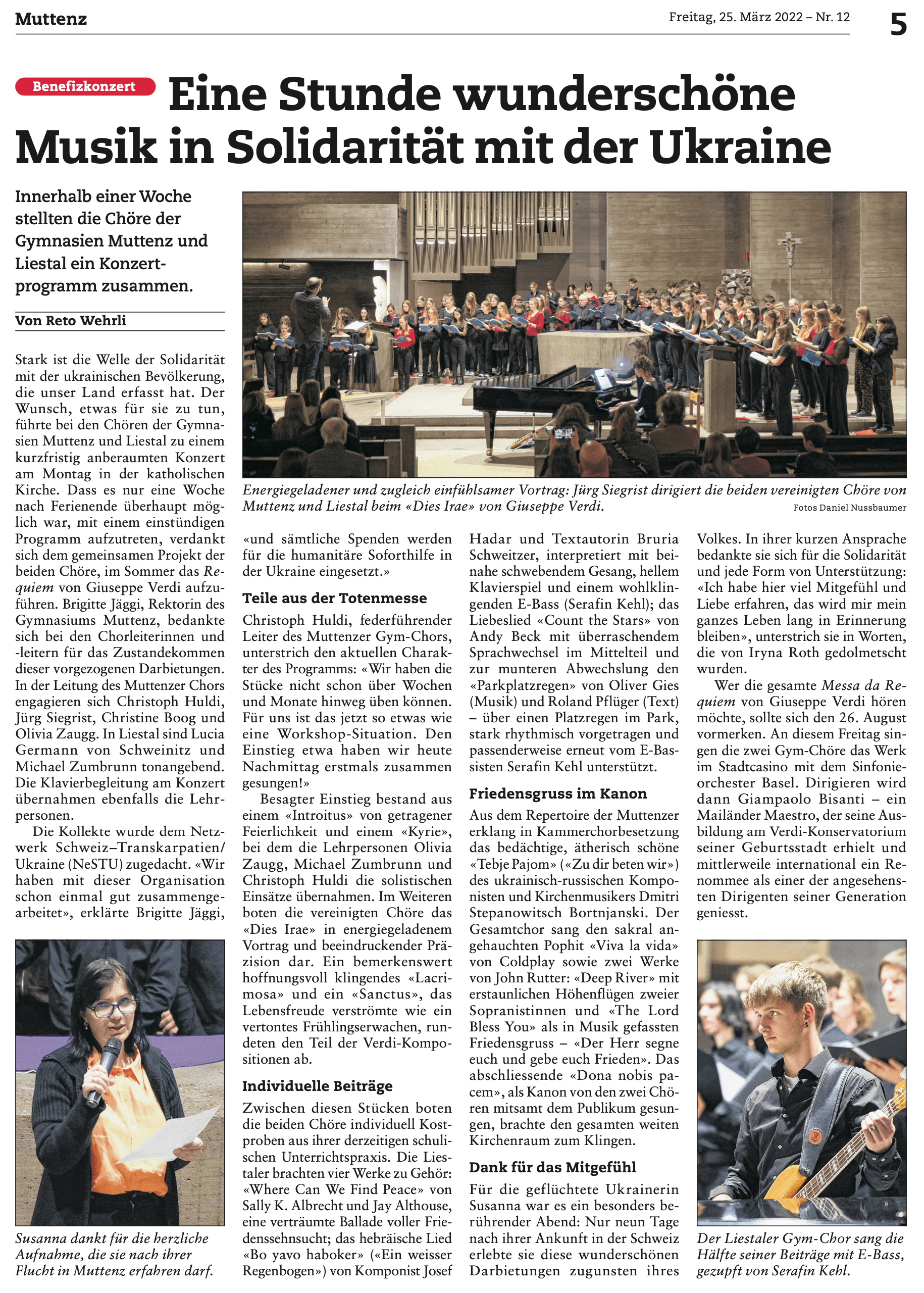Zum Abschluss unserer Solidaritätswochen geben wir hier zu hören, wie unser Chor am 21. März anlässlich des Benefizkonzertes für die Ukraine klang. Über das Konzert schreiben Maxine Walder im hier verlinkten Beitrag und Reto Wehrli im Muttenzer Anzeiger. Wir dürfen seinen Konzertbericht grad hier unten publizieren. -Nu