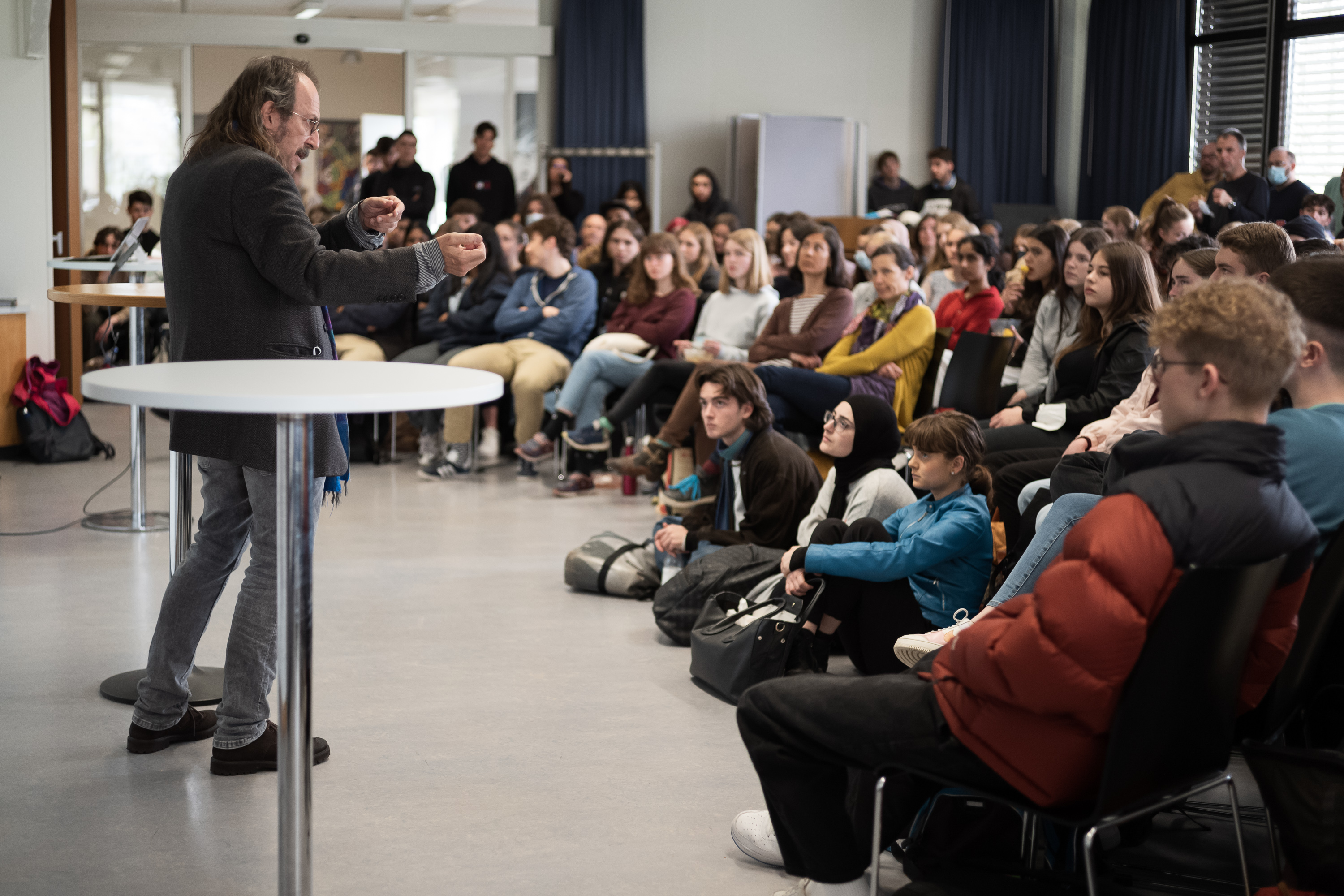 Nach den Erläuterungen der drei Herren verschafft uns ein Schüler der vierten Klasse, Daniel Oeschger, einen sehr bewegenden Eindruck zur Situation in der Ukraine. Er hat mütterlicherseits Familie in der Ukraine und hat eine ukrainische Kollegin gebeten einen Text zu ihrem aktuellen Leben zu schreiben. Ihre Nachricht macht uns deutlich, dass es nicht nur für uns unerklärlich ist, dass Putin nun wirklich die Ukraine angegriffen hat, sondern dass auch die Menschen, die in der Ukraine leben, noch immer nicht begreifen können, dass es wirklich passiert ist. Sie schreibt von dem surrealen Empfinden über den Angriff in der Nacht auf den 24. Februar. Weiter erzählt sie auch von der Angst, die sie nun hat, um ihre Familie und Freunde. Sie lebt nicht direkt im Kriegsgebiet und trotzdem pendelt sie zurzeit bei jedem Flieger-Alarm zwischen Wohnung und Schutzraum. Auch ist für sie völlig offen, was die Zukunft bringt, und das bereitet ihr grosse Angst. Während Daniel Oeschger diesen Text vorliest, bekomme ich langsam eine Gänsehaut und alle Schülerinnen und Schüler hören ihm aufmerksam zu. Es ist zum ersten Mal sehr still im Foyer und es breitet sich eine gedrückte Stimmung aus. Alle werden nachdenklich und viele sind auch sehr berührt vom Gehörten.