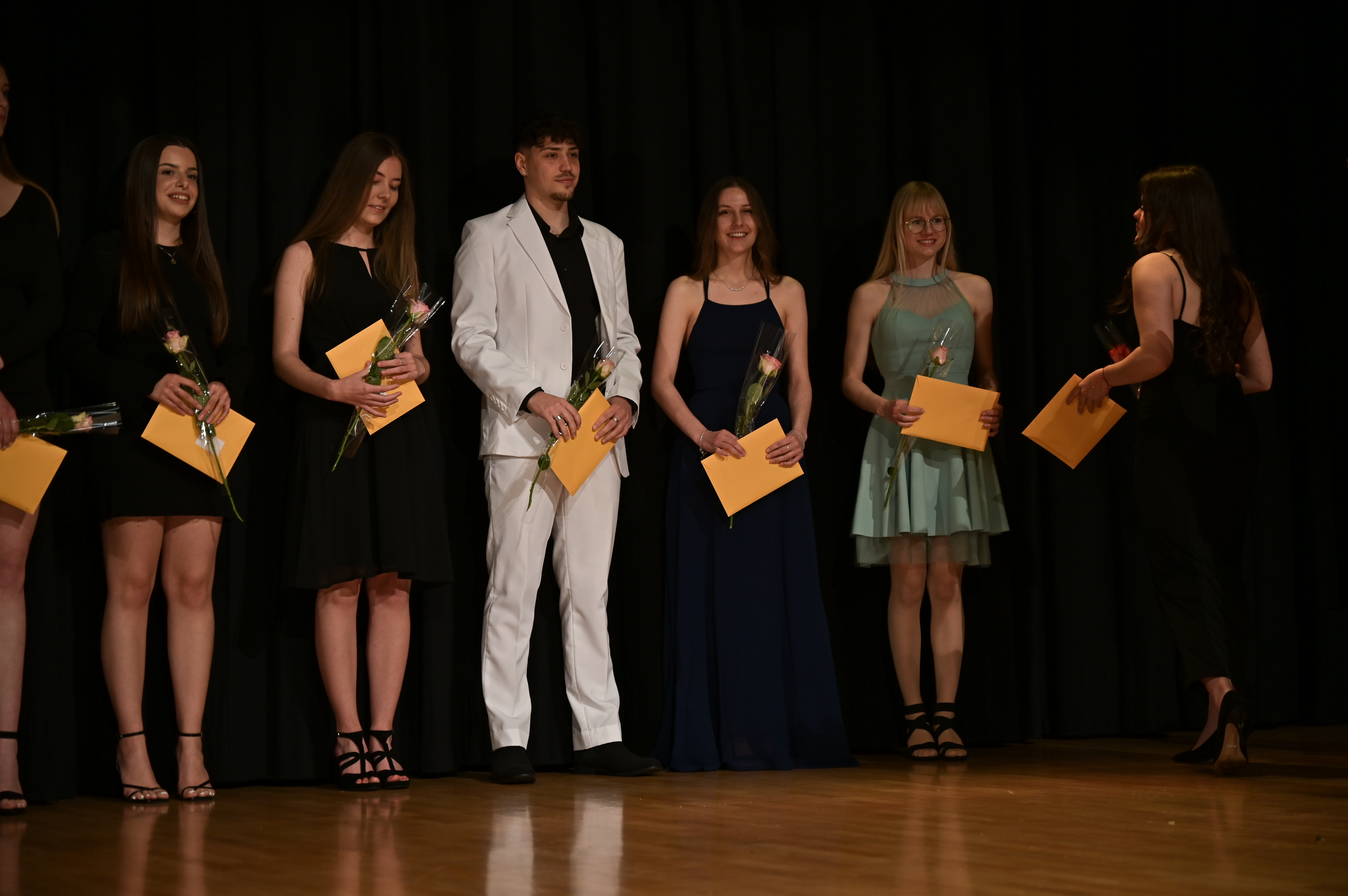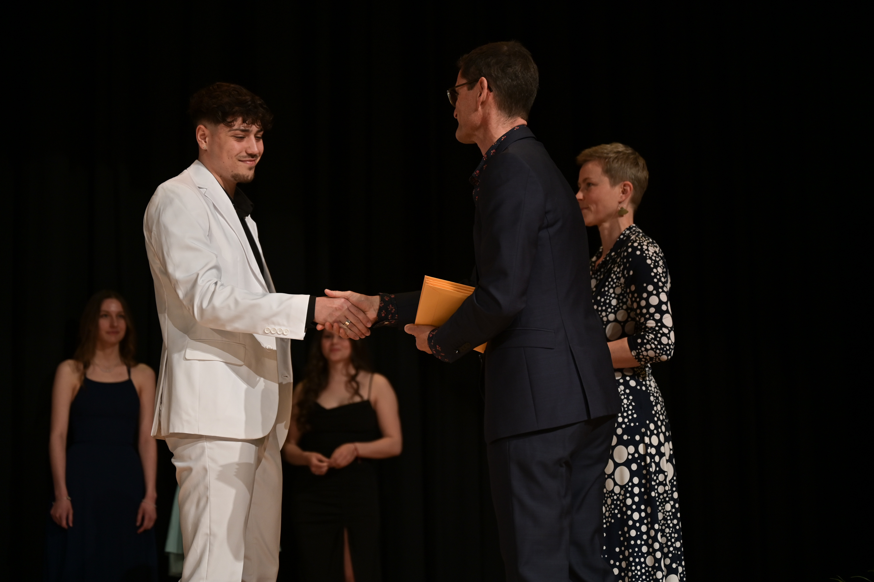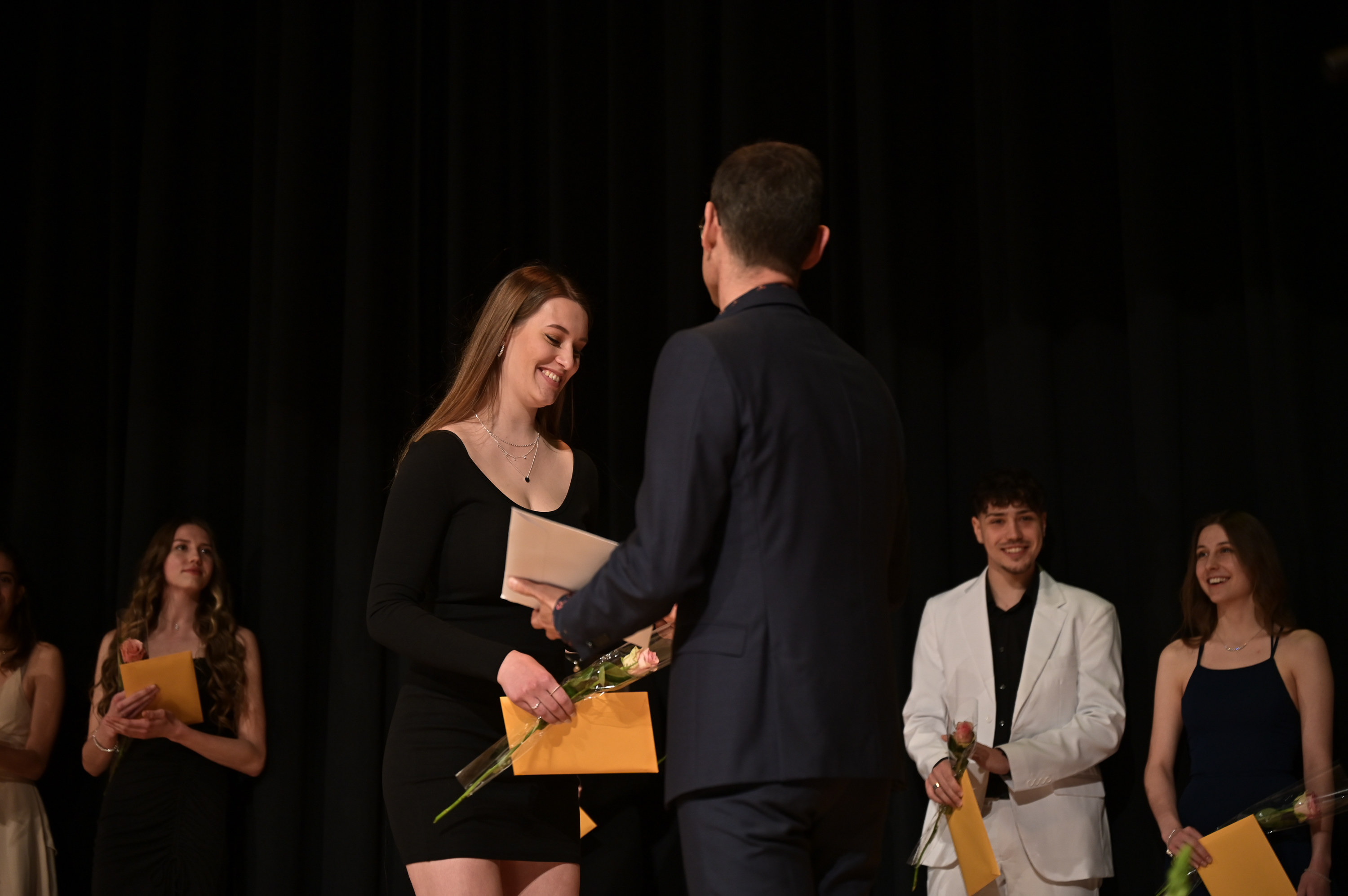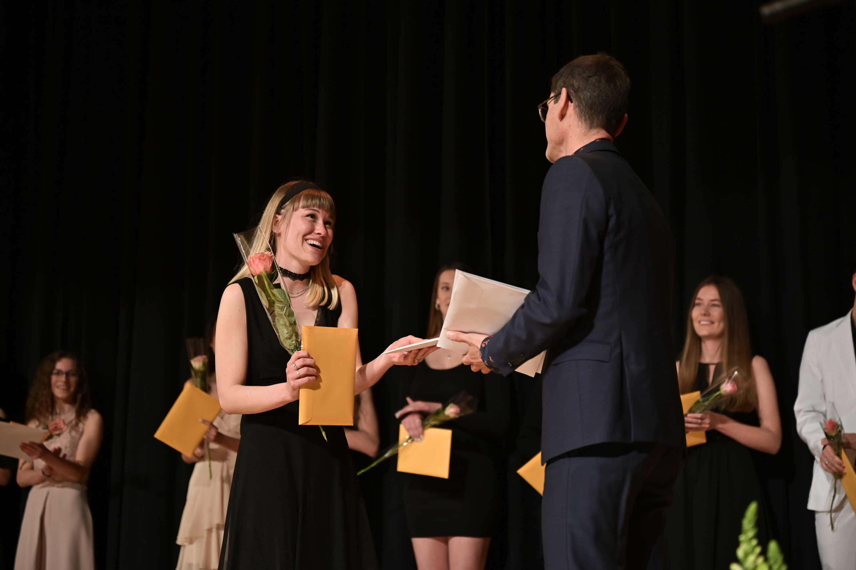 Dennoch stellten natürlich die Zeugnisübergaben den Hauptzweck der Feier dar. Nach dem Lied «I wünsch dir e Rose» durften zwei Kurse aus Basel mit 21 erfolgreichen Absolvent*innen, ein Kurs aus Liestal mit 20, zwei Kurse aus Münchenstein mit 40, ein Kurs aus Oberwil mit 21 und ein Kurs aus Muttenz mit 18 frischgebackenen Fachmaturand*innen ihr Zeugnis und – eben – eine schöne Rose entgegen nehmen. Zudem bekamen alle Fachmaturand*innen, die insgesamt einen Schnitt von 5,25 oder mehr erreicht hatten, eine zusätzliche Urkunde und einen Gutschein überreicht.