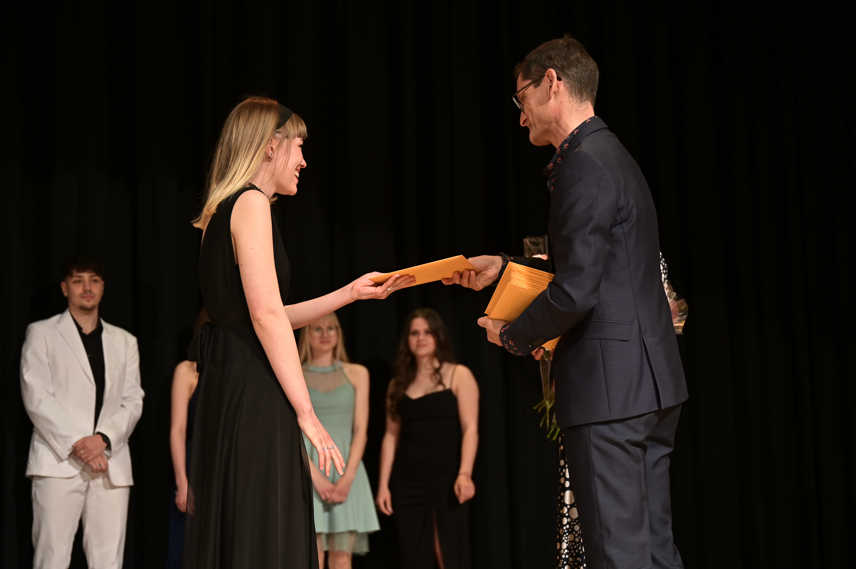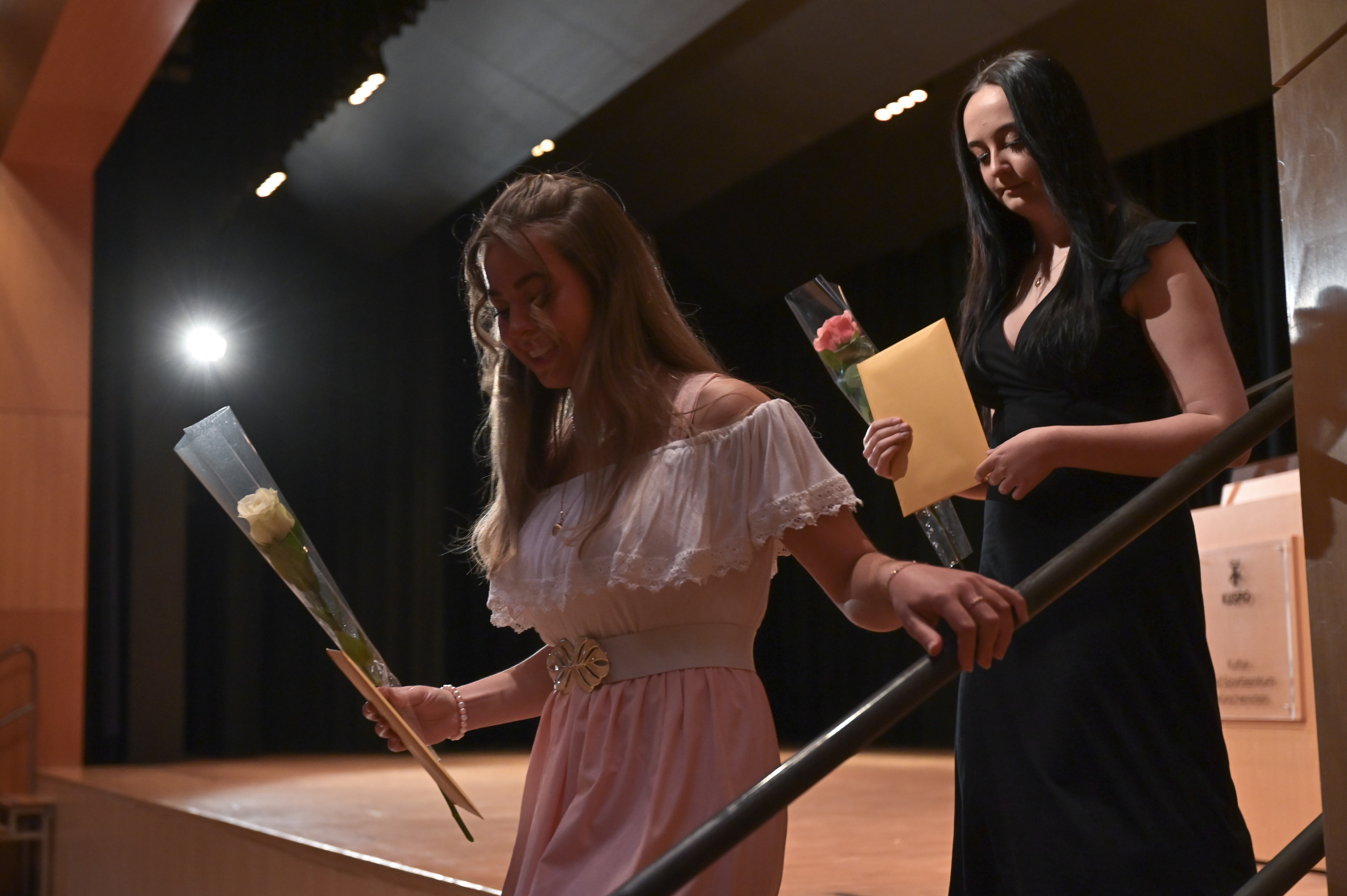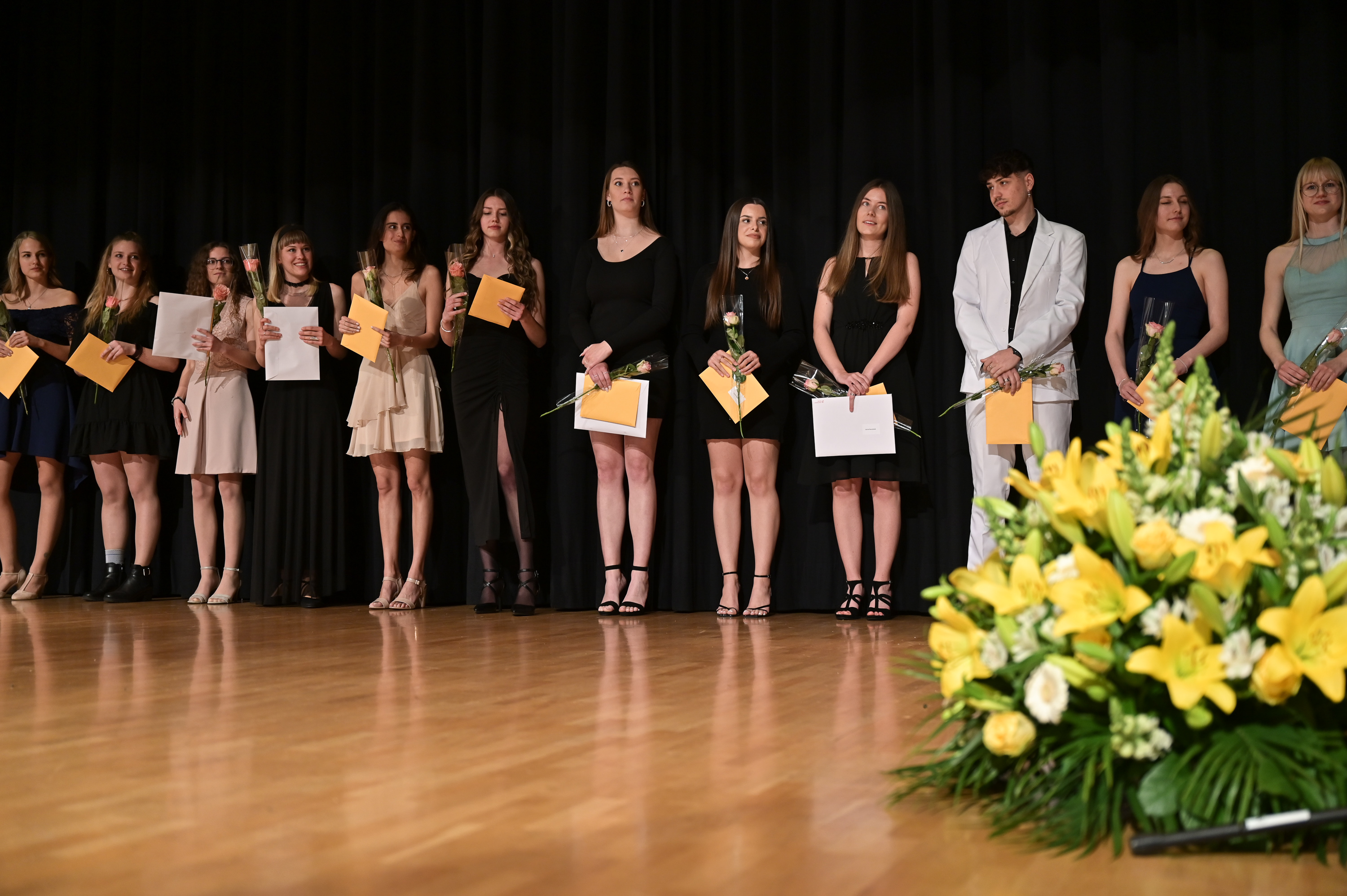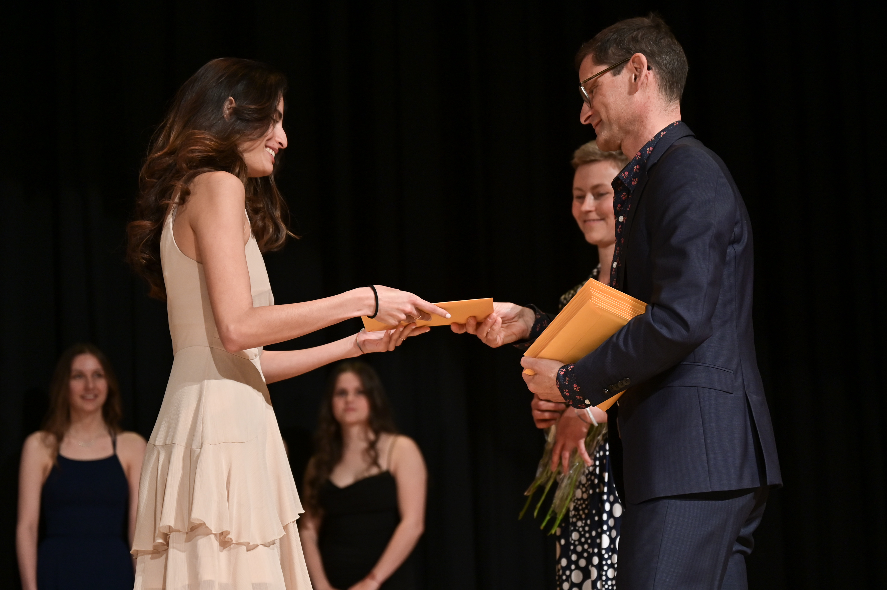 Dennoch stellten natürlich die Zeugnisübergaben den Hauptzweck der Feier dar. Nach dem Lied «I wünsch dir e Rose» durften zwei Kurse aus Basel mit 21 erfolgreichen Absolvent*innen, ein Kurs aus Liestal mit 20, zwei Kurse aus Münchenstein mit 40, ein Kurs aus Oberwil mit 21 und ein Kurs aus Muttenz mit 18 frischgebackenen Fachmaturand*innen ihr Zeugnis und – eben – eine schöne Rose entgegen nehmen. Zudem bekamen alle Fachmaturand*innen, die insgesamt einen Schnitt von 5,25 oder mehr erreicht hatten, eine zusätzliche Urkunde und einen Gutschein überreicht.