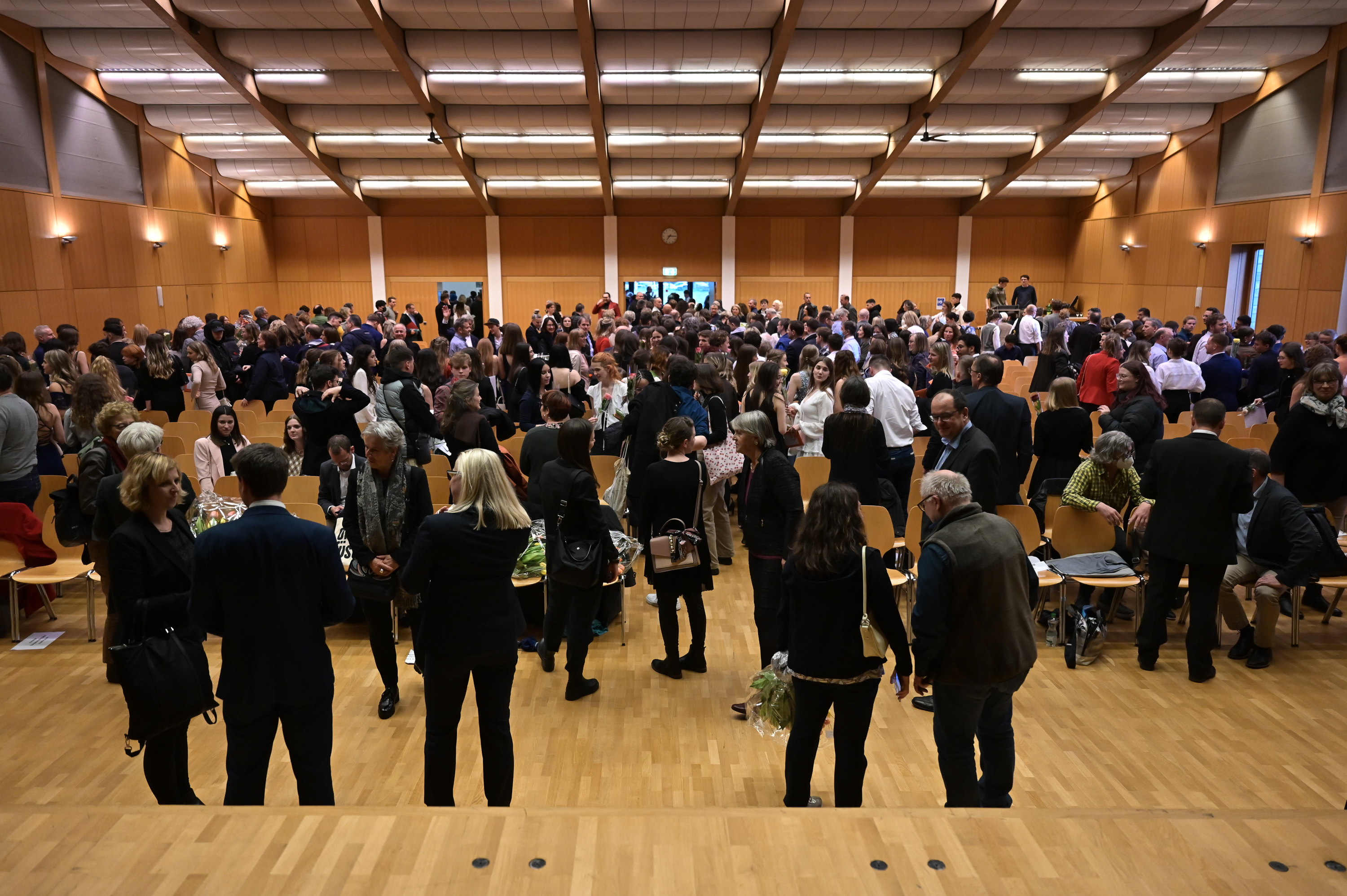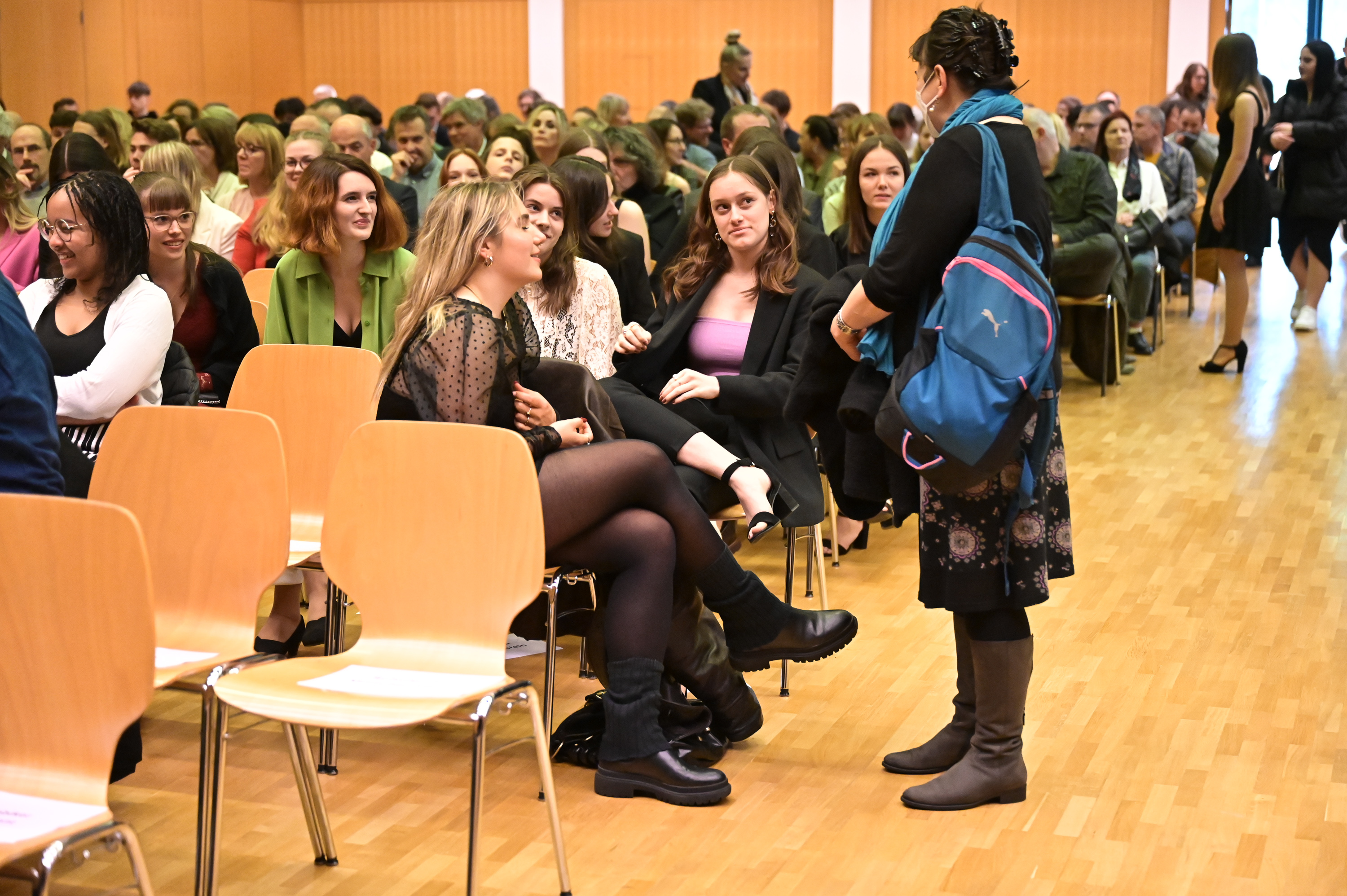120 Fachmaturand*innen aus den Fachmittelschulen von Basel, Liestal, Münchenstein, Oberwil und Muttenz haben sich mit ihren Angehörigen versammelt, als sie vom Leiter der FMS Muttenz, Jan Pagotto, mit einem überraschenden Zitat begrüsst werden: