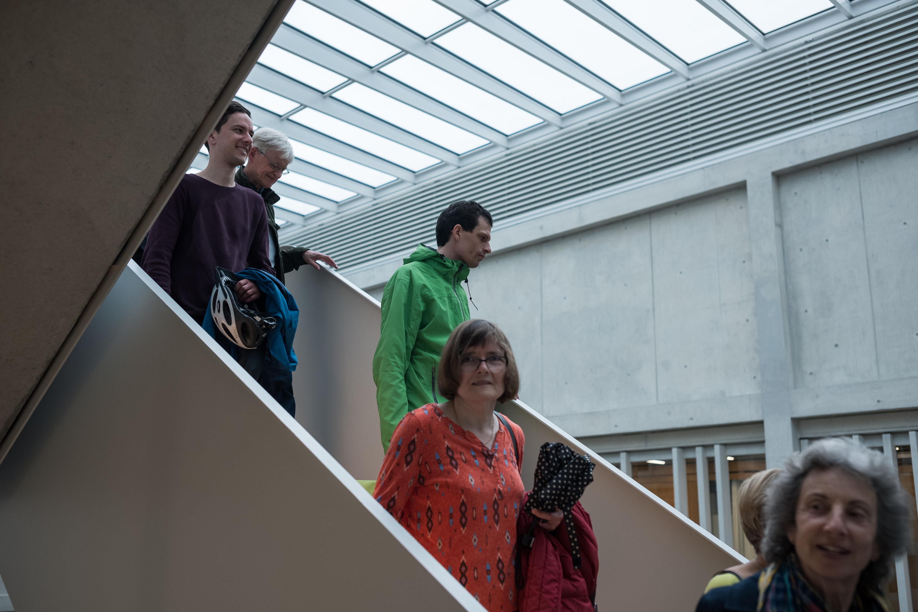 Wir durften viele bauliche und organisatorische Insights über das Nachbargebäude des Gymnasiums Muttenz erfahren. Das MINERGIE-Gebäude besteht aus zwei Untergeschossen, einem Erdgeschoss mit riesiger Galerie und zwölf Obergeschossen. Bei einem solch grossen Gebäude ist auch die Belüftung eine Herausforderung. Ein durchdachtes Überstromkonzept wird dem Bauwerk gerecht: Die Zuluft wird über die Betonrippendecken geleitet, entweicht über Öffnungen an den Wänden ins grosse Atrium und lässt die Abluft über die beiden Lichthöfe zum Dach nach aussen gelangen. Der grosse Park im Aussenbereich dient als Begegnungs -und Erholungszone.