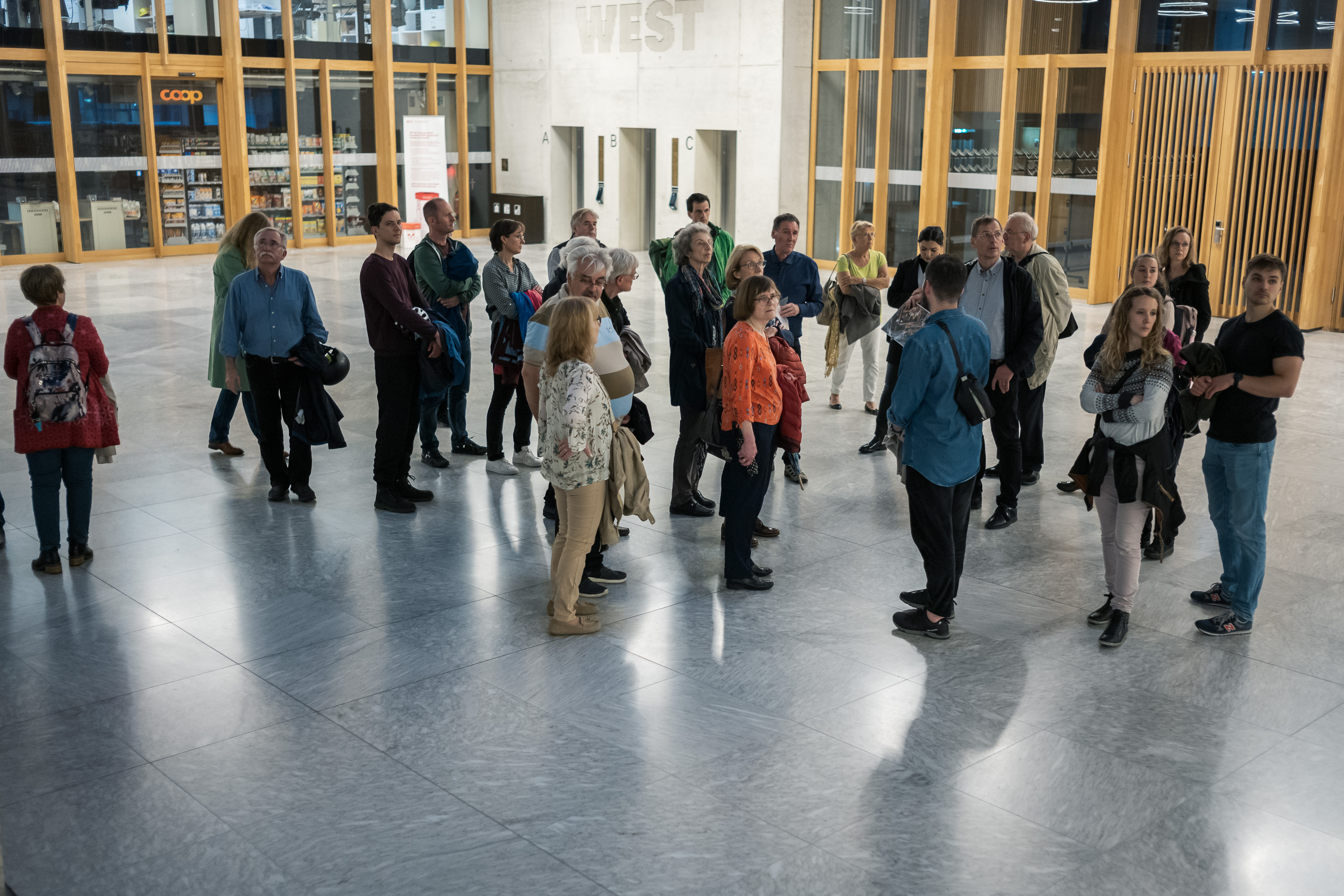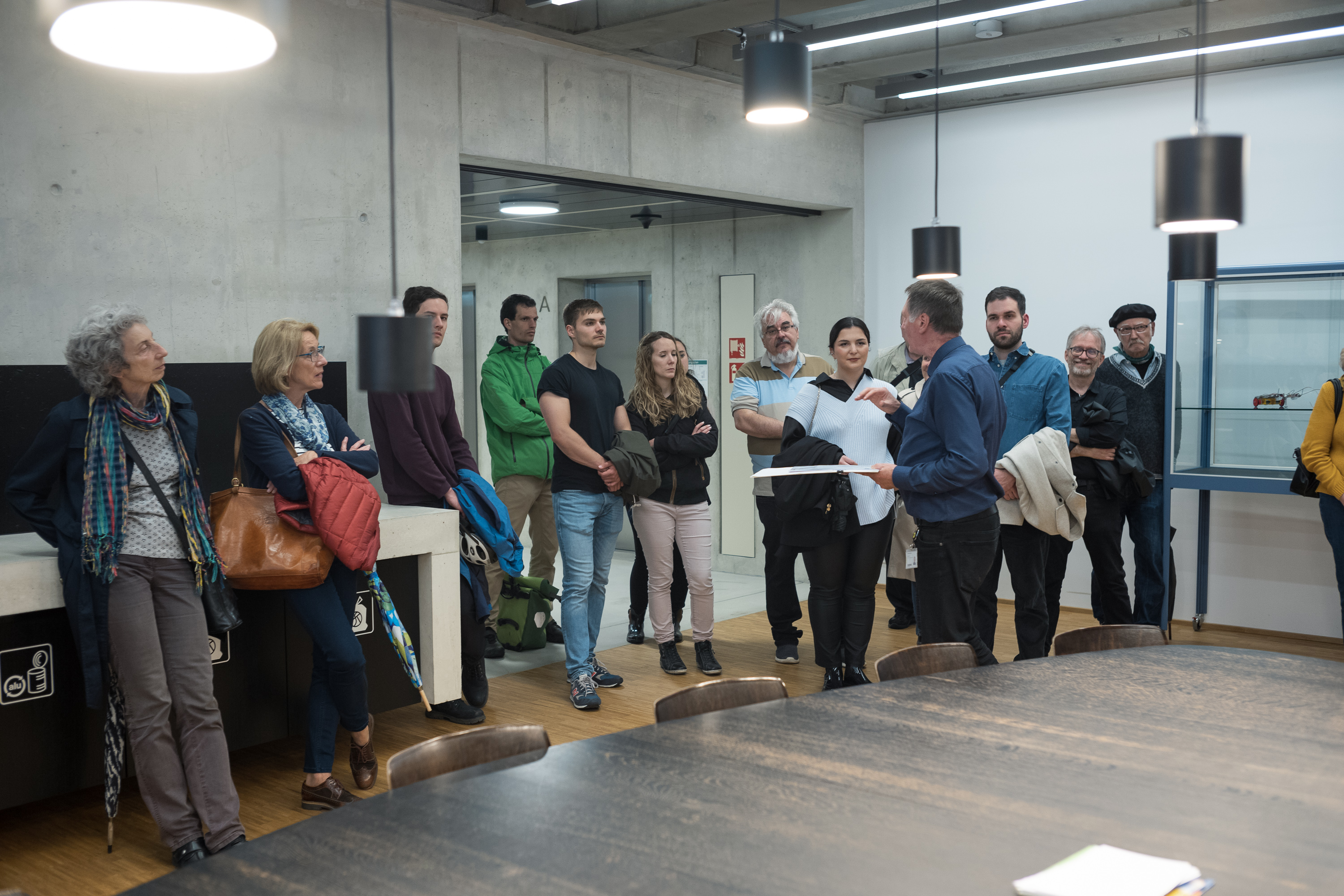 Nachdem wir uns begrüsst und uns über viele Wiedersehen mit ehemaligen Kolleg: innen und Freunden gefreut hatten, begann auch schon die Führung durch das Gebäude. Oswald Hari, Studiengangleiter des Bachelor am Institut für Architektur, führte uns durch den eindrucksvollen 350’000-Kubikmeter-Würfel.