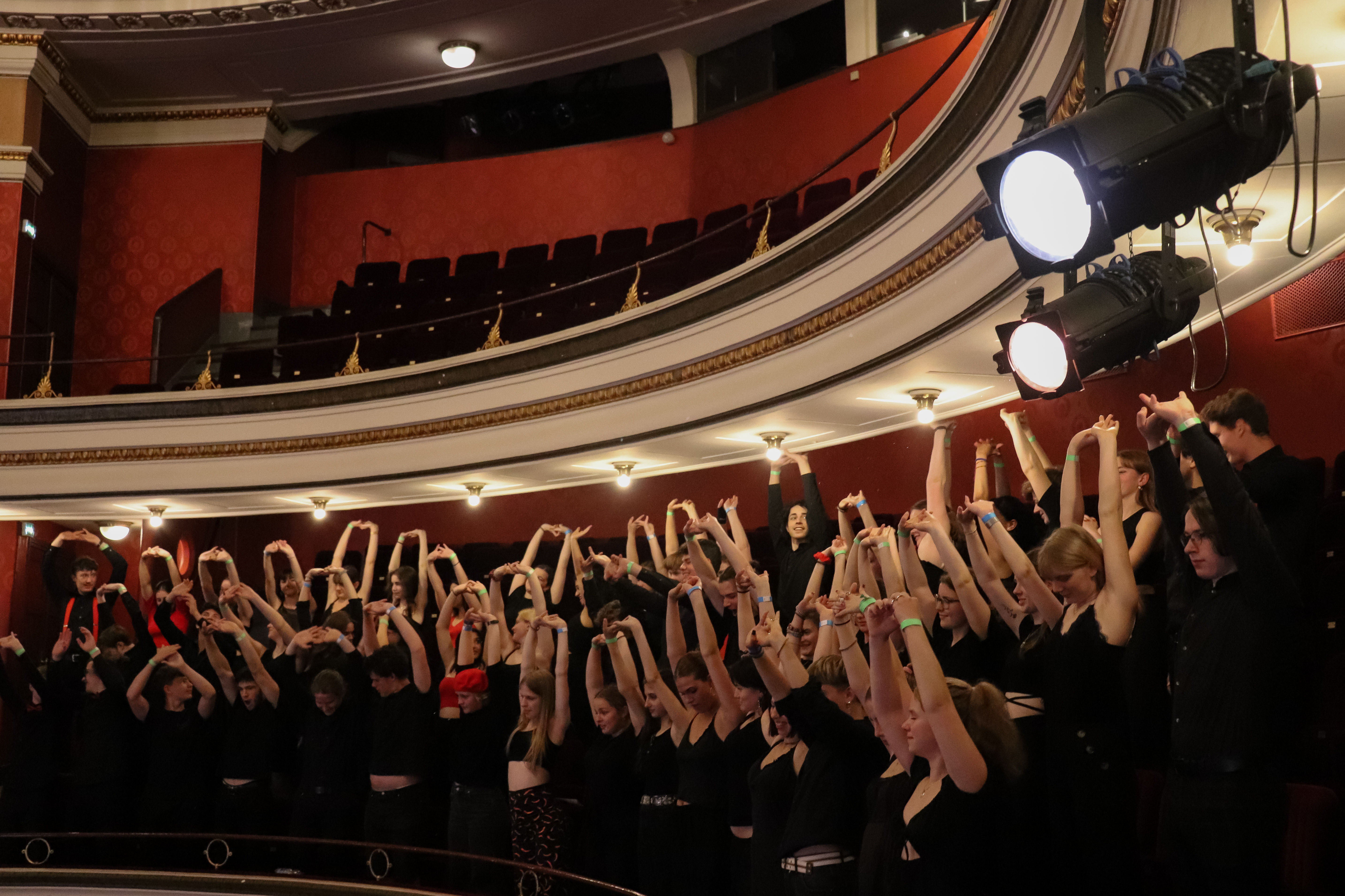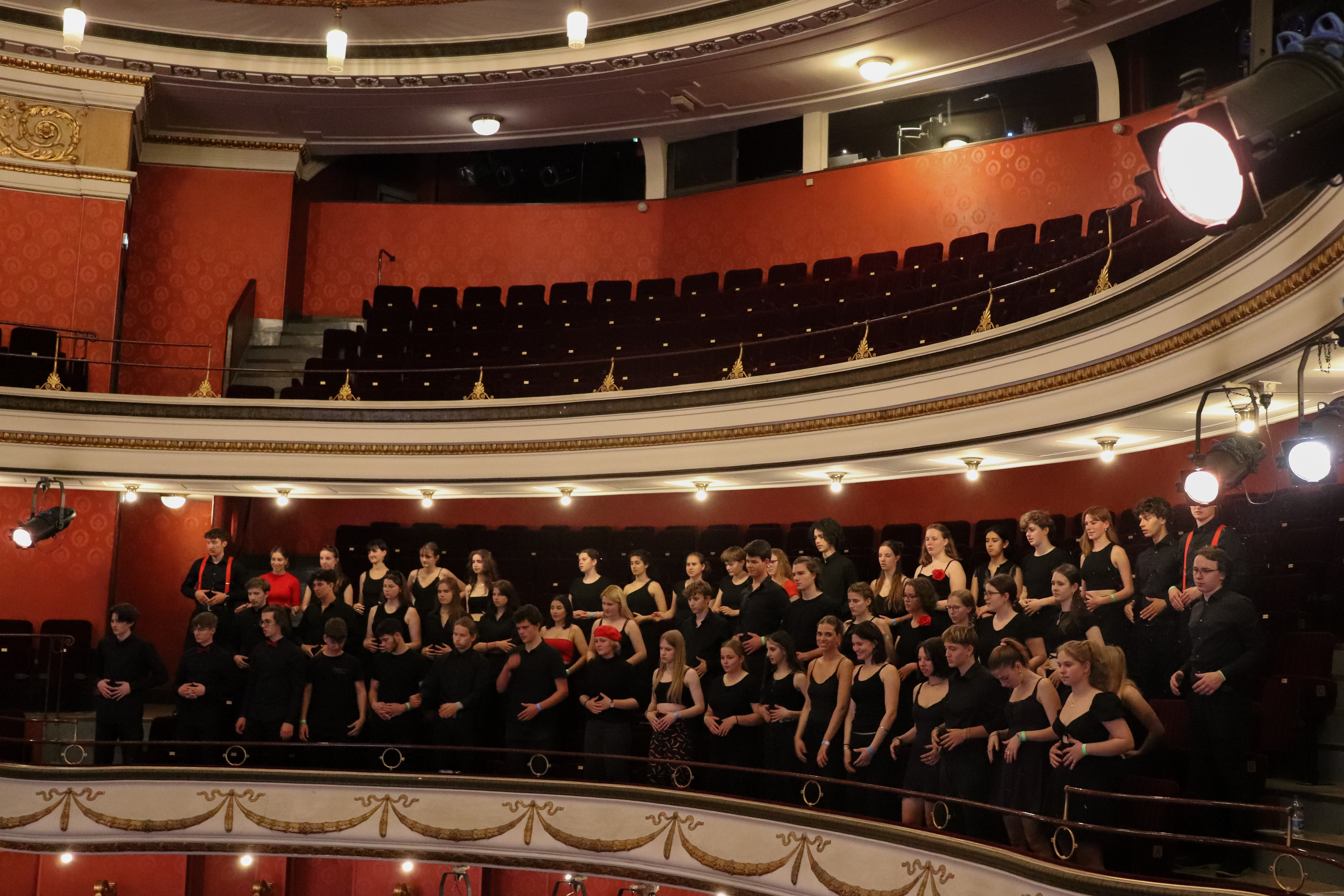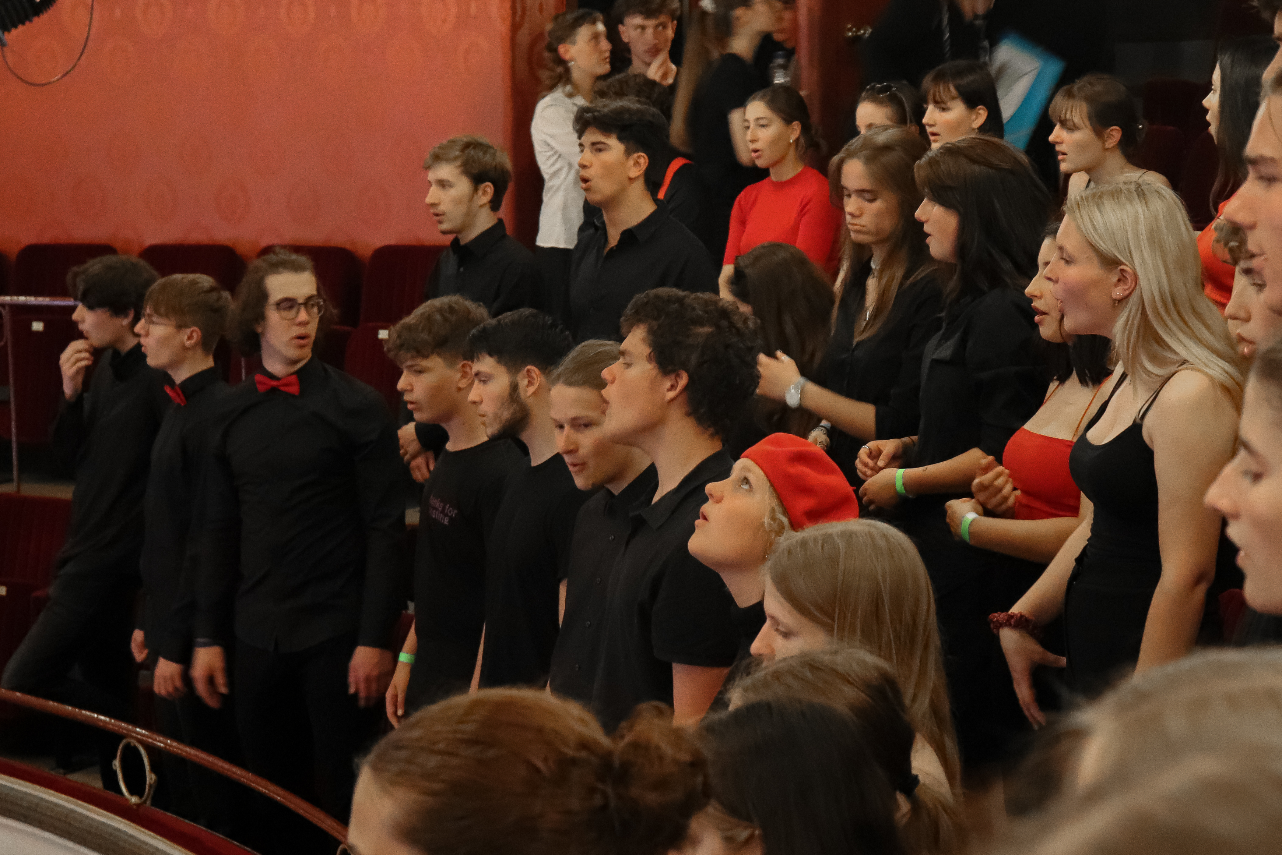 Danach hatten wir eine Dreiviertelstunde Zeit, um essen zu gehen oder die Stadt zu erkunden. Die meisten machten sich auf die Suche nach etwas Essbarem und so kam es, dass wir Einheimische ansprechen und Französisch reden mussten. Im Endeffekt waren aber alle, trotz Sprachbarriere, glücklich am Essen. Nach dem Essen gingen wir zurück zum Rathaus, wo der vereinbarte Treffpunkt war. Anschliessend zogen wir schon los zum Theater. Kaum angekommen stieg die Aufregung immer mehr. Endlich gingen die Türen auf und eine Frau führte uns zu einer Garderobe. Das Theater war noch viel grösser als erwartet. In der Garderobe konnten wir unsere Sachen hinlegen und uns umziehen, dann ging es auch schon in den Saal. 64 Schüler*innen des Gymnasiums und der FMS Muttenz drängten sich zusammen auf den doch relativ engen Balkon des Saales. Es waren viele Primarschulchöre dabei, es war toll zu sehen, wie gut diese Kinder schon singen konnten. Ansonsten gab es noch zwei weitere Chöre, die in unserer Altersklasse waren.