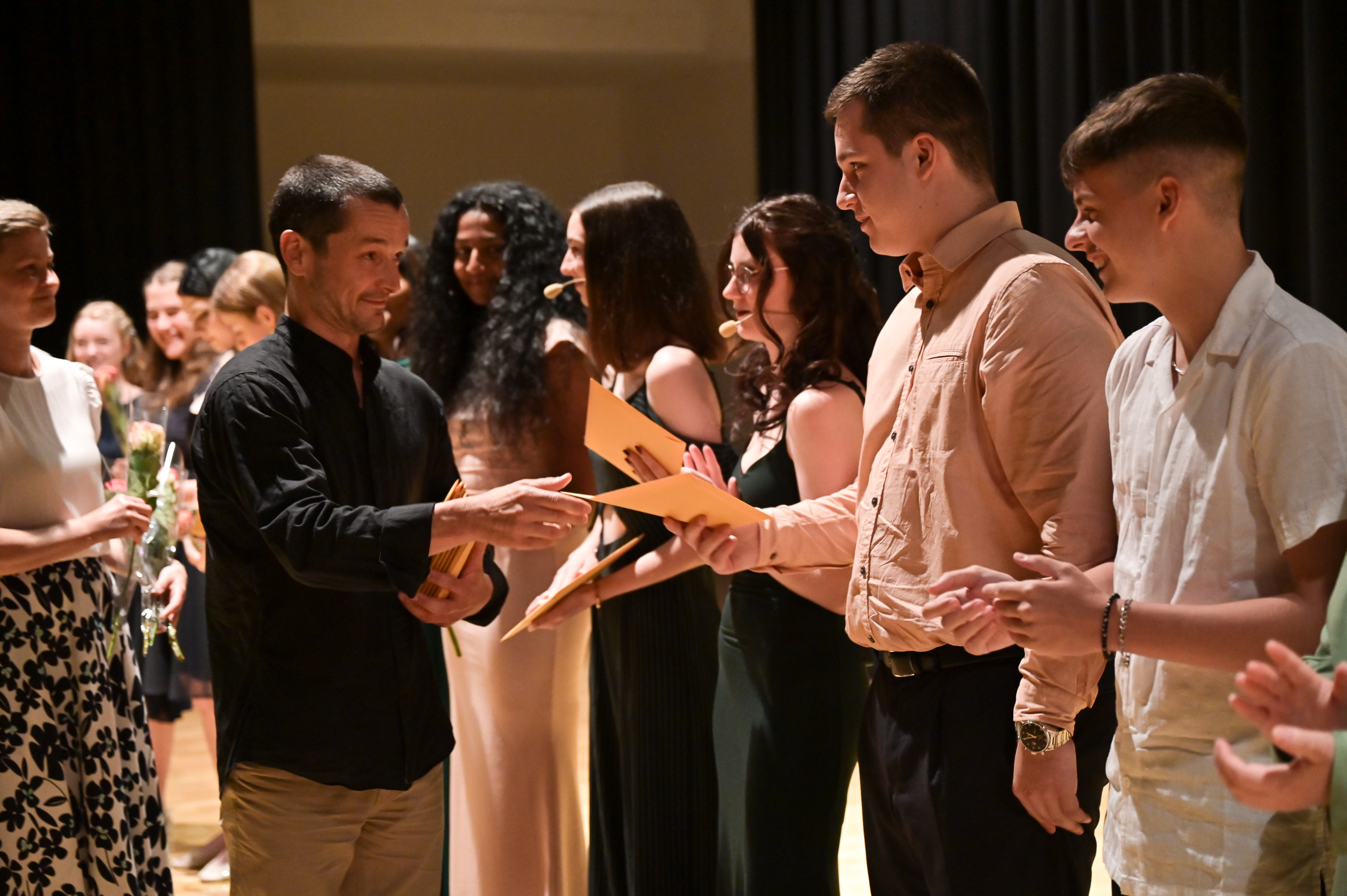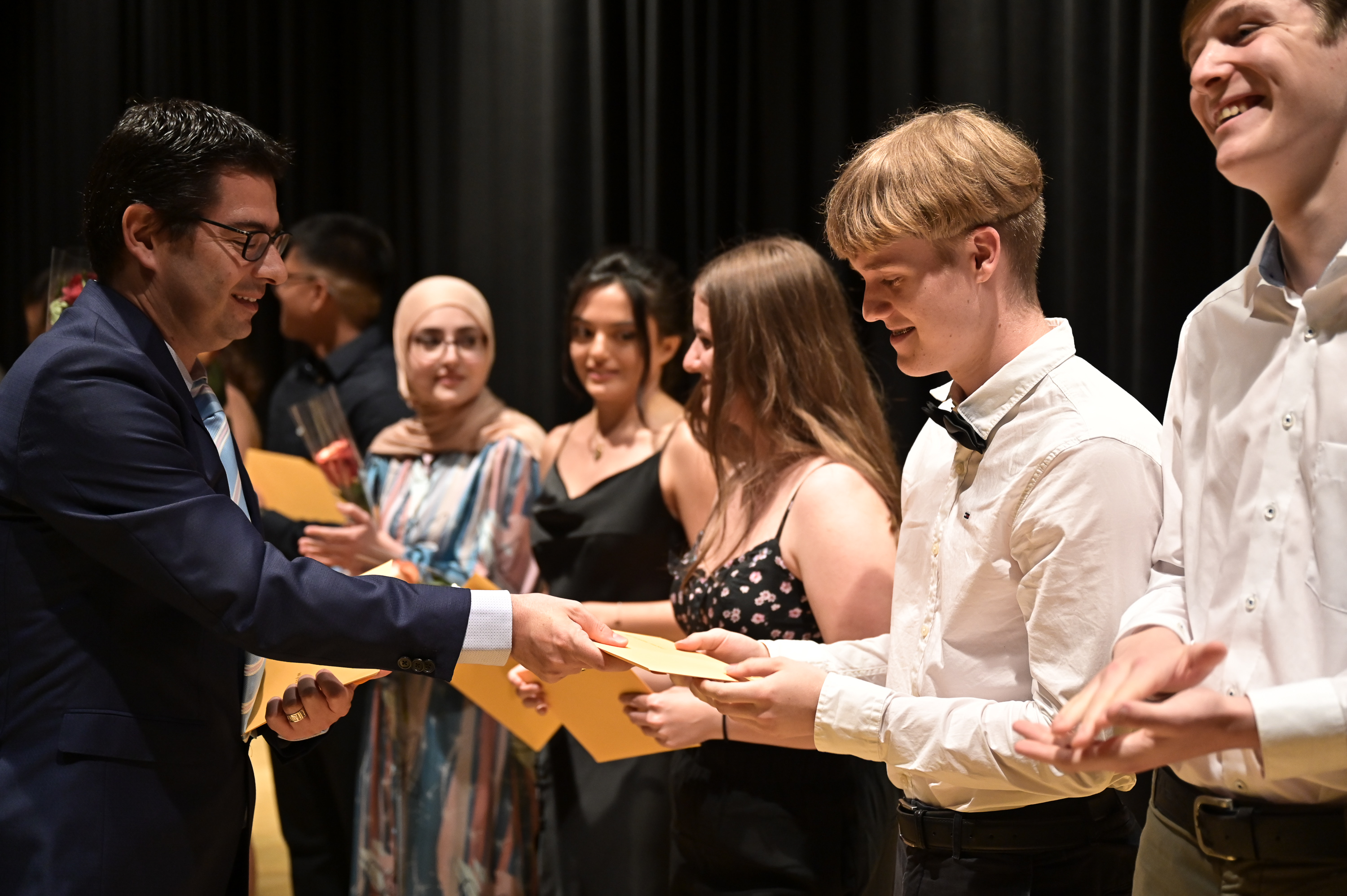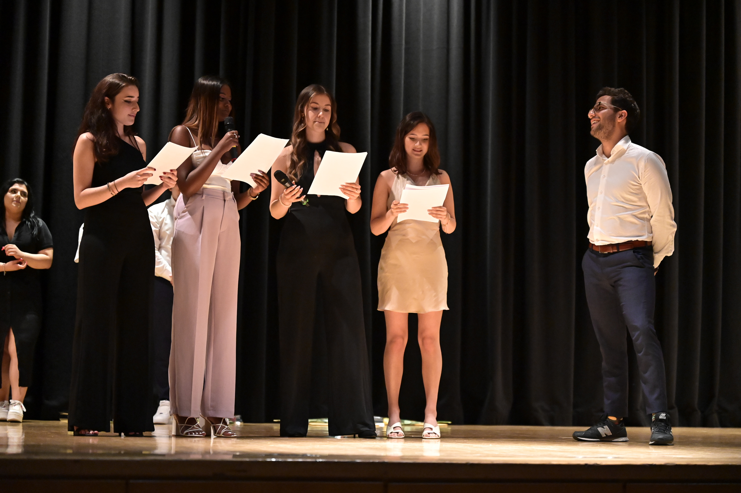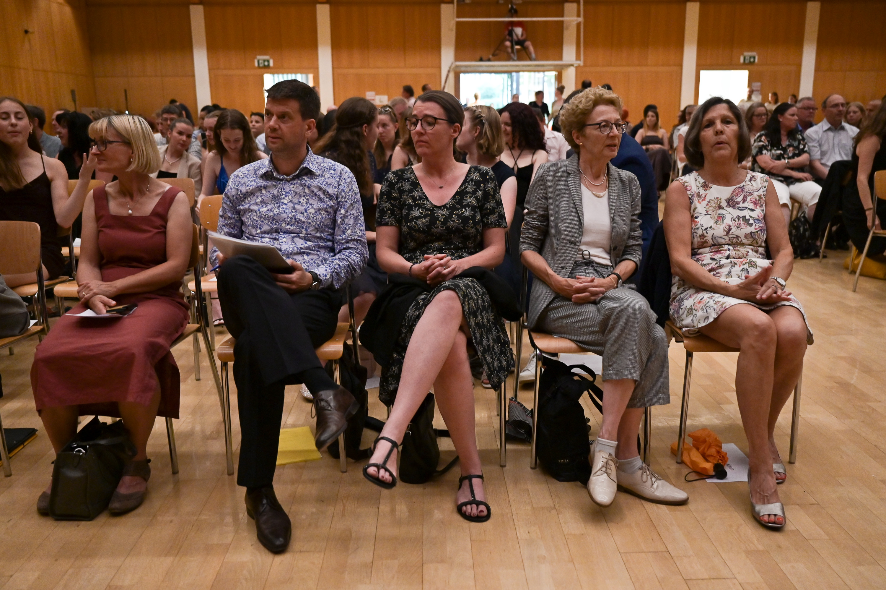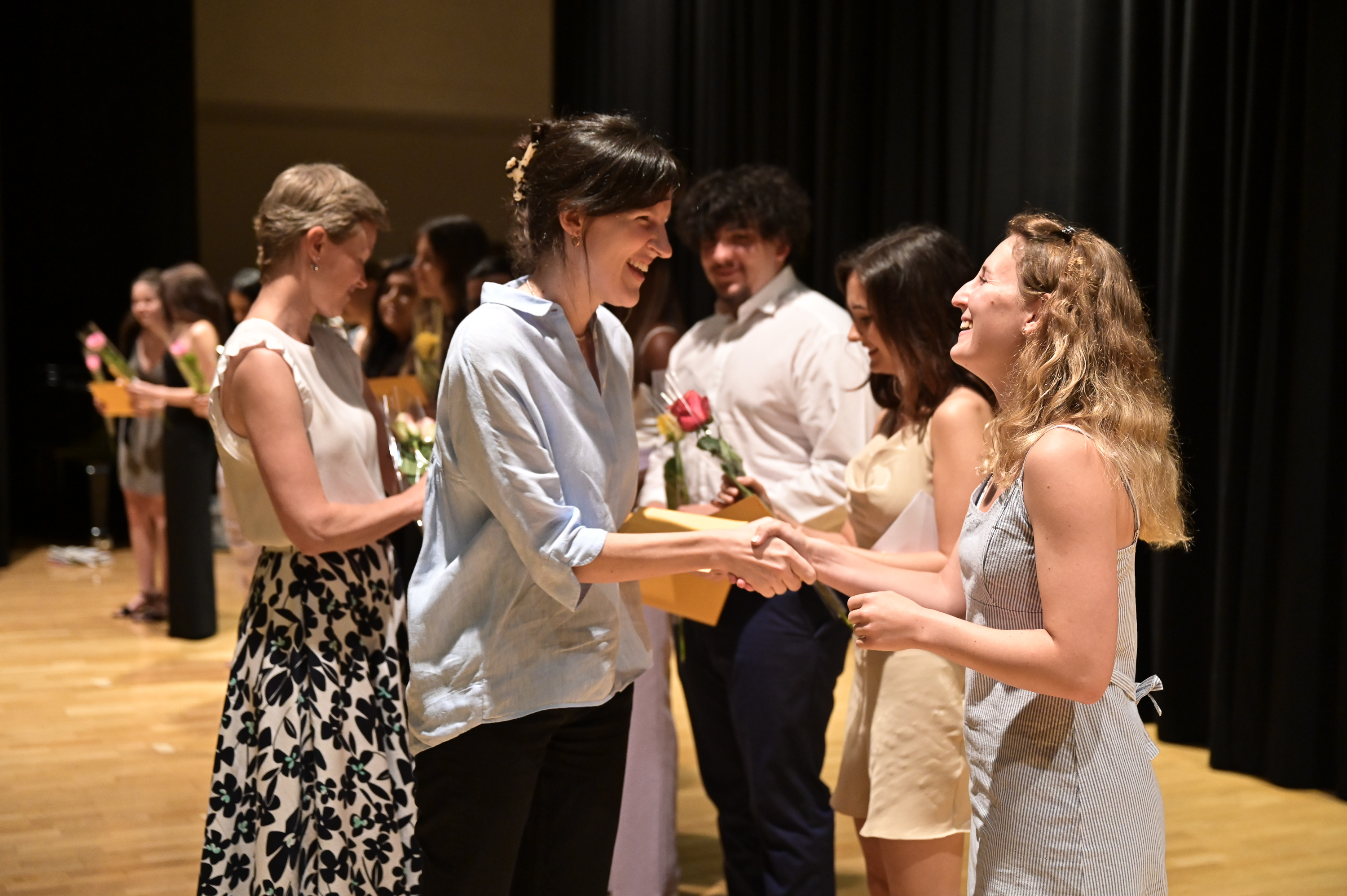 Die Klassenlehrpersonen übergaben die Abschlusszeugnisse, die Klassen bedankten sich mit Reimen und mit weiteren kreativen sowie musikalischen Beiträgen. Als Jahrgangsbeste wurden ausgezeichnet: Laura Berweger mit einem Notenschnitt von 5.8 und Noah Barretta mit einem Schnitt von 5.3. Das Publikum tanzte Macarena, oder versuchte es zumindest. Brigitte Jäggi als Rektorin des Gym Muttenz verabschiedete den FMS-Leiter Jan Pagotto und die beiden Moderatorinnen Chiara Colonnello und Liliane Dietschi (beide F3a) luden ein zum Apéro, den die Klasse F2d servierte.