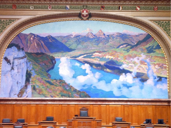 Anschliessend an das Treffen mit Herrn Walker hat die Klasse 3Ea der Sommersession des Nationalrats einen Besuch abgestattet. Auch wenn wir nicht ganz nachvollziehen konnten, worüber die Nationalrät*innen gerade abstimmten, war es interessant, die Parlamentarier*innen in Aktion zu sehen. Leider war die Sitzung mit dem Satz «Geniessen Sie die Mittagspause, die Session ist bis um 15:00 unterbrochen» früher als geplant zu Ende. Während wir darauf warteten, von einem Securitas Mitarbeiter abgeholt zu werden, vertrieben wir uns die Zeit damit, im Gemälde über dem Rednerpult im Nationalratssaal den darin abgebildeten, ziemlich deplatzierten Fisch zu suchen.