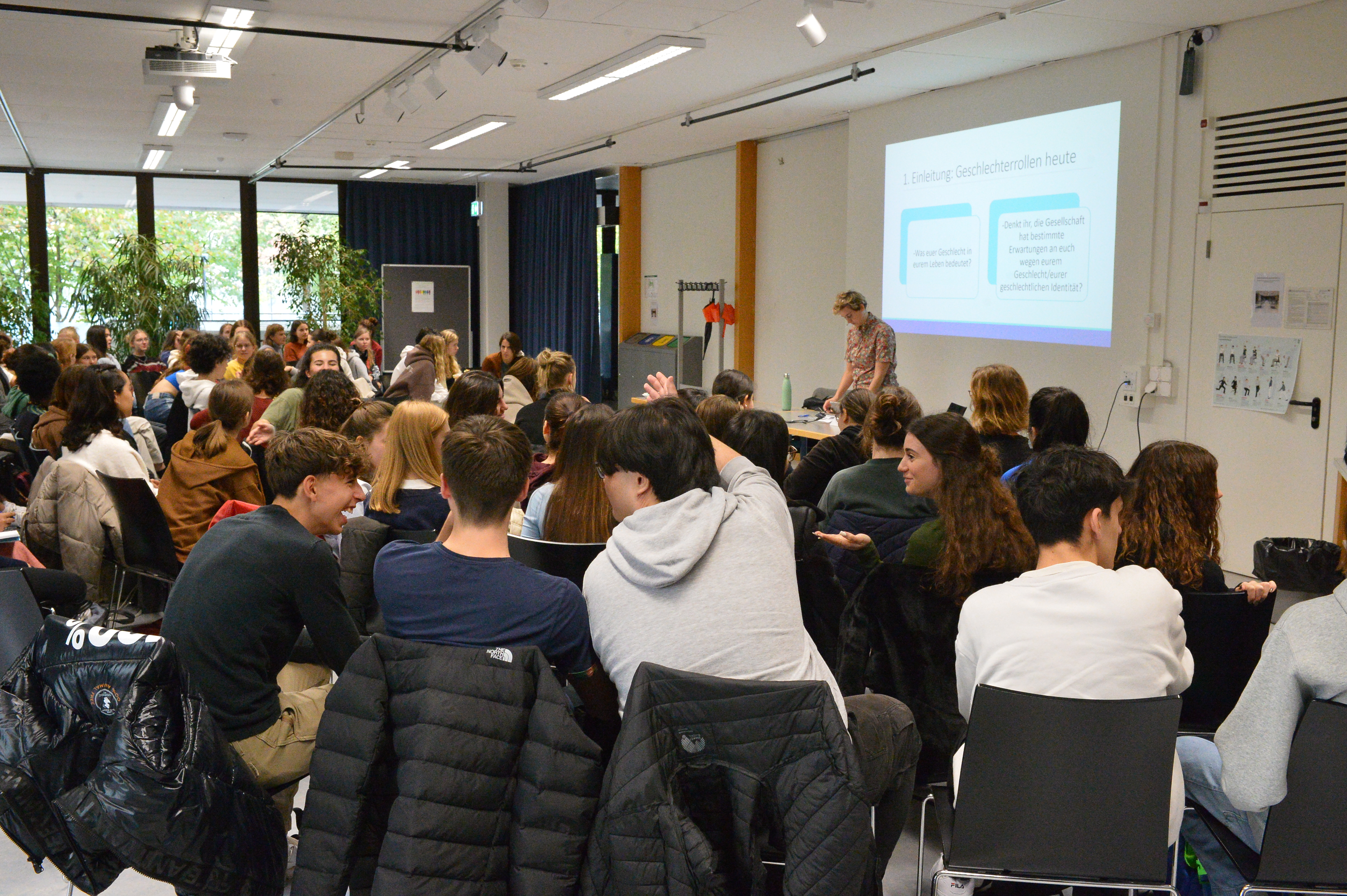 „Von Königen in Strumpfhosen und willensstarken Frauen – die Geschlechterrollen früher und heute“- so heisst der Titel. Das Mikrophon hält Frau Reichel, sie stellt Frau Bürgi vor. Frau Bürgi – oder doch lieber Sophie, denn im ersten Moment schlägt sie vor, dass wir uns duzen – hat Gender Studies an der Universität Basel studiert und möchte uns nun einen Einblick geben in die Evolution der Geschlechterrollen, wie sie früher ausgesehen haben und wie sie so geworden sind, wie sie heute sind.