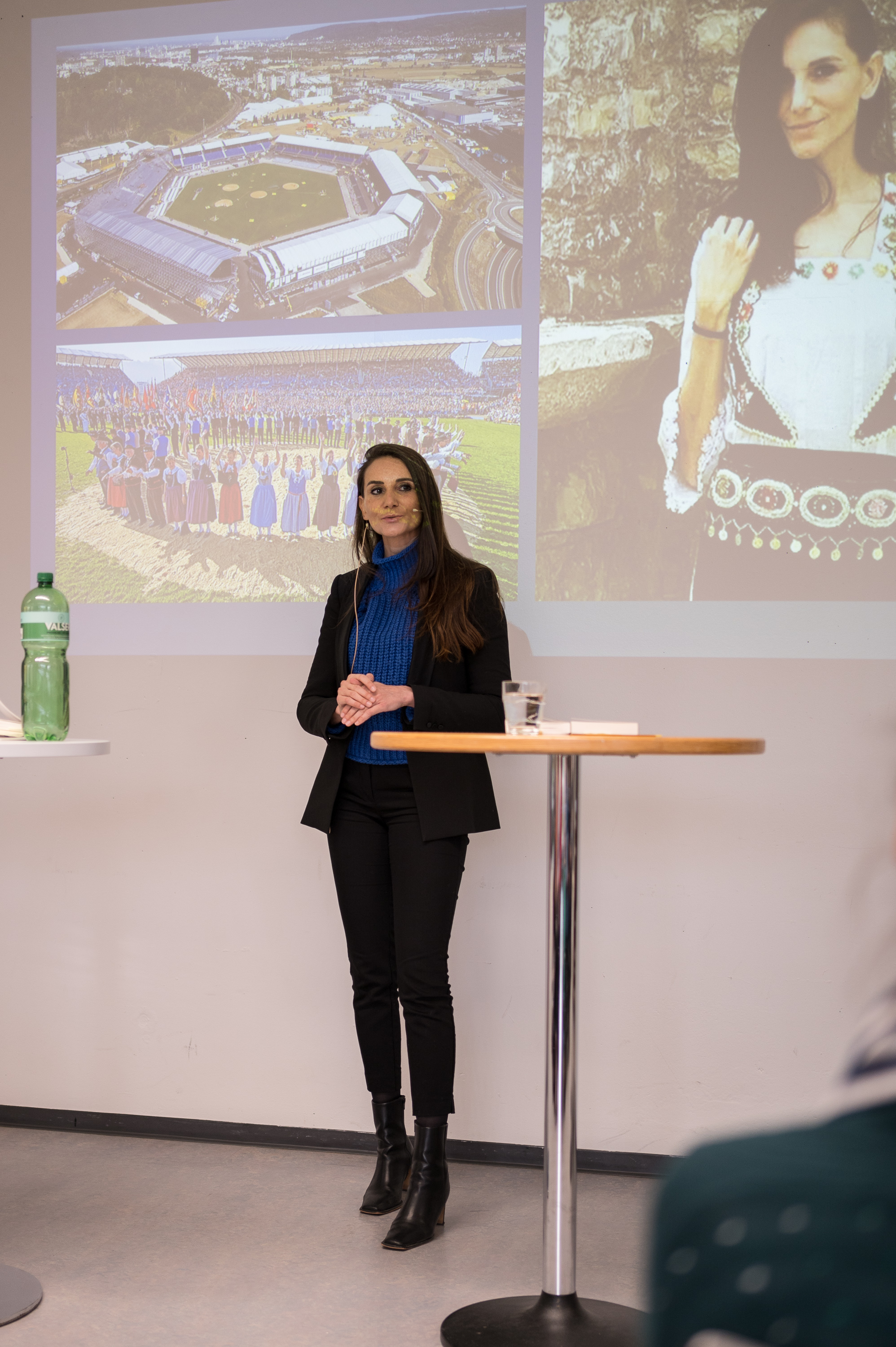 Shqipe Sylejmani ist 1992 von Pristina nach Muttenz gezogen. Sie erzählt uns von ihrer Kindheit und den Herausforderungen mit der Sprache, in der Schule oder der Lehrstelle. Während sie Baseldytsch redet, höre ich doch manchmal ihren albanischen Akzent heraus. Sie vergleicht den Migrationshintergrund jeglicher Personen mit einem Bär mit Kostüm. Man trägt diesen immer mit und er steht immer hinter einem wie eine Bürde. Fatjona Haziri fragt: «Wird aber d’Bürde und de Bär kleiner und viellicht zu mene Kuschelbär?» Auf diese Frage antwortet Shqipe, dass der Bär immer dabei sein wird. Es gibt andere Menschen, die schon nur wegen ihrem Aussehen diskriminiert werden. Wir sollten uns immer anpassen und ja nicht auffallen, aber irgendwann mag man nicht mehr. Wir wollen uns zeigen, wie wir sind und sagen: «Jetzt längts! Ich misch beidi Kulture zemme.» Sie und ihre Familie haben nicht alles vom Kosovo aufgegeben, um sich dann hier in der Schweiz unterdrücken zu lassen, weil wir auffälligere Namen haben oder anders aussehen. Die Autorin fragt sich selbst und doch hat sie auch das Publikum damit angesprochen, denn ich merke, wie ich mir selbst die Frage stelle und andere um mich herum auch. «Was heisst es, Wurzeln von einem anderen Land zu haben? What is my heritage?» Momentan sitze ich auf diesem Holzstuhl in einem staatlichen Gebäude mitten in Muttenz und nicht auf dem weissen Plastikstuhl in meinem Garten mitten in Skopje. «Wie, du bist Albenerin aus Skopje? Hä, bist du nicht Mazedonierin?» Als Allererstes heisst es Nordmazedonien, schon seit Jahren. Zweitens gibt es uns Albaner*innen überall; Montenegro, Kosovo, Nordmazedonien, Serbien, Italien etc. Wir haben alle die gleichen Wurzeln. Sind aber wie ein Baum verteilt, der seine Äste und Zweige in den Himmel hinaus verteilt. Alle sind Albaner*innen, aber unterschiedliche Arten von ihnen. Wie Granit Xhaka ein albanischer Fussballspieler aus der Schweiz ist, ist Milot Rashica einer aus dem Kosovo. Wie Ismail Kadare ein Autor aus Albanien ist, ist Shqipe Sylejmani eine aus der Schweiz. Shqipe Sylejmani erzählt uns, dass sie Real Madrid-Fan ist und die Jungs im Publikum werden froh und erwähnen Ronaldo. Sie sagt, dass der Fussball wichtig ist, weil er alle zusammenkommen lässt und jede*r froh ist, egal welche Nationalität der Fussballspieler hat. Alle spielen zusammen und es ist nur wichtig, wer besser spielt und wer nicht. Das stimmt nicht unbedingt, denn die Politik wird sehr oft eingemischt, auch wenn es heisst: «Politik gehört nicht ins Stadion». Ein Beispiel dafür haben wir ein paar Tage nach der Veranstaltung mit Shqipe Sylejmani an dieser WM gesehen, als die Schweiz gegen Serbien spielte. Am letzten Gruppenspiel vom 2.12. spielte nicht nur der Ball quer über das Feld, sondern auch die Nationalität eine sehr grosse Rolle. Serbien kämpfte sozusagen eher gegen Albanien als gegen die Schweiz. Zudem kam es noch zu Auseinandersetzungen zwischen den Spielern und zu nationalistisch motivierten Gesten beider Seiten.