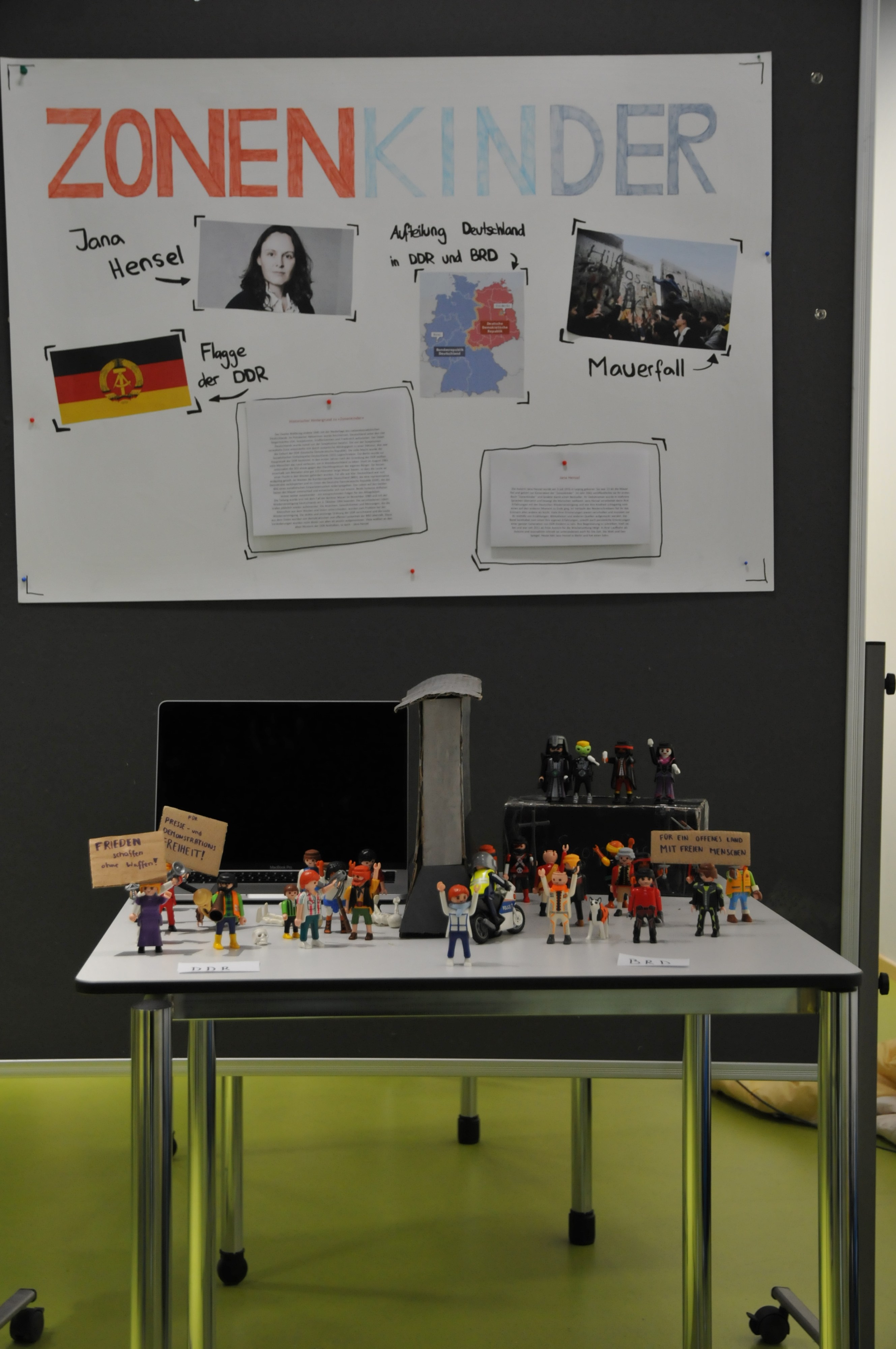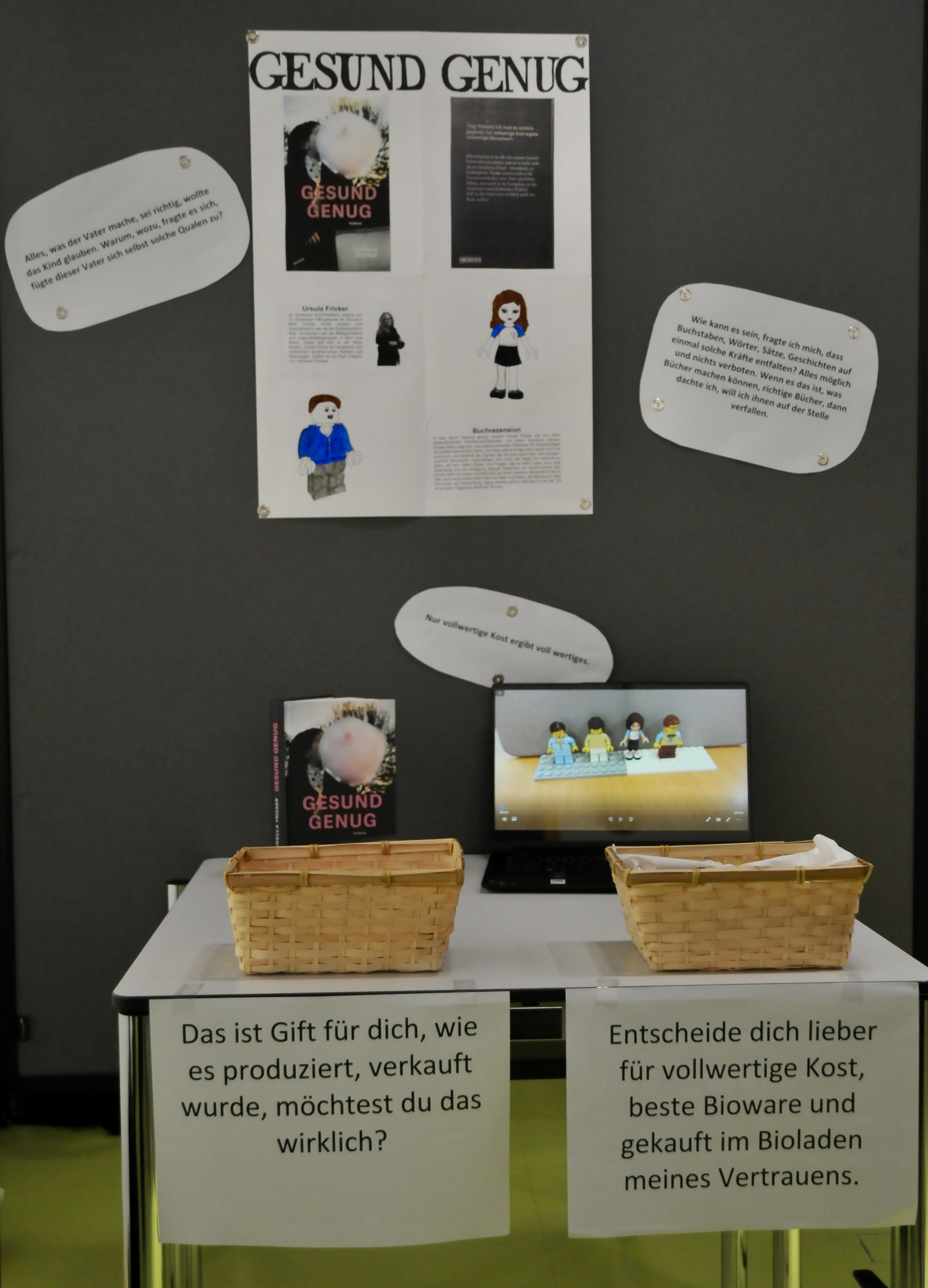 Wie kann man anderen ein Buch schmackhaft machen? Diese Frage beantworteten die Schüler*innen der ersten FMS-Klassen ganz unterschiedlich. Der Büchertisch auf dem Titelbild zu Jana Hensels „Zonenkinder“ zeigt eindrücklich, wie aktuell manche der Themen sind, die in den gelesenen Werken behandelt werden. Andere wiederum stellten tatsächlich etwas zu essen auf den Büchertisch, um potenzielle Leser*innen anzulocken. Dieses Element des Büchertisches hatte aber immer etwas mit der Handlung des vorgestellten Werkes zu tun, zum Beispiel bei den Büchern „Gesund genug“ von Ursula Fricker oder „Tauchertage“ von Christoph Steier. Im einen geht es um zu gesunde Ernährung, im anderen um Bulimie.