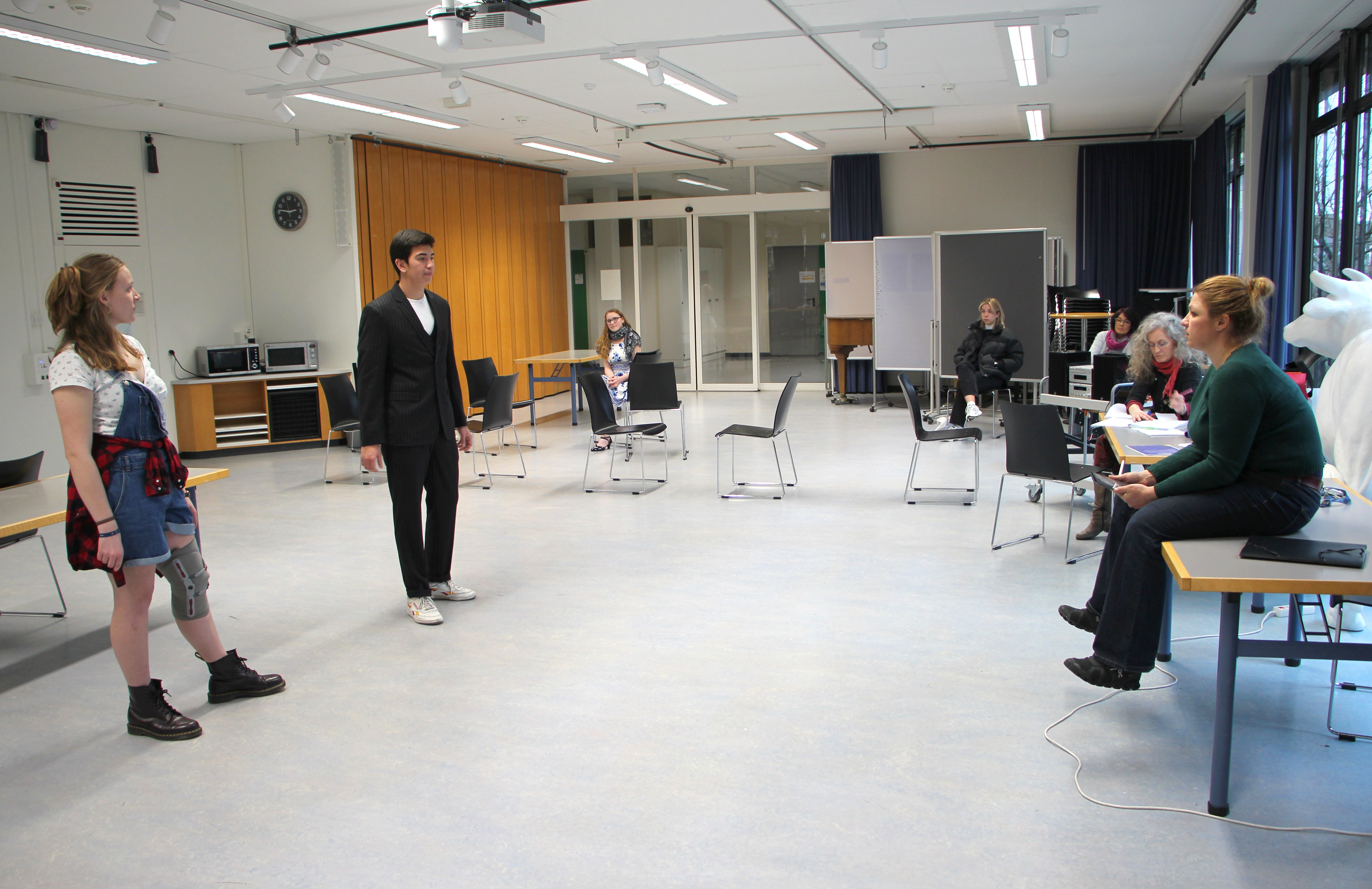 Für die Mitwirkenden geht eine intensive Zeit ihrem Höhepunkt entgegen: Nach der Projektentwicklung während dreier Lektionen pro Woche und etlichen Zusatzproben an Wochenenden im Rahmen des schulischen Unterrichts hält die Gruppe mit dem heutigen Tag Einzug ins Theater Roxy, wo der erfahrene Beleuchtungs- und Tontechniker Lukas Schweizer sie ins vorteilhafteste Rampenlicht rücken wird. Damit ist die Bühne bereitet für die Aufführungen in der kommenden Woche, die – der Tradition des Wahlkurses gemäss – in englischer Originalsprache gespielt werden.