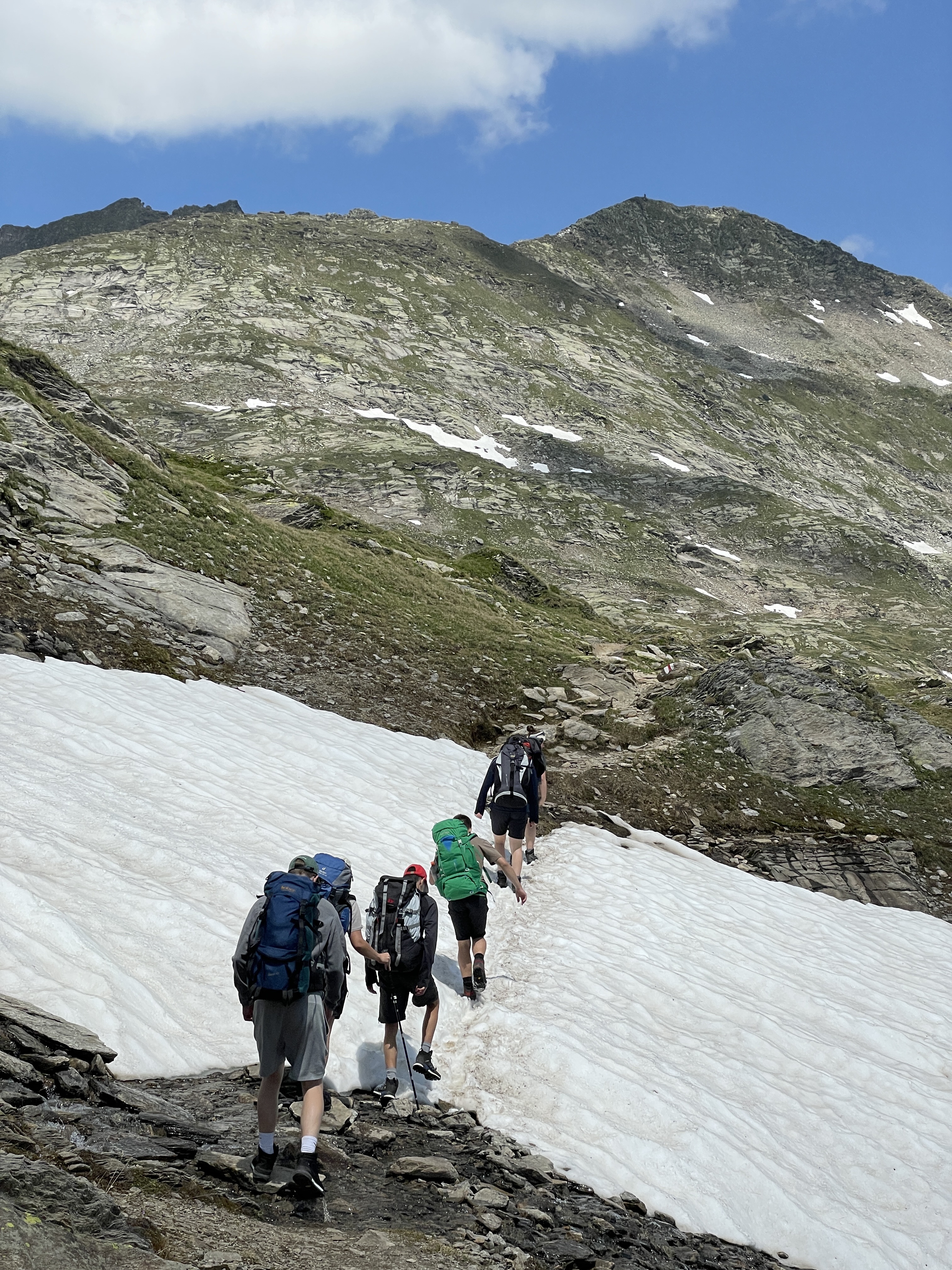 Nach diesem übermotivierten Start ging es ganz nach dem Motto« Mit dem Gipfel auf den Gipfel» weiter: Dank Frau Kowalska und Frau Wartbichler durften wir im Zug alle genüsslich in ein Laugengipfeli beissen und die letzten Energiespeicher für den ersten Wandertag füllen. Nach der fast 4-stündigen Zugfahrt ins Tessin, ging es von Ambri-Piotta mit dem Bus weiter bis zur Station der Standseilbahn Piotta Centrale. Von dort aus führte uns die Funicolare (ital. Für Standseilbahn) ganz gemütlich auf 1796 m.ü.M hinauf nach Piora. Ganz nebenbei erwähnt, gehört die Ritom-Standseilbahn mit einer maximalen Steigung von 87,8 % zu einer der steilsten, öffentlich zugänglichen Standseilbahnen der Welt. Oben angekommen, galt es, die folgenden 861 Höhenmeter hinauf zur Capanna Cadlimo zu bewältigen. Der Wanderweg führte uns mit stetiger Steigung vorbei an 4 Seen, dem grossen Lago Ritom, Lago di Tom, Lago Scuro, dem Lago di Dentro und mehreren kleinen Tümpeln. Am Lago Scuro wartete dann eine Überraschung auf uns. Die ersten Schneefelder waren in Sicht, welche mit äusserster Vorsicht überquert wurden.