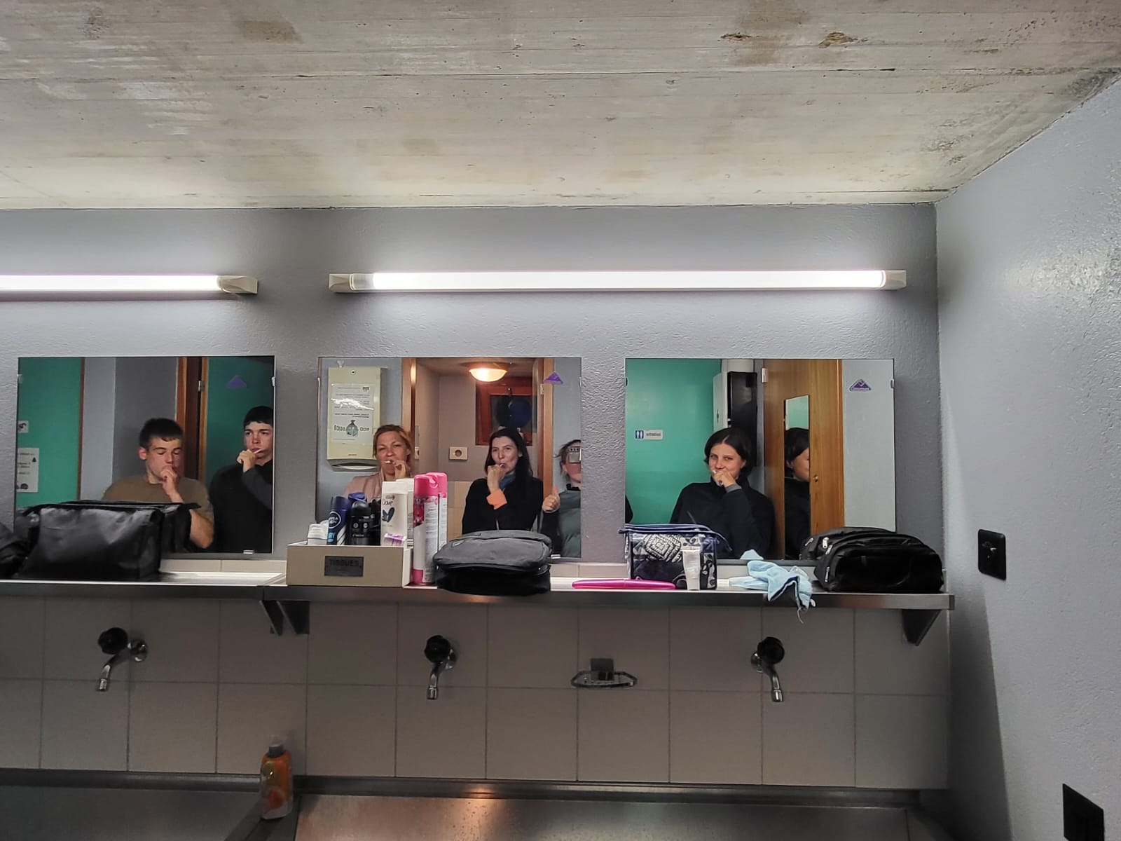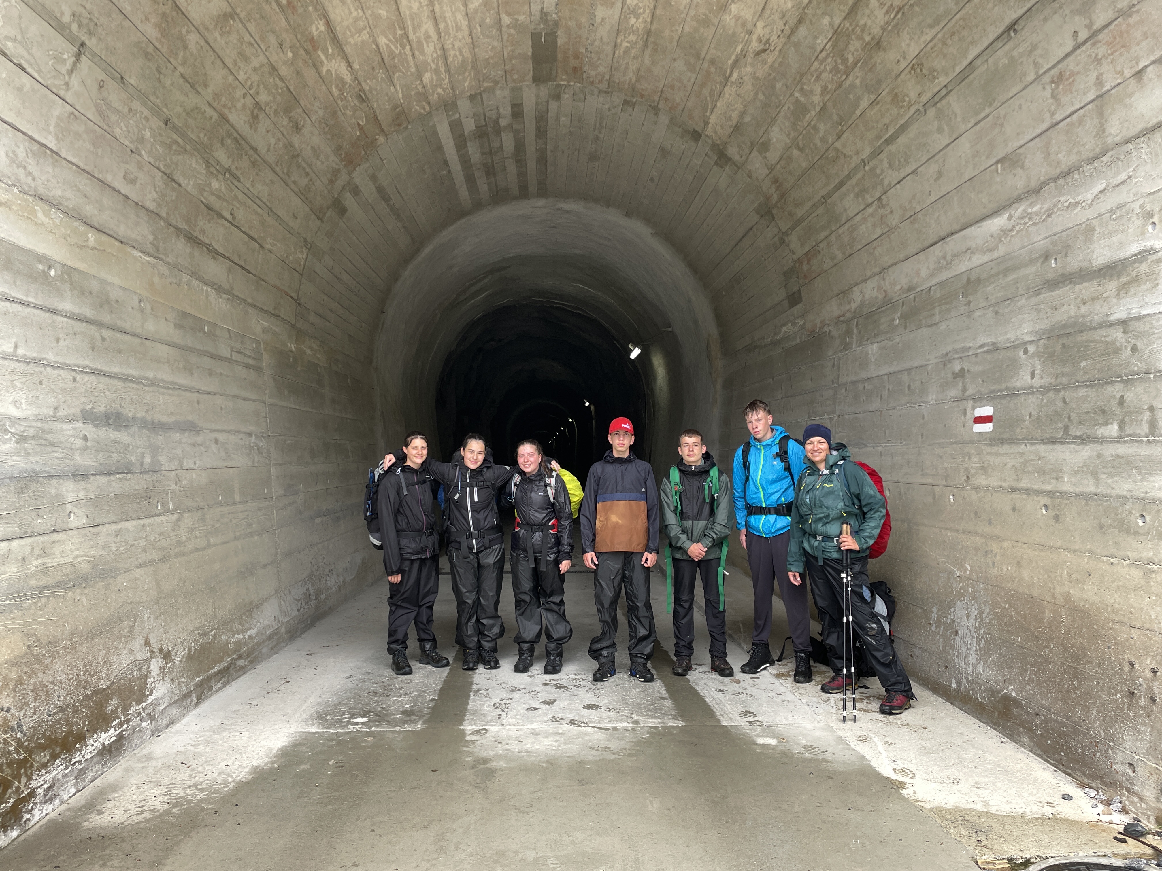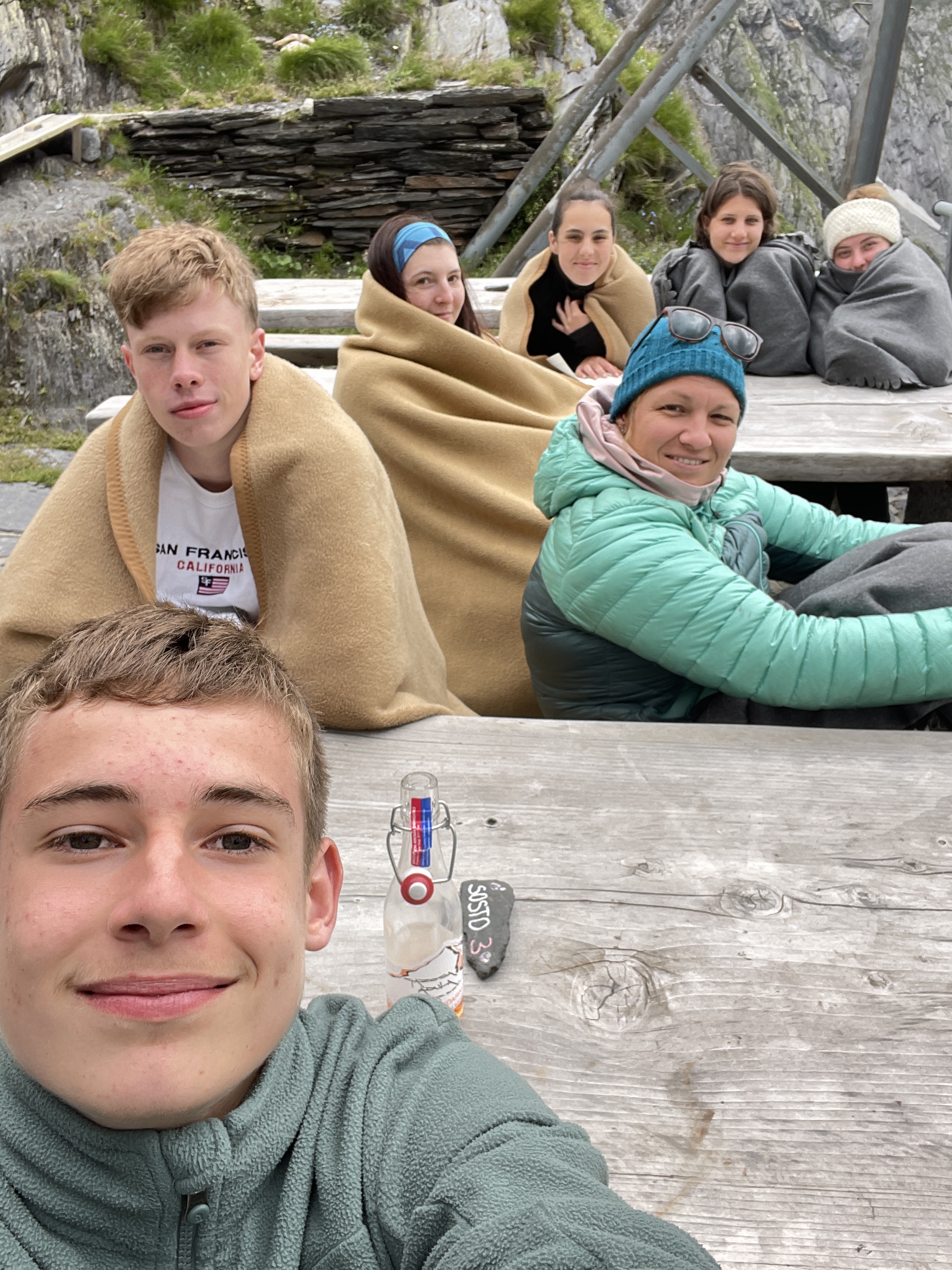 Aufgrund der Wettervorhersagen begann der letzte Tag schon eine Stunde früher als geplant. Auch der morgendliche Toilettengang aufs Plumpsklo, welches sich gleich neben dem Rifugio Scaradra befand, gehörte mit dazu. Um 5:40 Uhr in der Früh liessen sich die Männer der Truppe vom Wecker aus den Matratzen jagen, um Wasser für das Frühstück aufzusetzen. Mit Porridge gestärkt, welches mit Studentenfutter aufgepeppt wurde und wir die ganze Woche mitgetragen hatten, sind wir in den letzten Tag gestartet, welcher einen abenteuerlichen und rutschigen Abstieg mit 1026 Meter Abstieg bereithielt. Seit dem Vortag war uns allen klar, dass die Regenausrüstung nicht umsonst die ganze Woche herumgetragen worden war und so erwies sich der schon steile Abstieg im Regen als noch herausfordernder. Auch wenn schlimmer erwartet, waren die Flussüberquerungen aufgrund der nassen Oberfläche der Steine mit Vorsicht zu bewältigen, weshalb besonders an diesen Stellen darauf geachtet wurde, die Gruppe möglichst dicht beisammenzuhalten. Nicht nur die Flussüberquerungen, sondern auch der übrige Teil des Abstiegs wurde langsam und kontrolliert bestritten. Nach den ersten 580 Höhenmeter hinunter zum Lago di Luzzone war der schlimmste Teil geschafft und die weiteren Kilometer führten uns erstmal gemütlich um den halben See entlang. Unterwegs bot uns ein Tunnel eine kleine Pause vom Regen, wo die Gruppe munteren Gesang von Jona und Malea geniessen durfte, und führte uns anschliessend über die Staumauer. Die treibende Kraft, um die letzten 446 Höhenmeter zu bewältigen, zogen die Trekker*innen aus dem Gedanken, in knapp 2.5 Stunden im warmen und vor allem trockenen Bus sitzen zu können. In Campo angekommen, wurde uns bewusst, dass dieser erst in 1.5 Stunden kommen würde und wir die Zeit bis dahin totschlagen müssen. Noch wichtiger war es also, einen vom Regen geschützten Unterschlupf zu finden. Wir nisteten uns in einem Kuhstalleingang ein, wo sich alle von der nassen Kleidung befreiten, die ersten Fotos austauschten und der restliche Proviant aufgegessen wurde. Als dann der Zeitpunkt des Aufbruchs gekommen war, fing es undankbarer Weise wiederholt an zu Regnen und die Ankunft des Buses wurde umso sehnlicher erwartet.