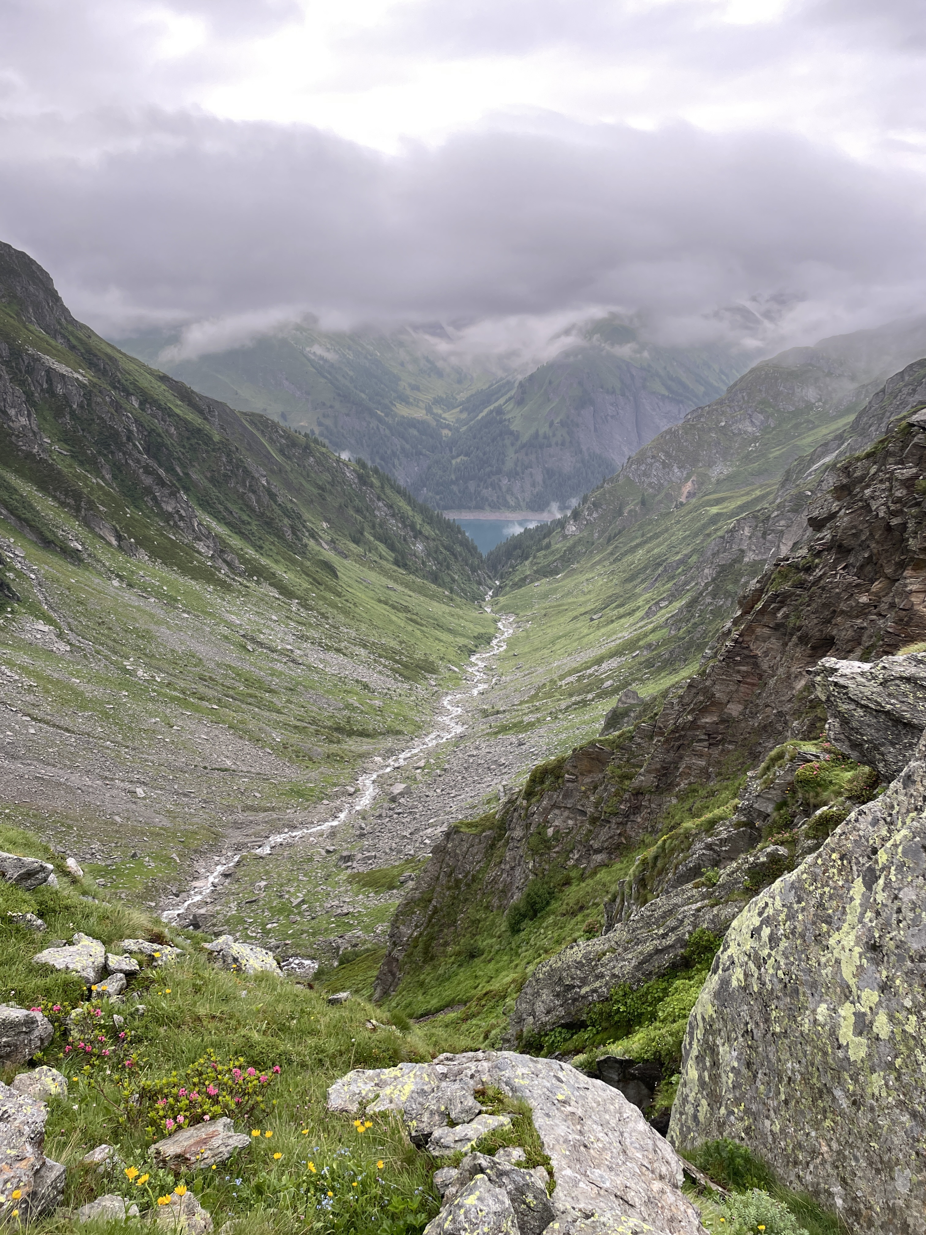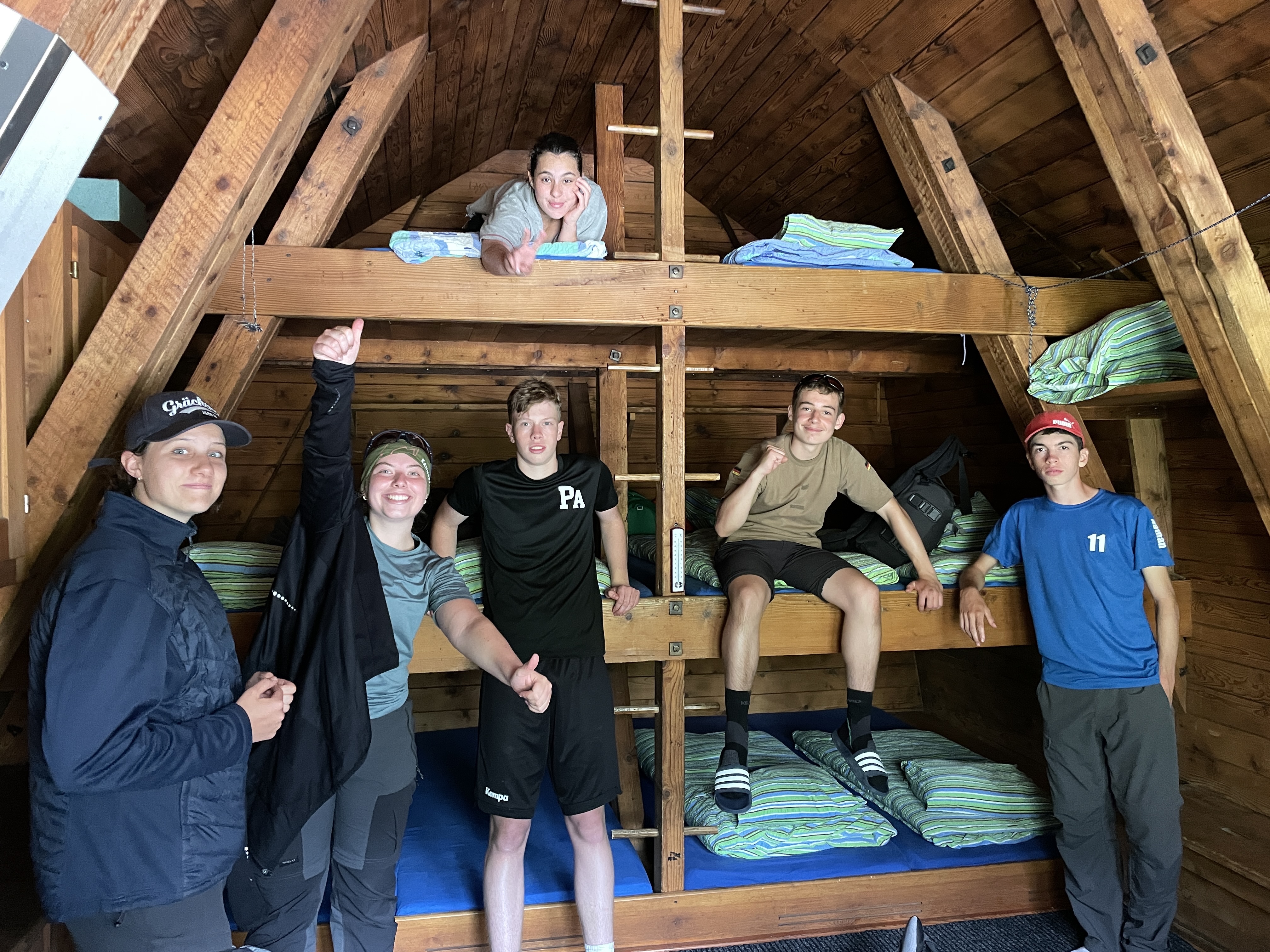 “Put the Lime in the Coconut” ertönte es um 7.00 Uhr und wir krochen aus unseren Hüttenschlafsäcken. Natürlich blieben die Jungs noch eine halbe Stunde im Bett liegen, schafften es aber dennoch rechtzeitig an den Frühstückstisch. Nach einem grossen Frühstück und einer kräftigen Ovi standen wir bereit für die heutige Wanderung. Diese fing, zur Abwechslung, nicht gemütlich an, sondern gleich mit einem eher steilen Aufstieg über Schneefelder zum Passo della Greina an. In der spektakulären Greine Ebene entschieden wir uns für einen kleinen Umweg zu einem natürlichen Steinbogen. Drei von uns stiegen zum Steinbogen hinauf und machten dort Bekanntschaft mit zwei Murmeli, welche uns bis auf einen halben Meter heranliessen. Nach einer weiteren Stunde durch die schöne, und sehr abwechslungsreiche Greine Ebene, begleitet von zunehmendem Nebel, erreichten wir die im Nebel kaum sichtbare Motterasciohütte, in welcher wir vor der klammen Luft Zuflucht suchten und unser Lunchpaket verspeisten. Die Hüttenbewirtschafterinnen erlaubten uns nicht nur, ihrem Essraum für unser Mittagessen zu nutzen, sondern stellten sich auch als fabelhafte Bäckerinnen heraus, was zu einem Dessert aus Linzertorte, Marroni- und Rüeblikuchen führte. Dort bunkerten wir auch gleich weitere 8 Stück Kuchen, welche es später nach dem Abendessen geben würde. Nach einem zügigen Abstieg, ganz im Trailrunning Tempo, gelangten wir zum Lago di Luzzone. Trotz des bewölkten Himmels war die petrolene Farbe des Sees beeindruckend. Nach einem flachen Stück entlang des Stausees ging es auch gleich wieder bergauf: Zuerst supersteil, von 0 auf 100 sozusagen, dann etwas flächer, wobei sich «etwas» mittlerweile als relativer Ausdruck etabliert hat, und dann wieder sehr steil. Das letzte, extrem steile, an einer Stelle mit Ketten gesicherten Stück bestritten wir langsam, vorsichtig und gemeinsam. Nach mehreren kleinen Pausen erreichten alle erschöpft die Alpe Scaradra, auf welcher sich unser Rifugio für die Nacht befand. Die Hütte war eine traditionelle Tessiner Steinhütte, mit einem Koch-, bzw. Aufenthaltsraum, und einem Schlafraum gleich unter dem Dach. Die obligatorische Katzenwäsche bestritt jede*r entweder im Brunnen oder im nahe gelegenen Bergbach. Um die Hütte etwas gemütlicher zu machen und den Kleidern die Möglichkeit zu geben, bis zum nächsten Tag zu trocknen, wollten wir im Holzherd anfeuern und verrauchten zunächst einmal die ganze Hütte. Doch nach einer Weile brannte das Feuer und in der Hütte wurde es wärmer. Nach dem Abendessen gab es noch ein gemeinsames UNO Spiel.