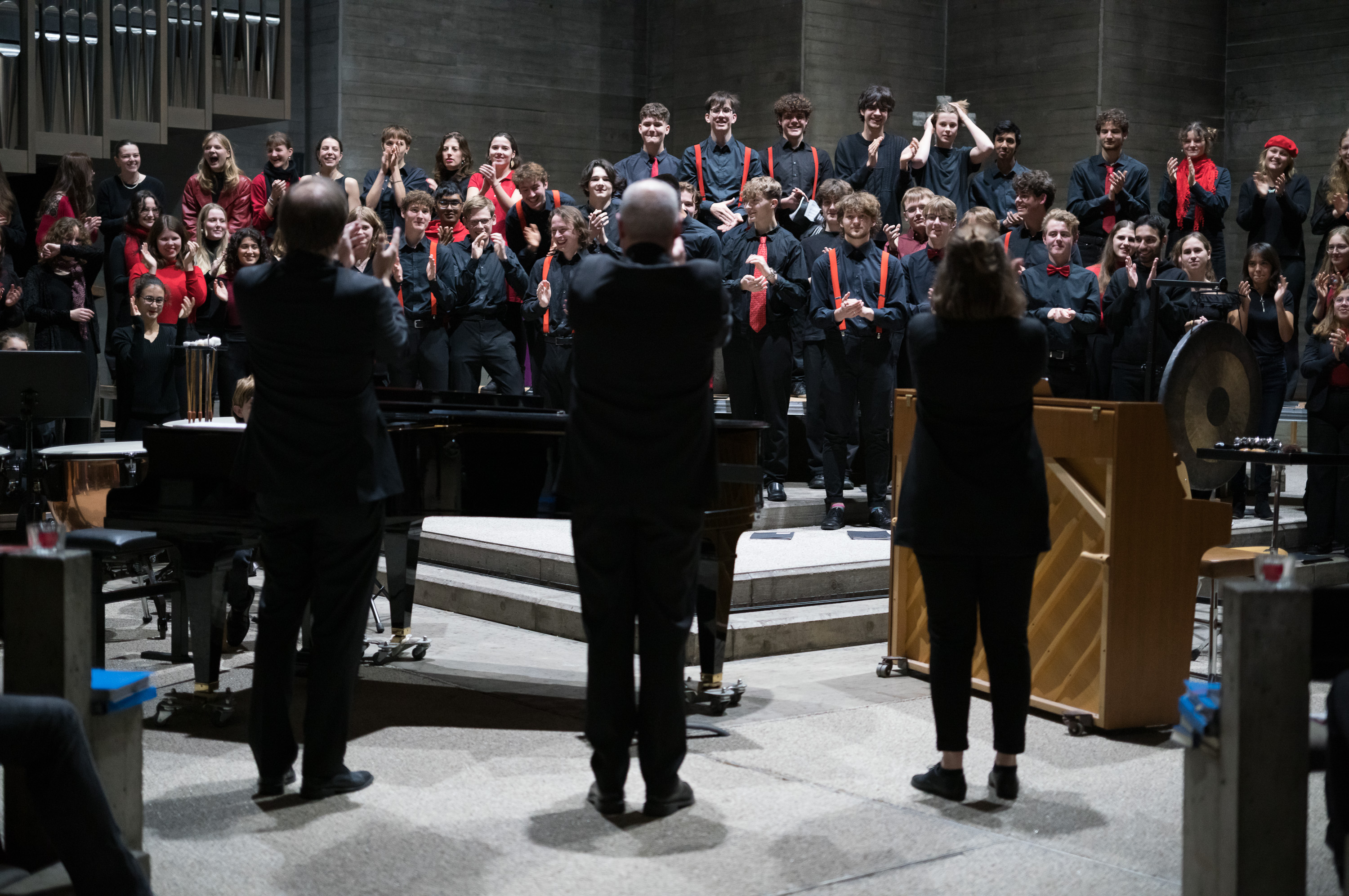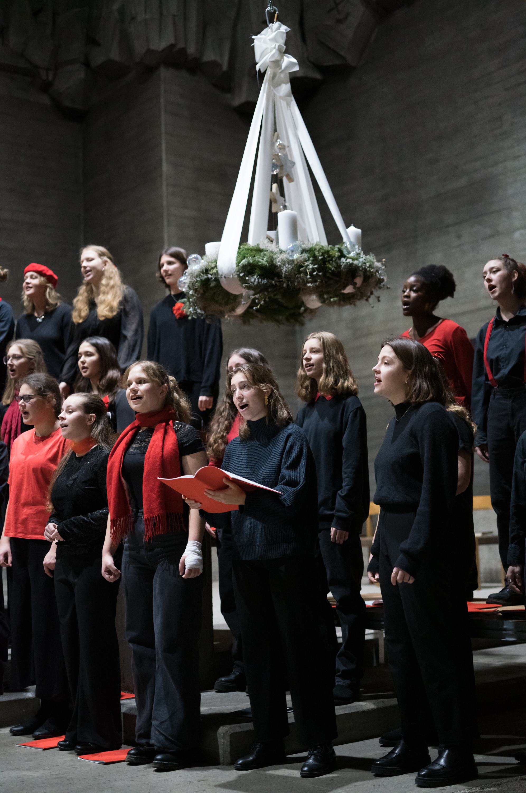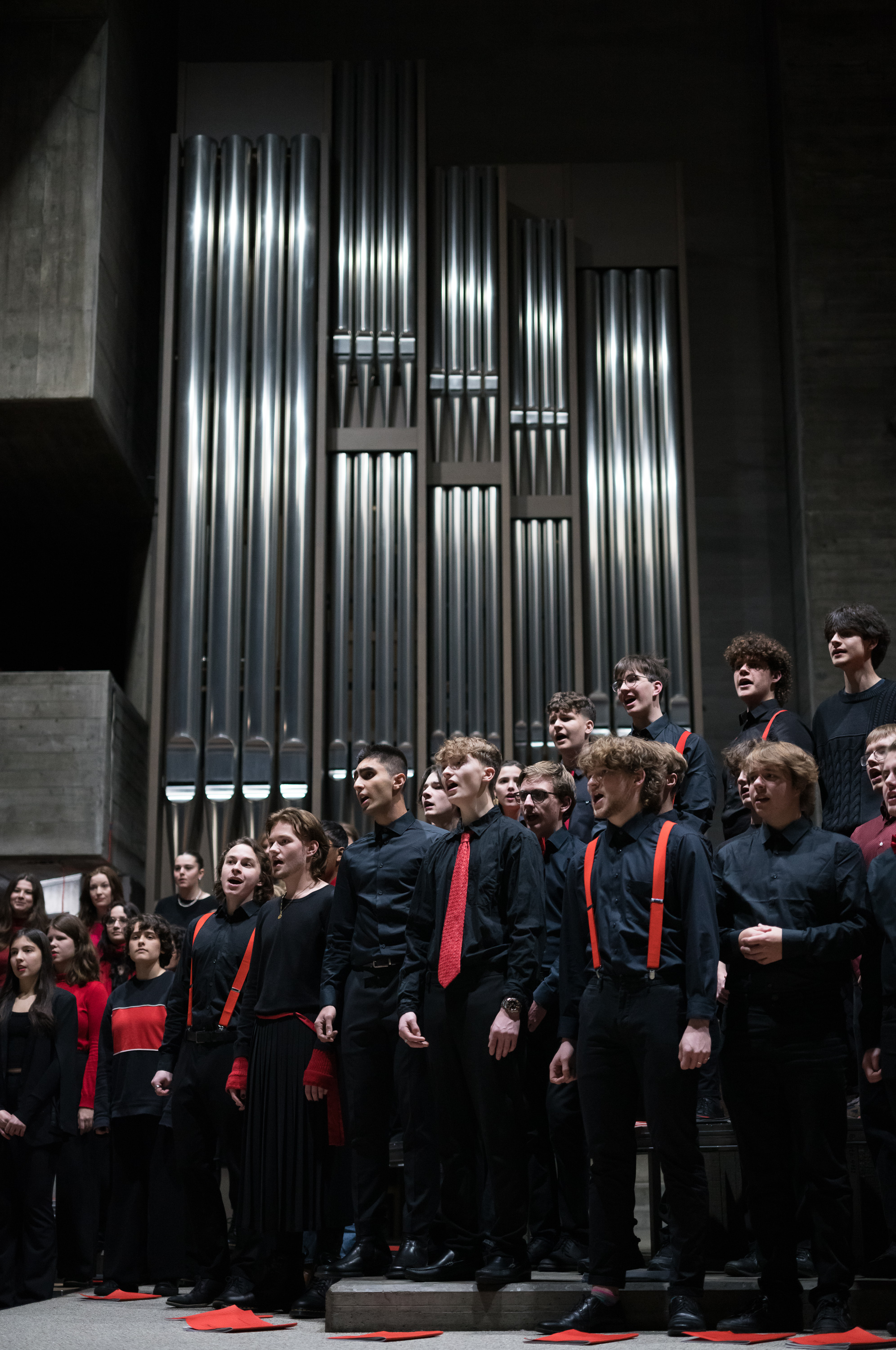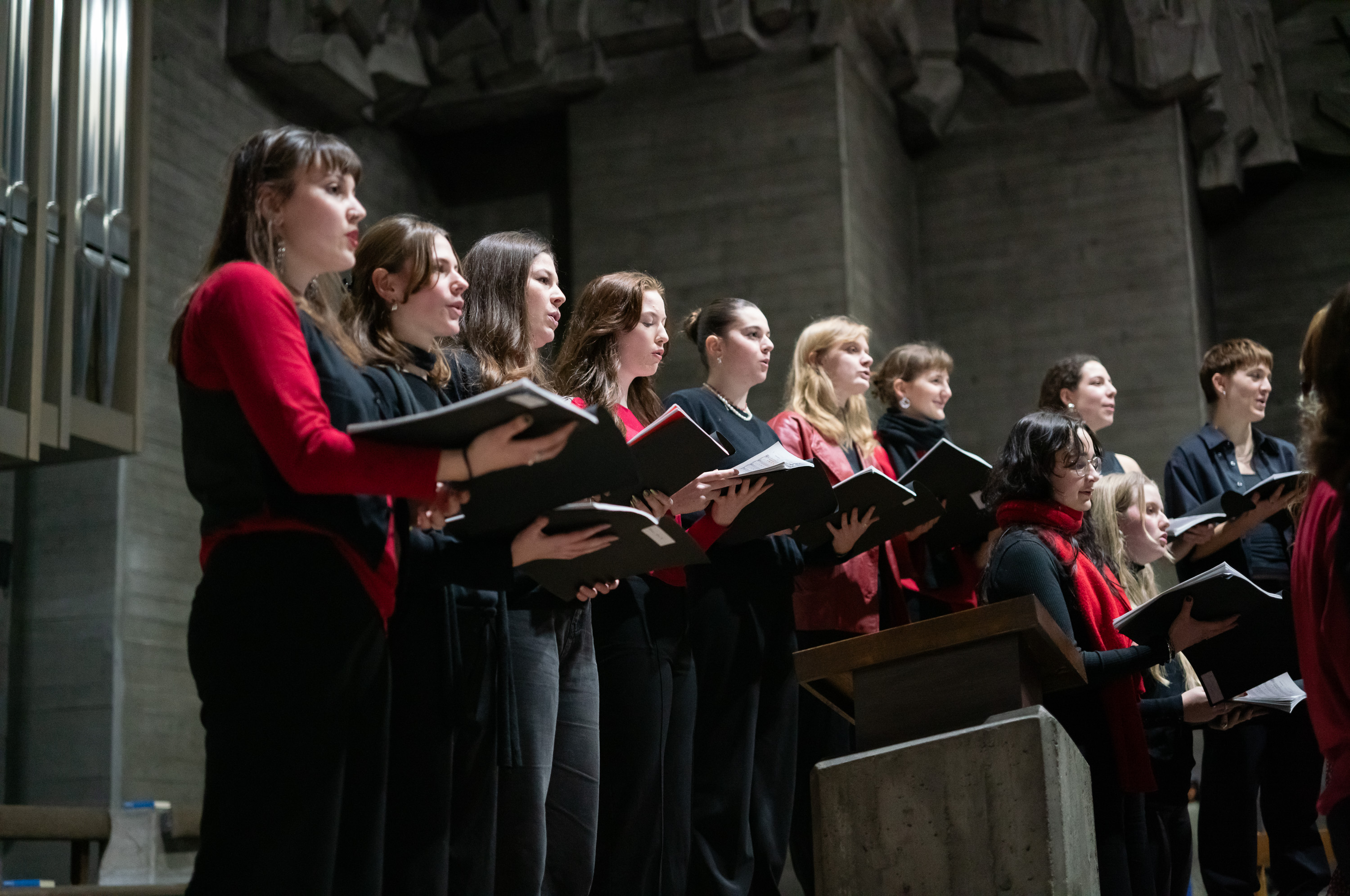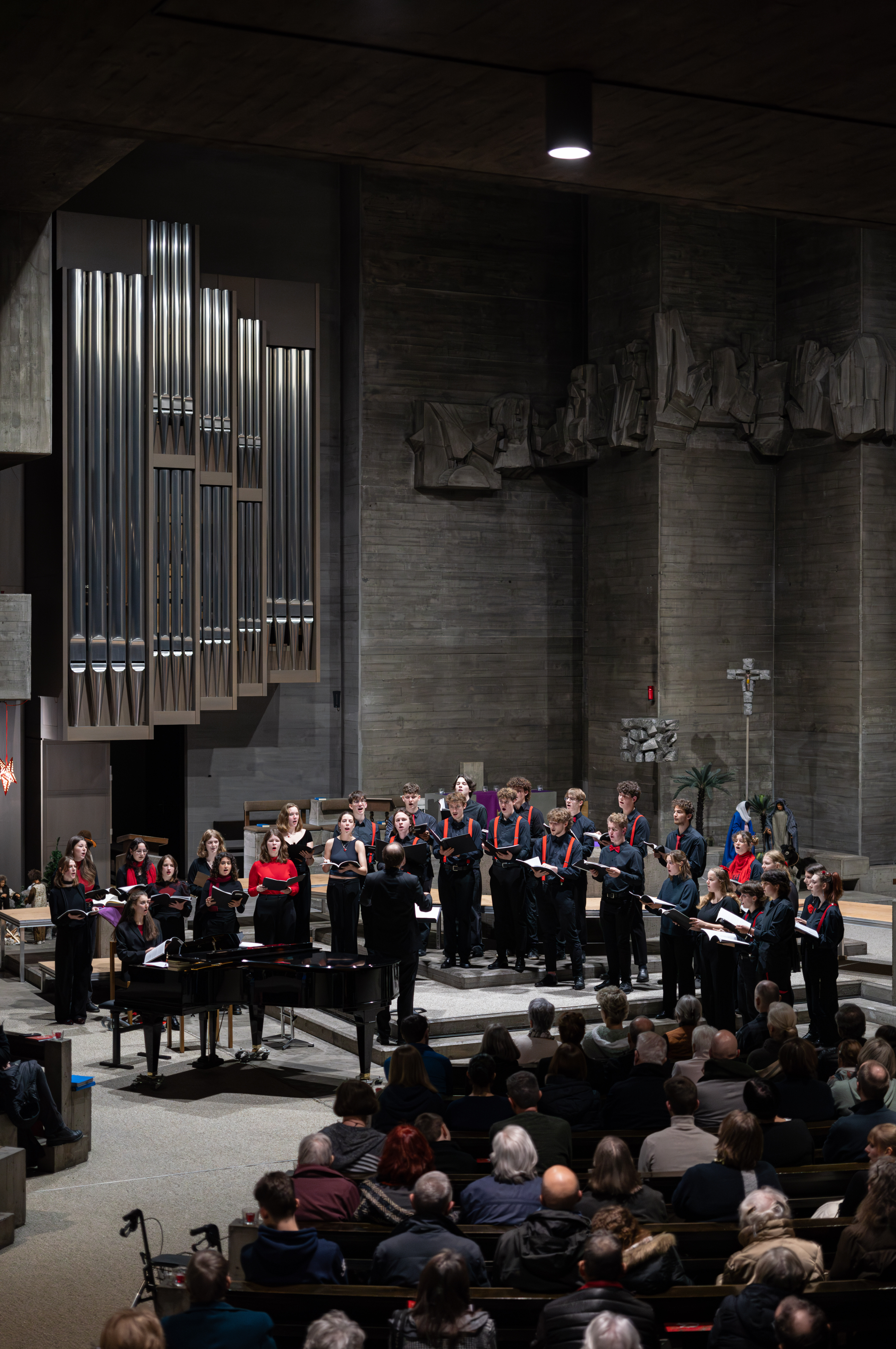 Nach den Beiträgen der Solistinnen starten wir zum Finale: Für die „Carmina Burana“ stimmen wir dramatisch ein hallendes „O Fortuna“ an. Das neoklassische Werk von Carl Orff, das der Chor bereits im Stadtcasino präsentiert hat, entfaltet in der Beton-Architektur der katholischen Kirche eine gänzlich neue Wirkung. Das Echo verleiht dem Gesang einen beinahe ausserweltlichen Effekt. Nach knapp zwei Stunden endet das diesjährige Weihnachtskonzert mit dem Mundart-Klassiker „W. Nuss vo Bümpliz“, und auf der Bühne ist es schön zu sehen, wie einzelne Zuschauerinnen und Zuschauer mitsingen.