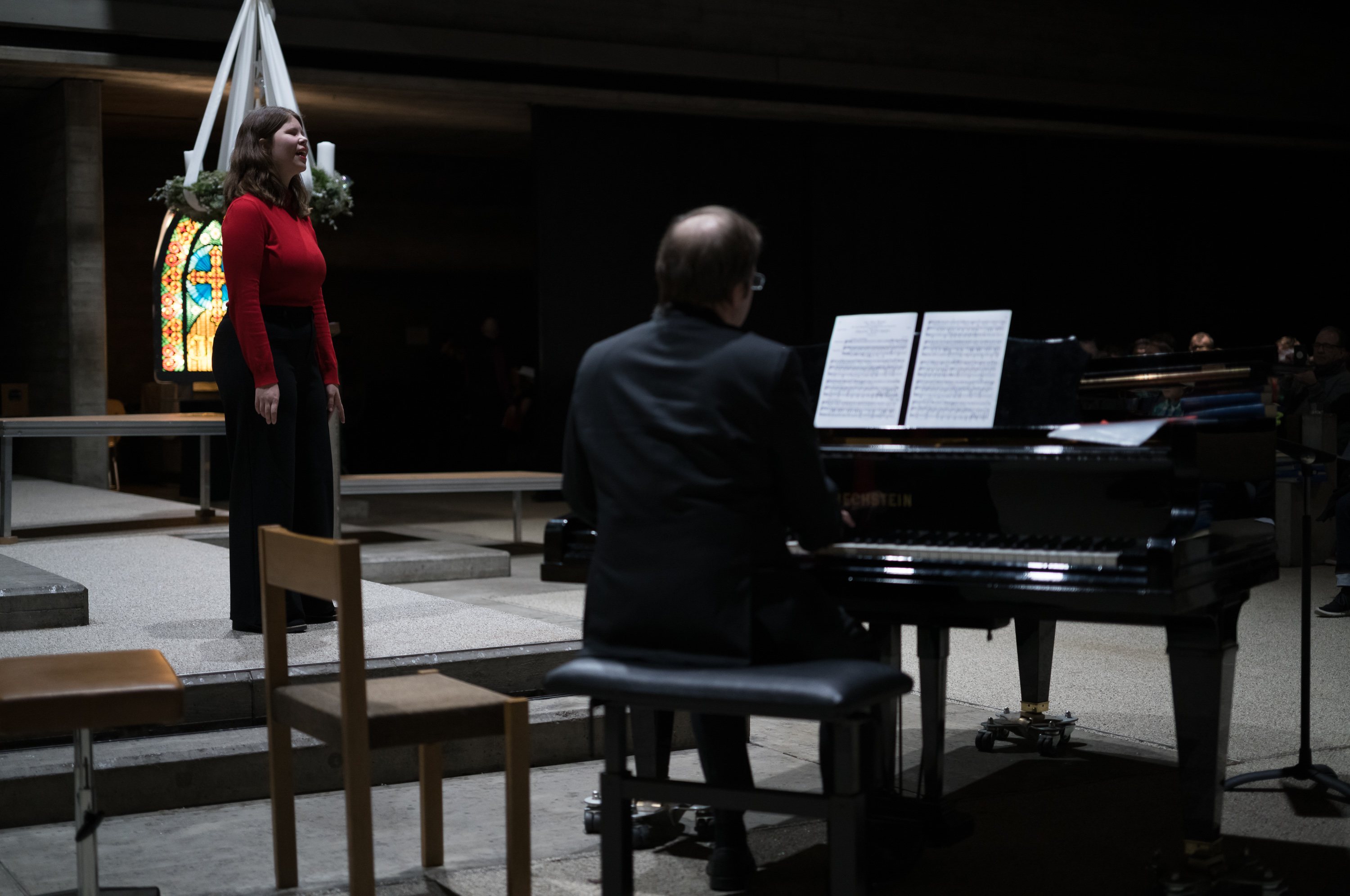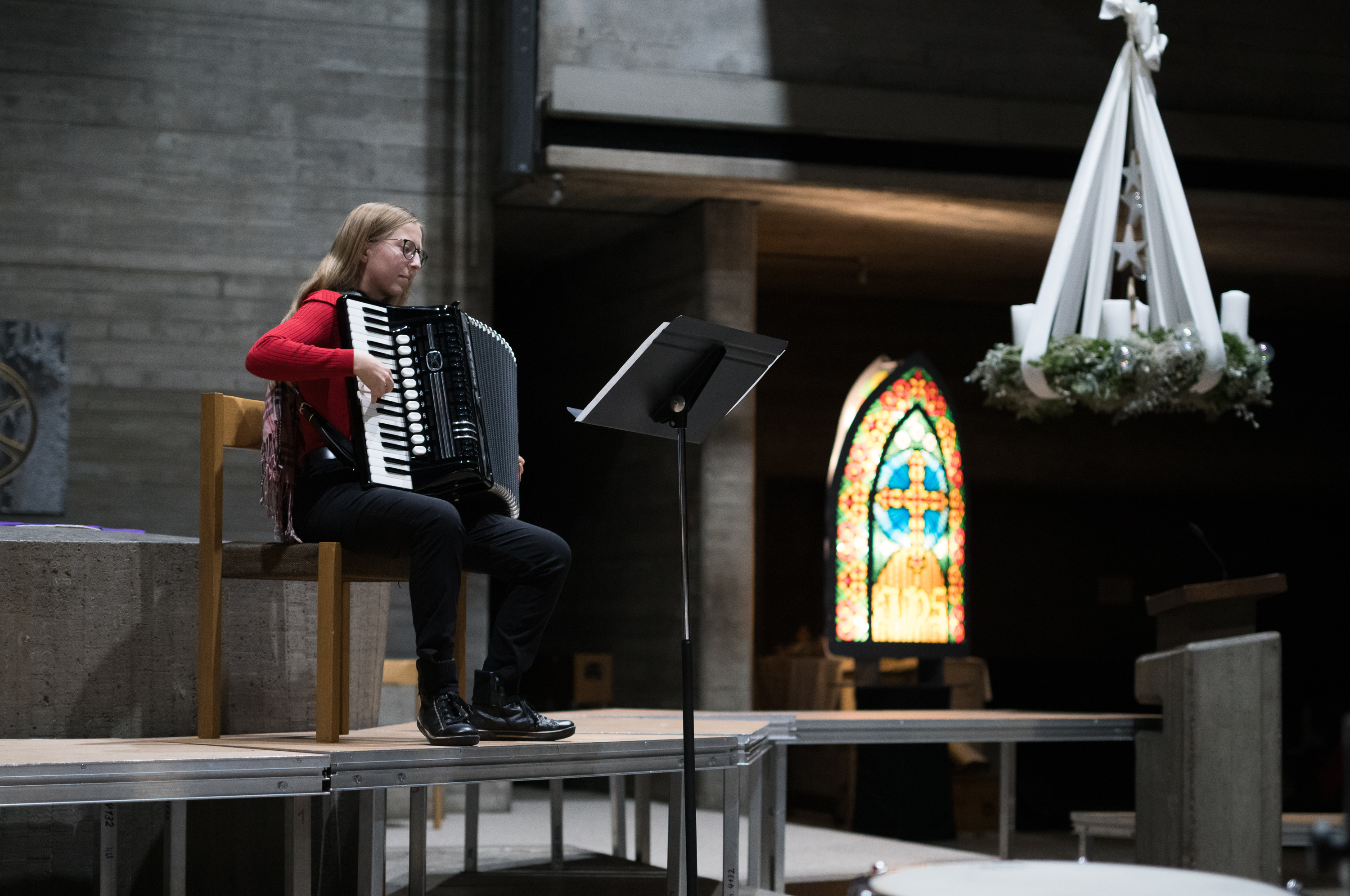 Auf der Bühne selbst muss man aufpassen, nicht zu sehr von den Emotionen mitgerissen zu werden. Sobald die anfängliche Nervosität abklingt, taucht man in einen regelrechten Fluss von Gefühlen ein. Nach dem Auftritt des grossen Chors präsentiert der Kammerchor Weihnachtslieder aus aller Welt, unter anderem zwei Versionen des Stückes „O Heiland, reiss die Himmel auf“. Tuula Wittstich verzaubert das Publikum mit einem berührenden Lied „An den Mond“ von Franz Schubert, und auch Elina Umbricht präsentiert ein wunderschönes Stück auf dem Akkordeon.