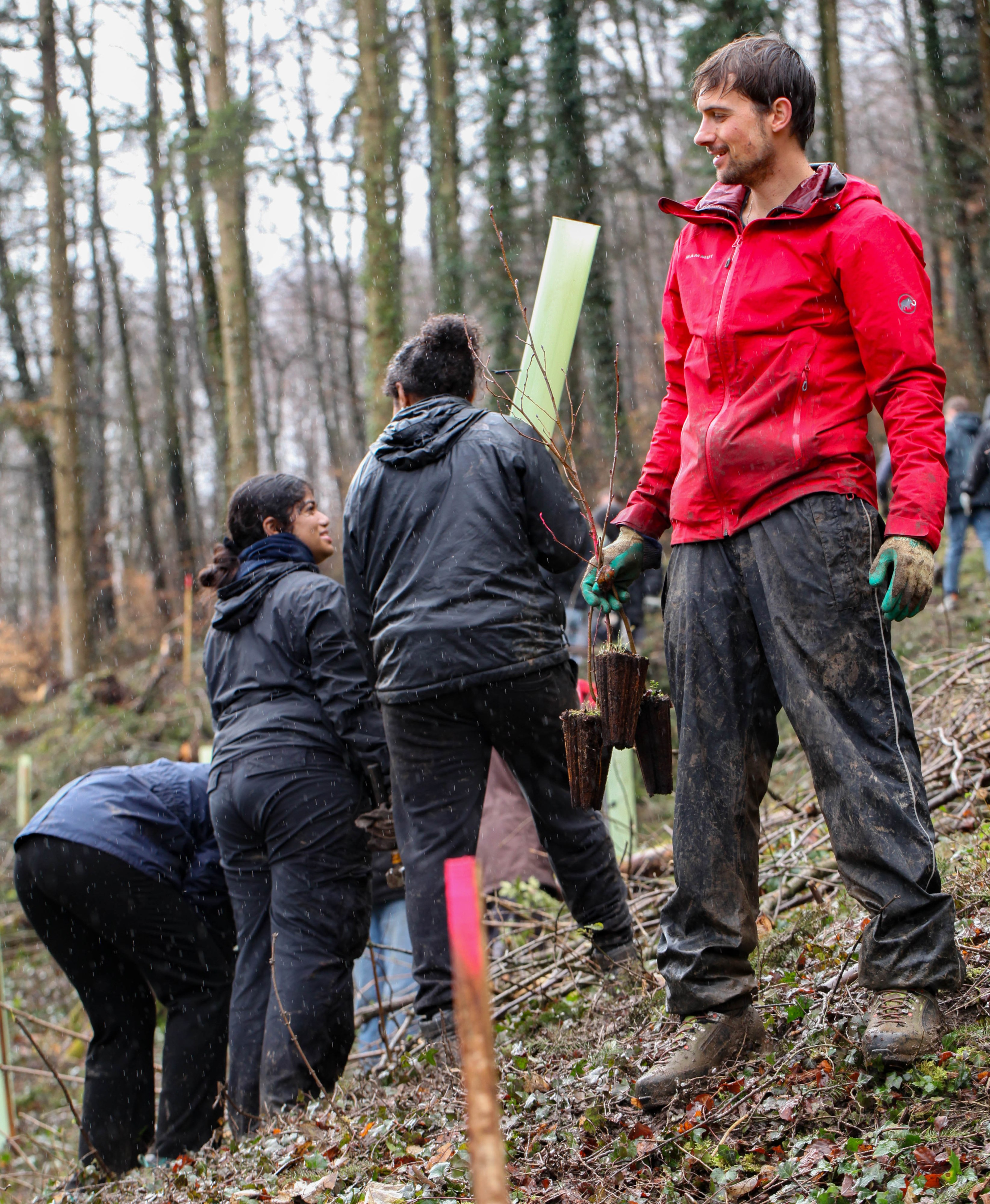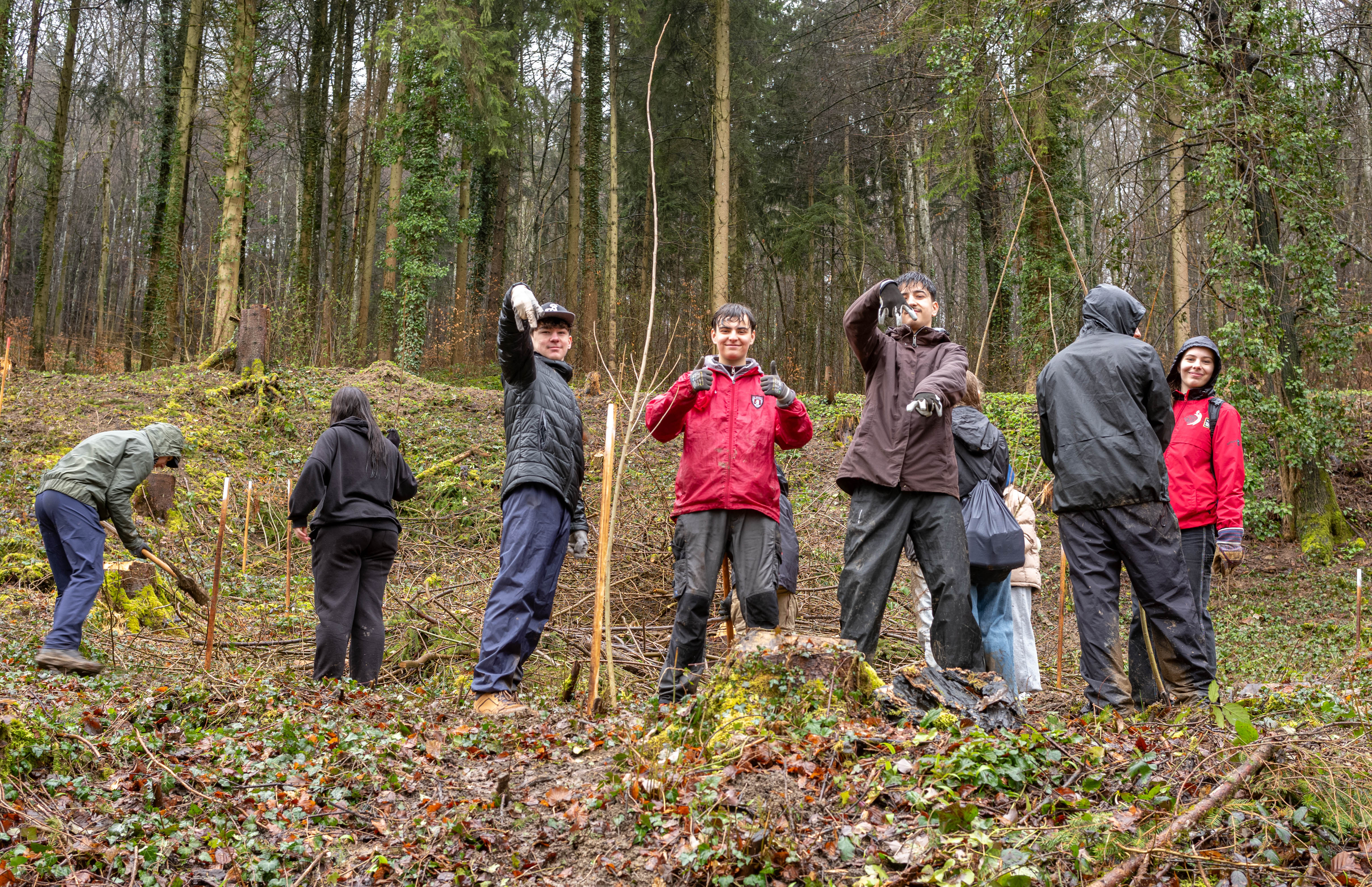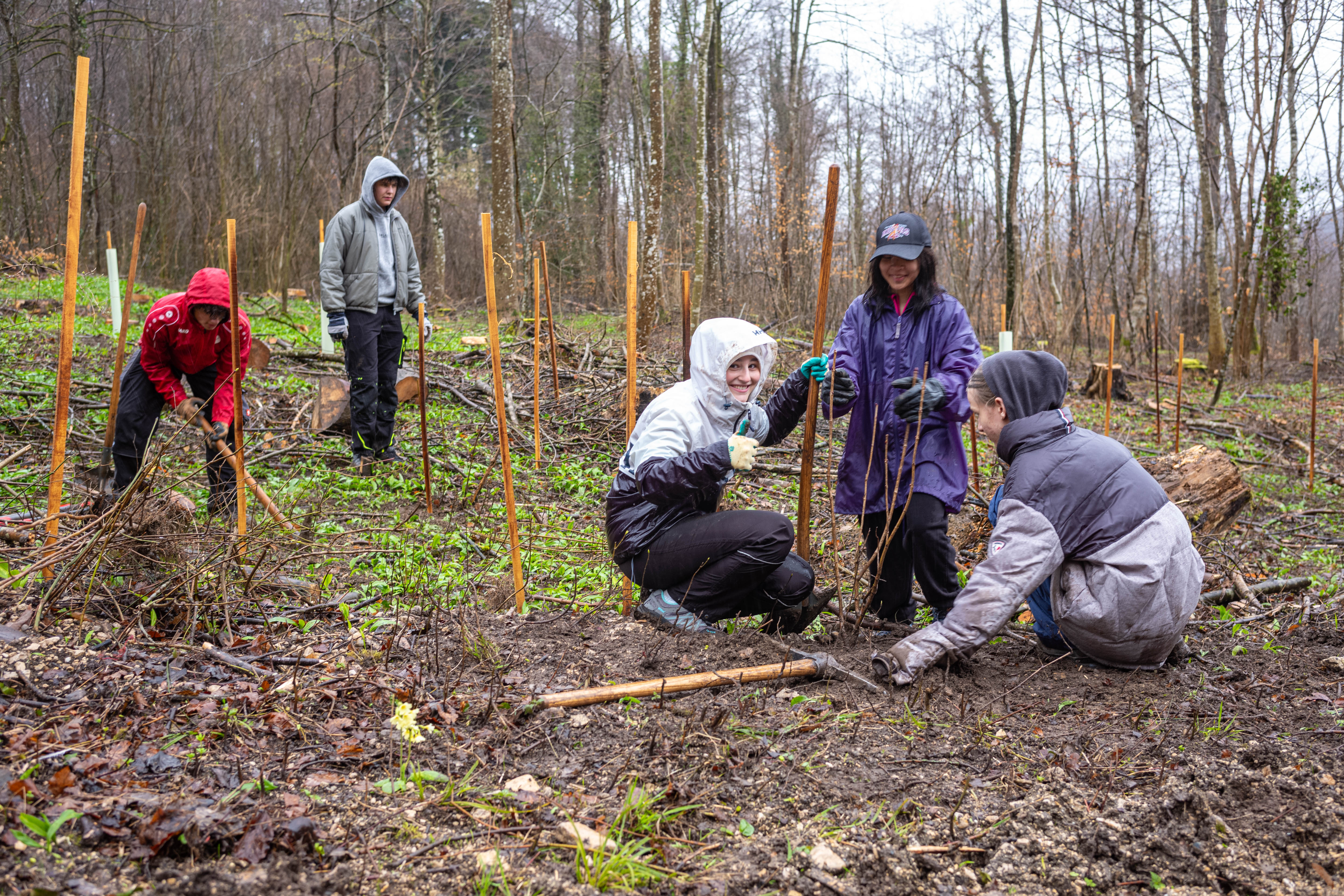 Zum Znüni gab es ein wohlverdientes Schoggiweggli, das für ausreichend Energie sorgte, um nach der Pause den zweiten Teil der anstehenden Arbeiten anzugehen. Der Regen wurde schwächer und unsere Schüler:innen pflanzten Jungbäume resilienter Arten, wie z.B. der Pappel oder Eiche, und versahen sie mit einem Schutz, damit sie nicht von hungrigen Rehen gefressen werden.