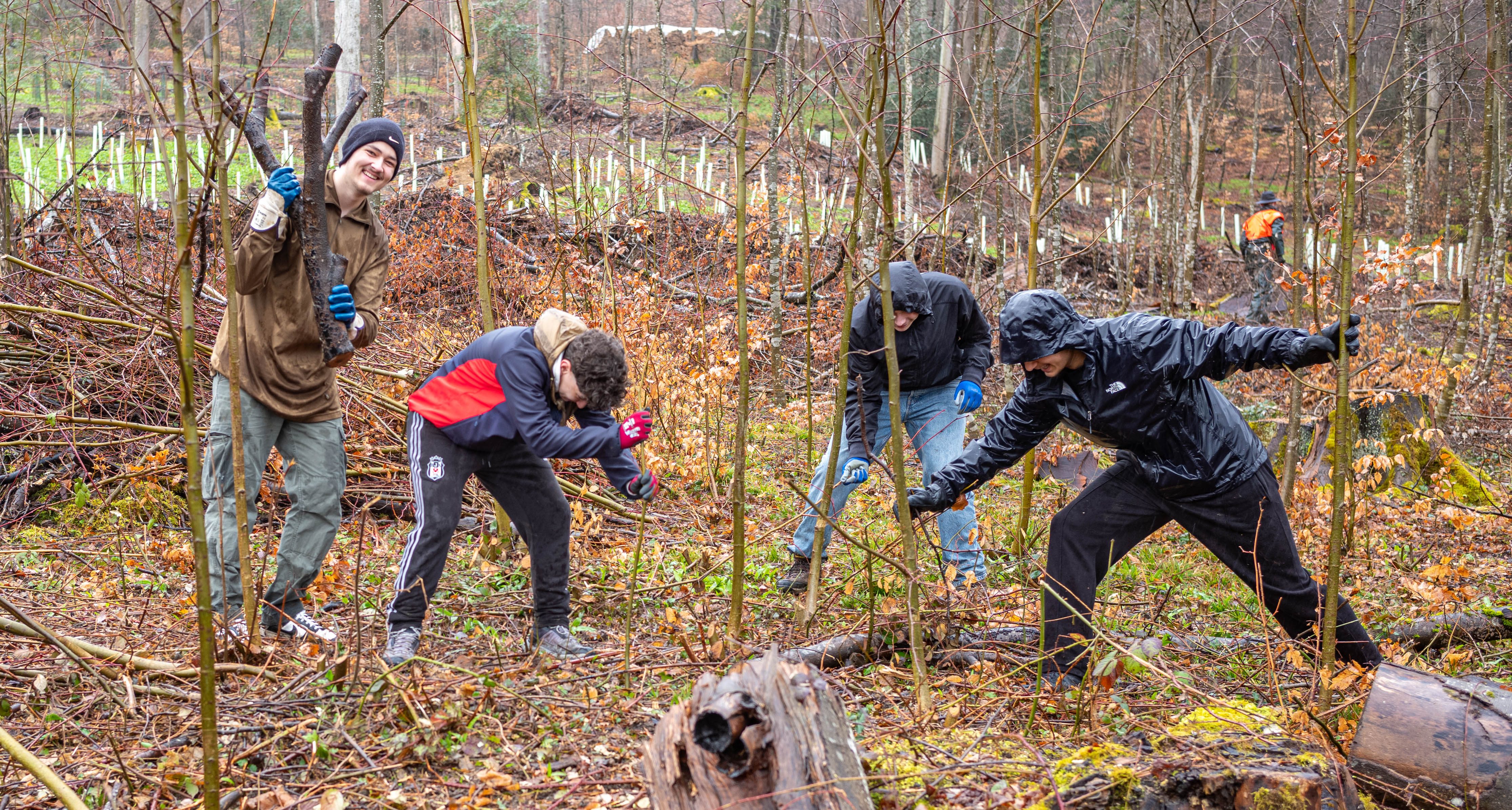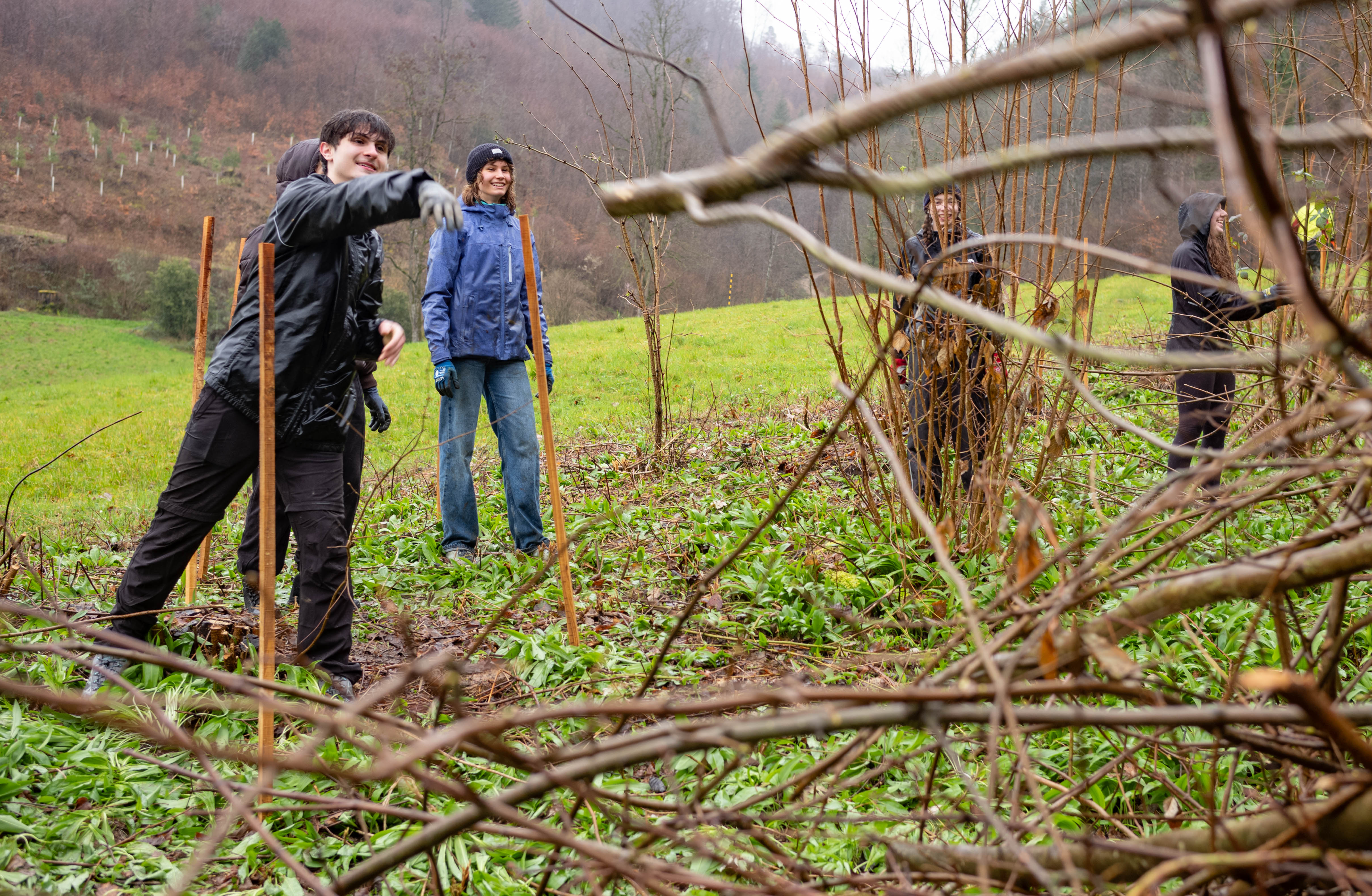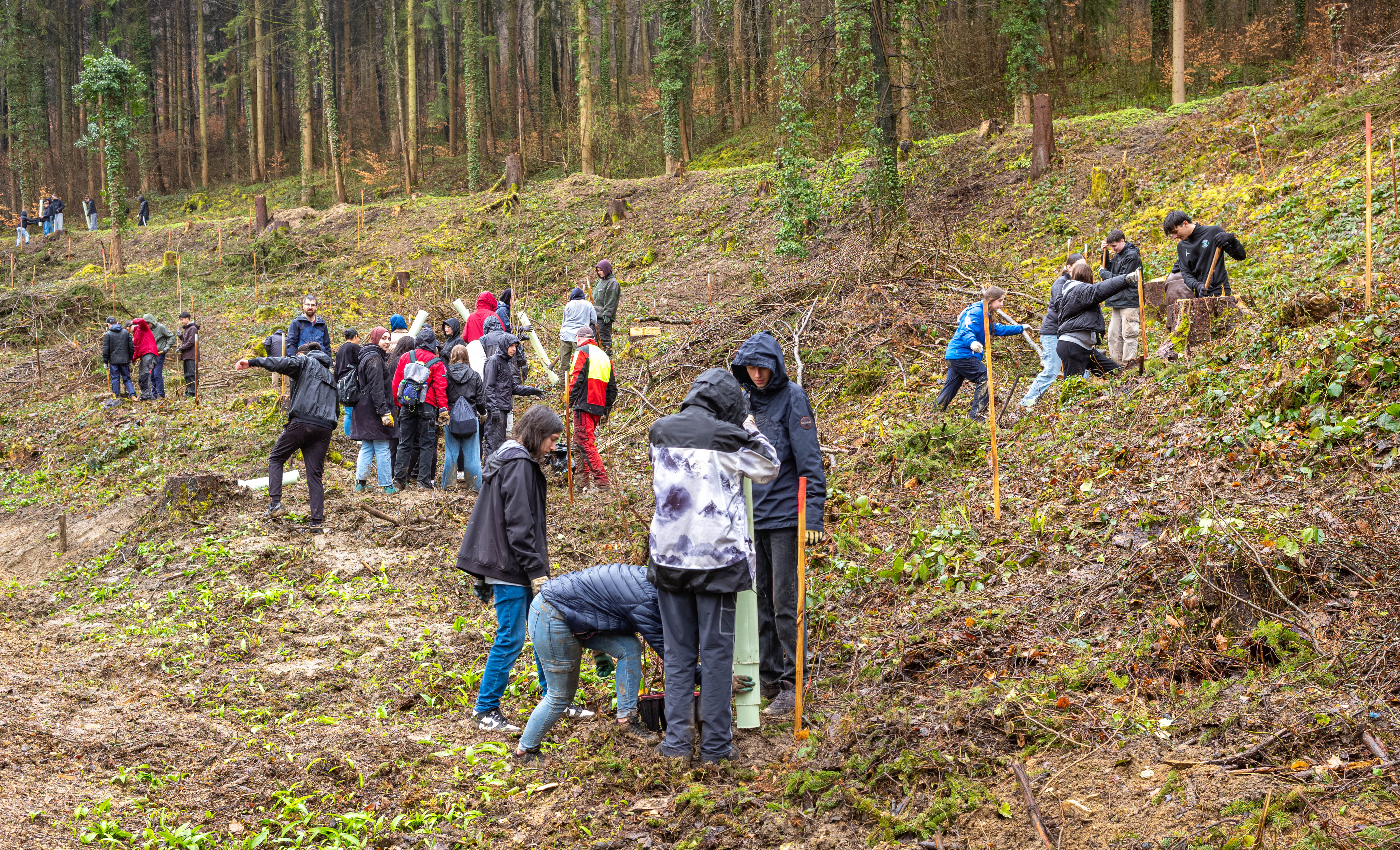 Zum Znüni gab es ein wohlverdientes Schoggiweggli, das für ausreichend Energie sorgte, um nach der Pause den zweiten Teil der anstehenden Arbeiten anzugehen. Der Regen wurde schwächer und unsere Schüler:innen pflanzten Jungbäume resilienter Arten, wie z.B. der Pappel oder Eiche, und versahen sie mit einem Schutz, damit sie nicht von hungrigen Rehen gefressen werden.